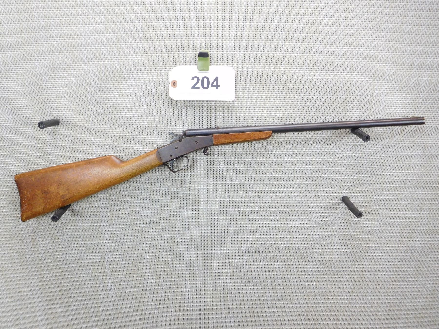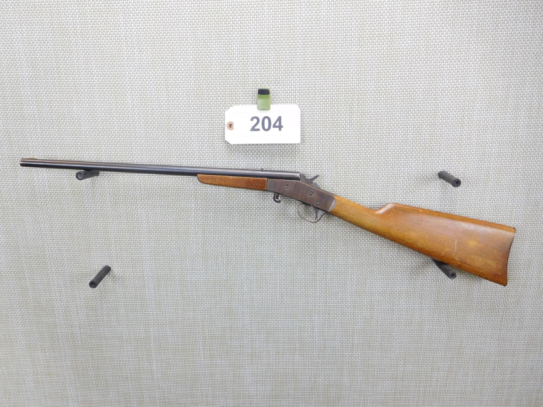 TAKEDOWN MODEL, SLING LOOPS, STEEL BUTT PLATE, RETAINS SOME ORIGINAL CASE HARDING ON THE RECEIVER, DOVETAILED REAR AND BLADE FRONT SIGHT, BORE IS EXELLENT, CRISP ACTION, WOOD FINISH IS SLIGHTLY WORN WITH MINOR DINGS , ACTION: SINGLE SHOT BREAK ACTION RIFLE , BARREL LENGTH: 18" , STOCK # 7096 , SERIAL # N/A , CONDITION: 7/10 , CLASS: CANADIAN NON RESTRICTED CLASS