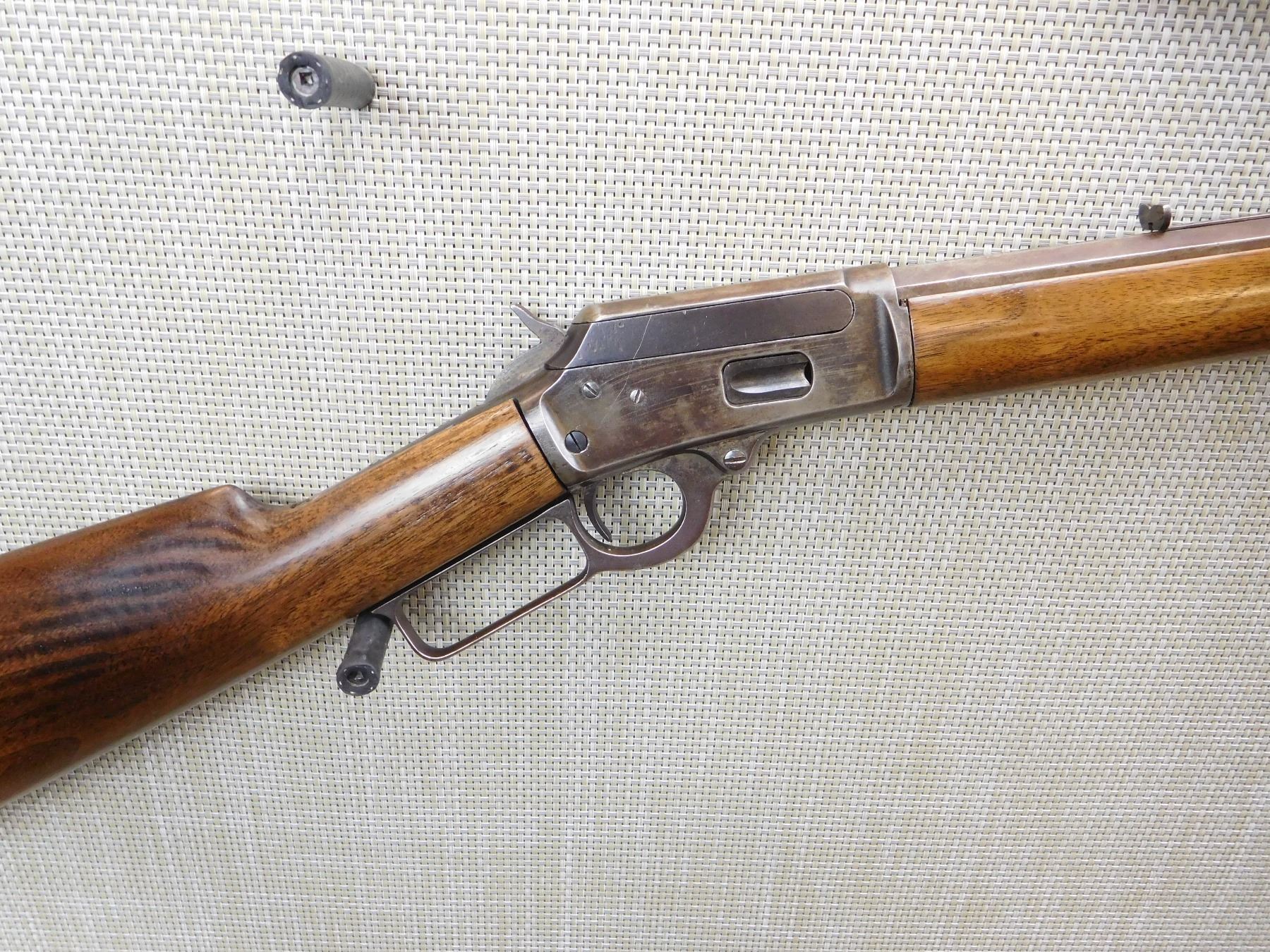 DOVETAILED FRONT AND MISSING THE REAR ELEVATOR ON THE SIGHT, RECEIVER IS DRILLED AND TAPPED FOR A SCOPE, OCTAGONAL BARREL, BORE IS DARK, CARBINE BUTT STYLE BUTT PLATE, APPEARS TO BE REFINISHED WOOD, 50% BLUEING REMAINING , ACTION: LEVER ACTION RIFLE , BARREL LENGTH: 24" , STOCK # 7099 , SERIAL # 363709 , CONDITION: 7/10 , CLASS: CANADIAN NON RESTRICTED CLASS