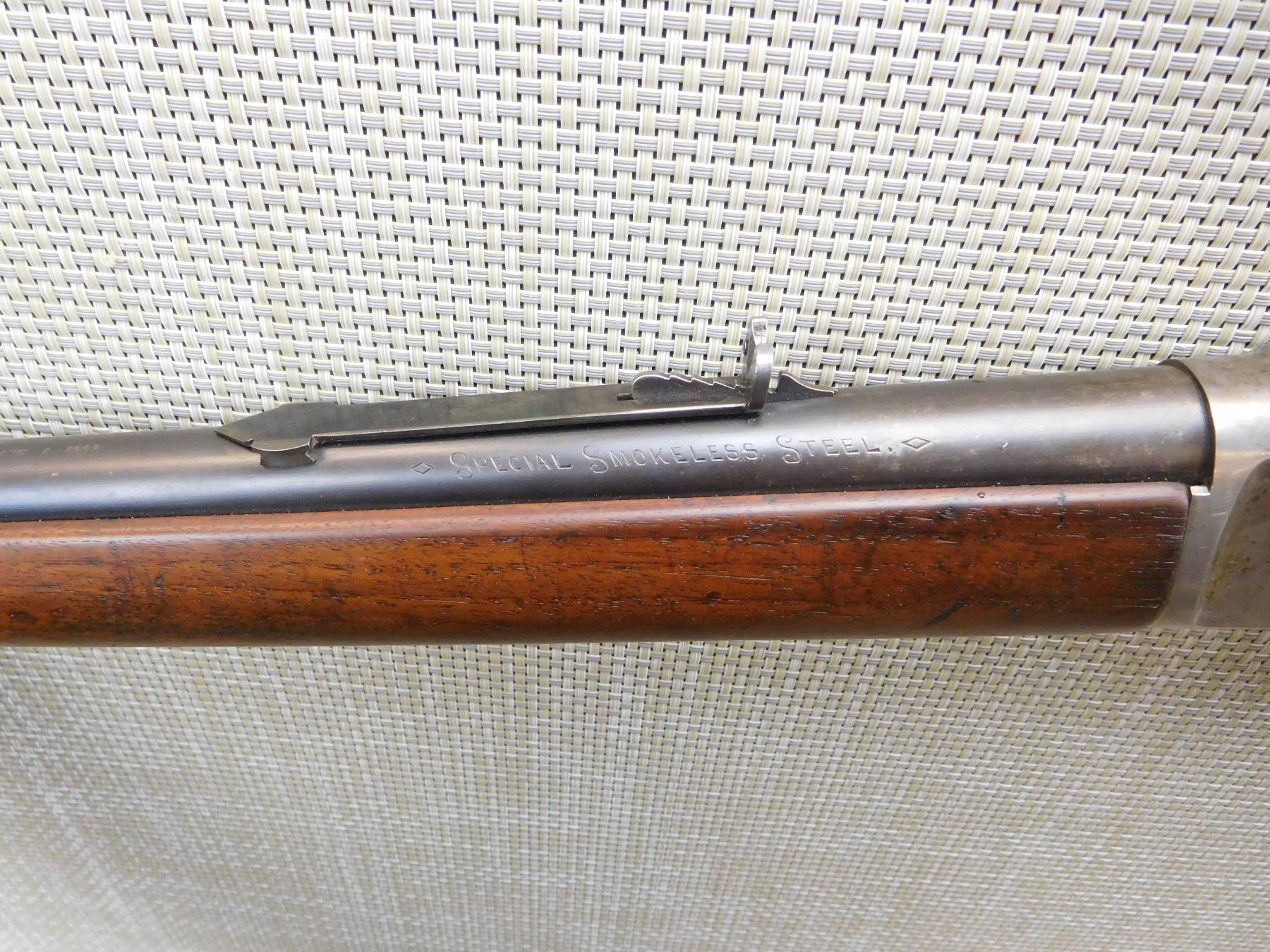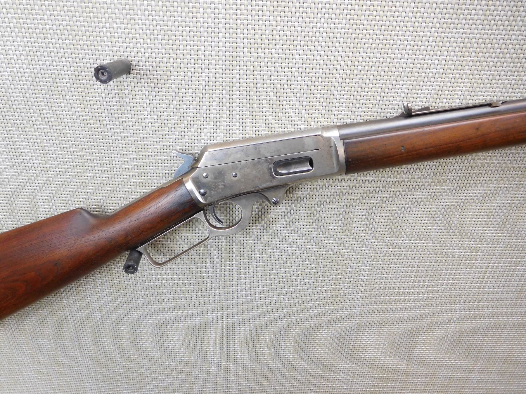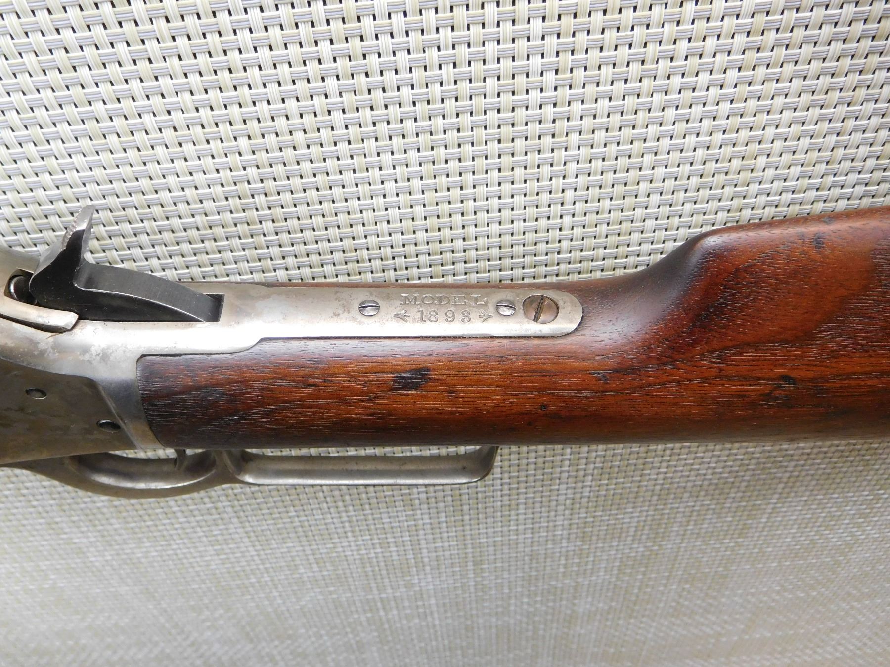 BLADE FRONT AND ADJUSTABLE BUCKHORN REAR SIGHTS, ROUND BARREL RIFLE, CARBINE BUTT, NICE ORIGINAL WOOD, RETAINS LIGHT CASE HARDENING ON THE RECEIVER, BORE IS GOOD , ACTION: LEVER ACTION RIFLE , BARREL LENGTH: 26" , STOCK # 7103 , SERIAL # 405872 , CONDITION: 7/10 , CLASS: CANADIAN NON RESTRICTED CLASS