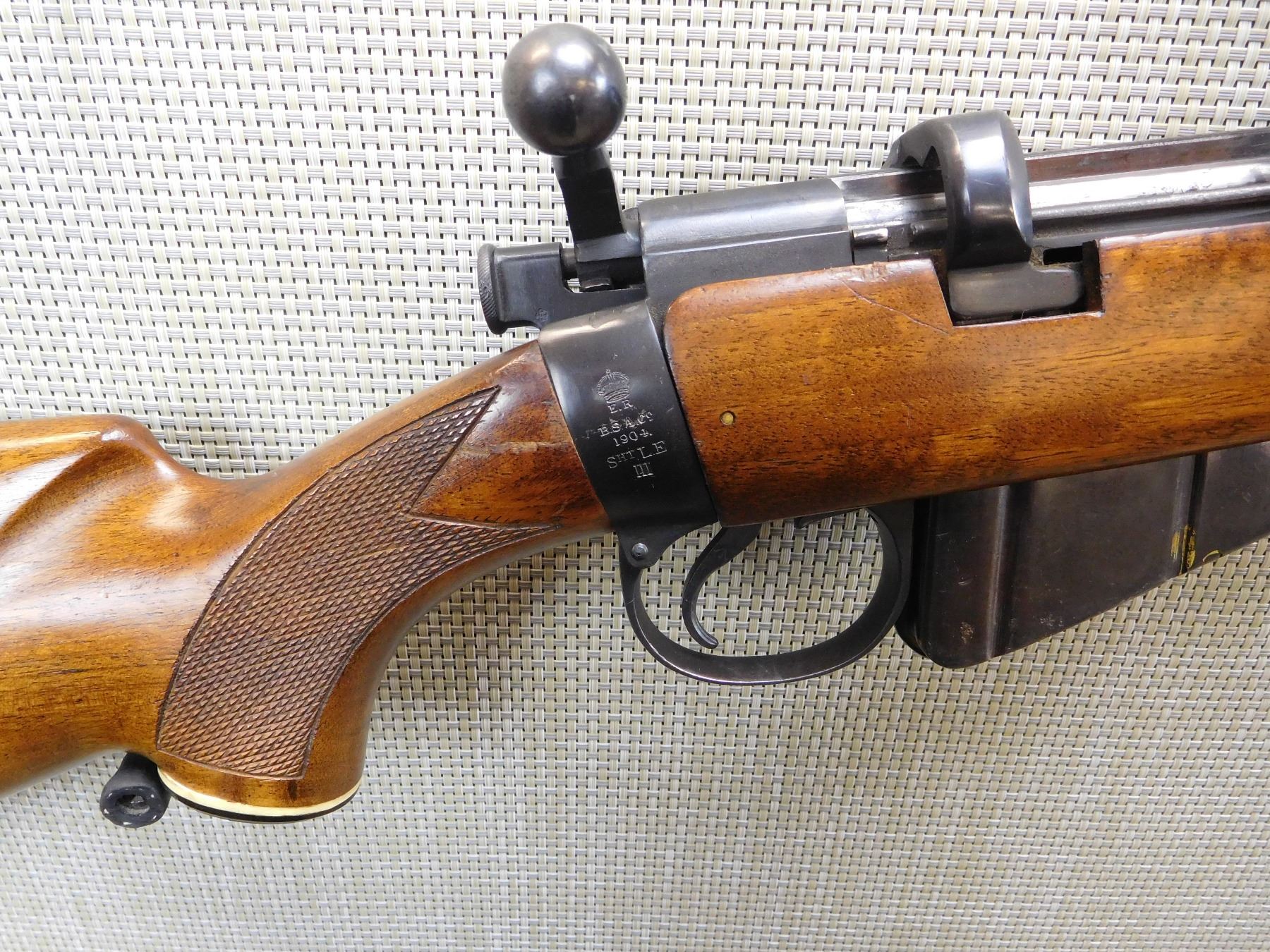 COMES WITH MAGAZINE, SPORTERIZED BY COGSWELL & HARRISON, ORIGINALLY MANUFACTURED AS A BSA SHORT LEE MKIII DATED 1904, CAPPED FOREND AND FULL PISTOL GRIP MONTE CARLO BUTT STOCK, RETAINS ORIGINAL MILITARY REAR SIGHT HAS DOVETAILED RAMP FRONT SIGHT, SLING SWIVEL STUDS, BORE IS EXCELLENT , ACTION: BOLT ACTION RIFLE , BARREL LENGTH: 23 1/2" , STOCK # 7119 , SERIAL # 7417 , CONDITION: 8/10 , CLASS: CANADIAN NON RESTRICTED CLASS