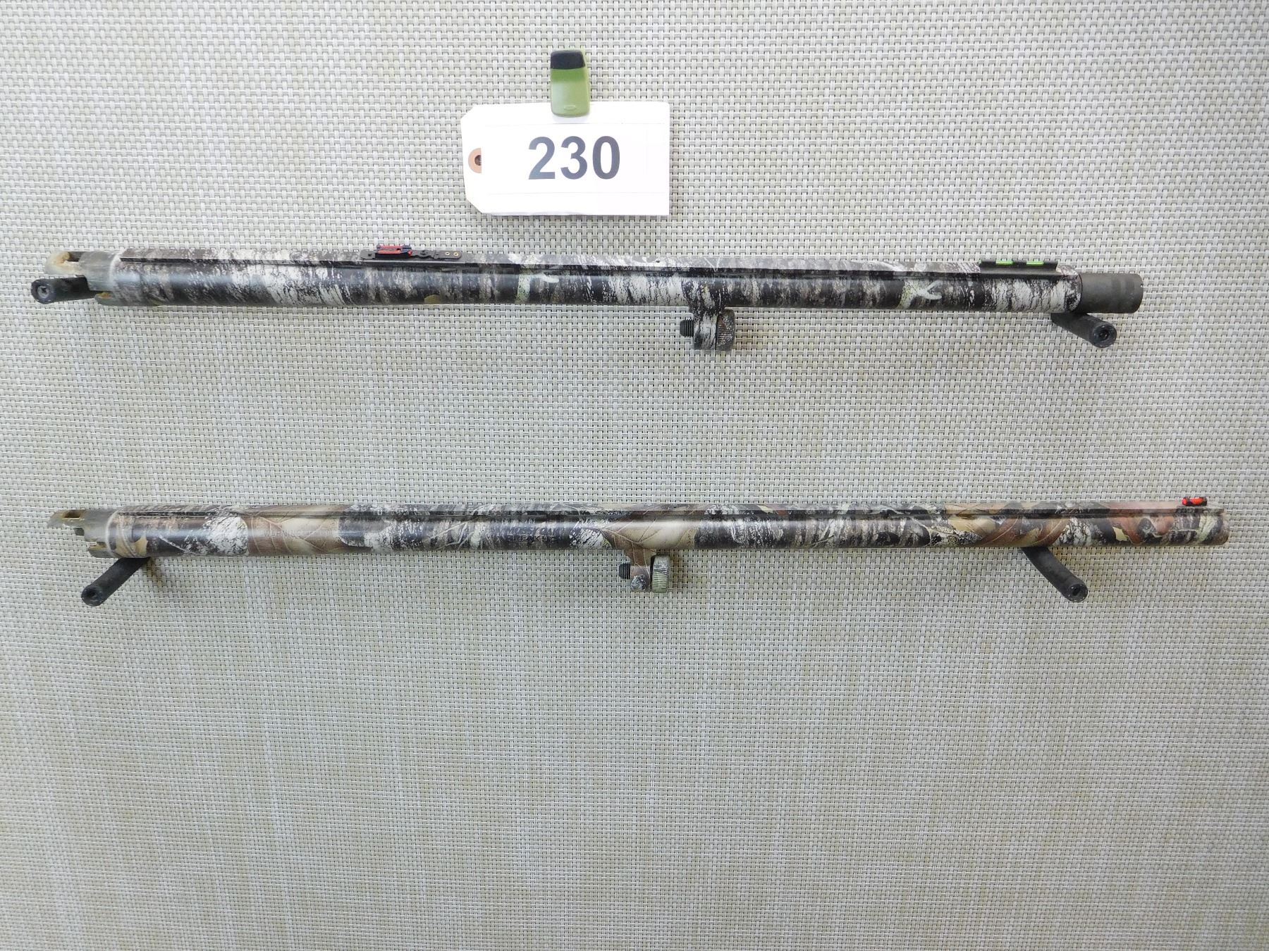 COMES WITH A BOX, 2 EXTRA BARRELS, CHOKES, A MANUAL AND ACCESSORIES, FULL CAMO FINISH, 24" BARREL WITH RIFLED BORE INSTALLED, FULL PISTOL GRIP AND VENTED RECOIL PAD, ACCESSORY RAIL MOUNTED ON REAR OF RECEIVER, 2ND BARREL IS 29" HAS A VENTED RIB WITH FIBER OPTIC SIGHT, SMOOTH BORE, AND A FULL CAMO FINISH, THE 3RD BARREL IS 23" WITH A SMOOTH BORE, WITH FIBER OPTIC FRONT AND REAR SIGHTS AND AN EXTERNAL THREADED CHOKE , ACTION: PUMP ACTION SHOTGUN , BARREL LENGTH: ASSORTED , STOCK # 7122 , SERIAL # AT202331 , CONDITION: LIKE NEW , CLASS: CANADIAN NON RESTRICTED CLASS