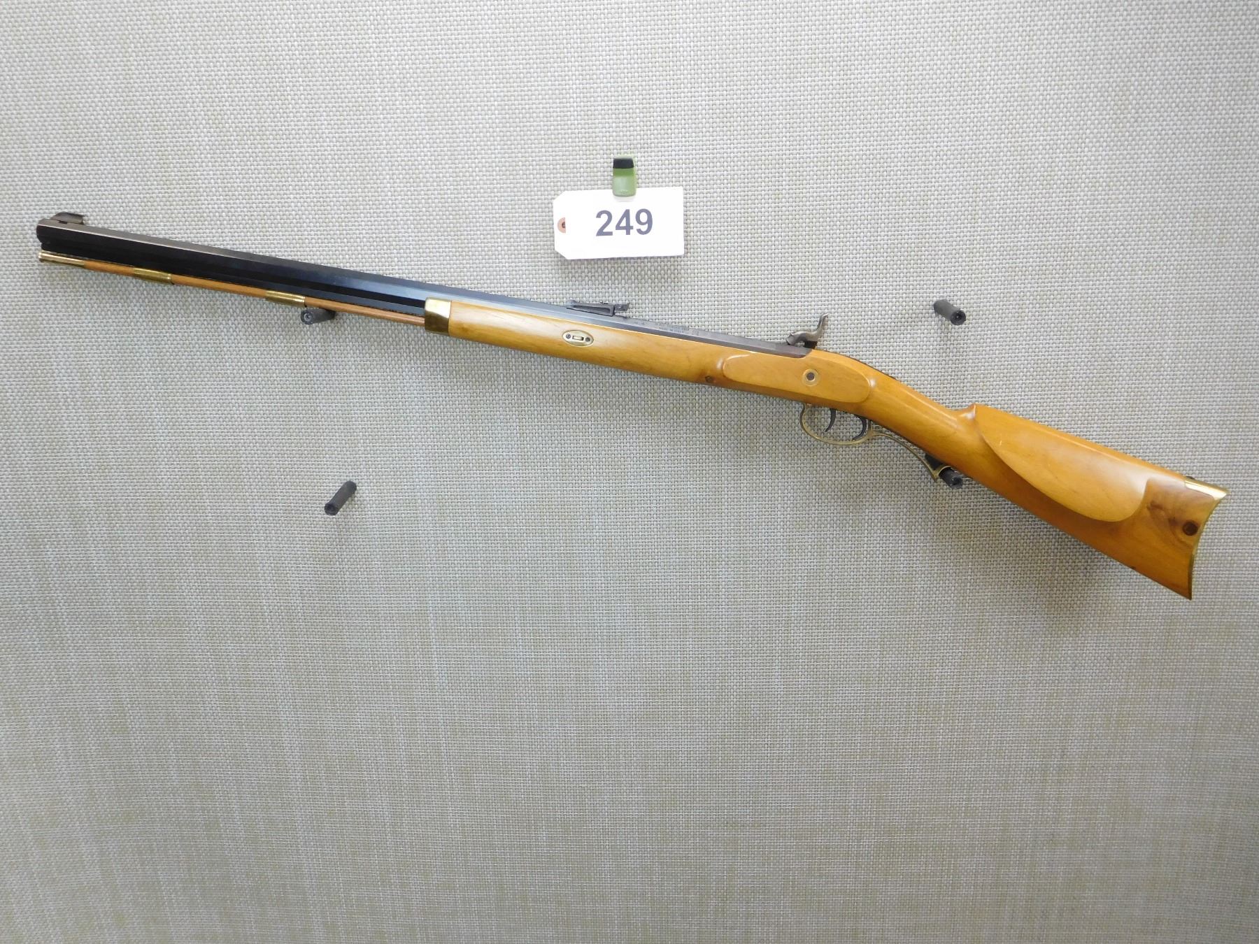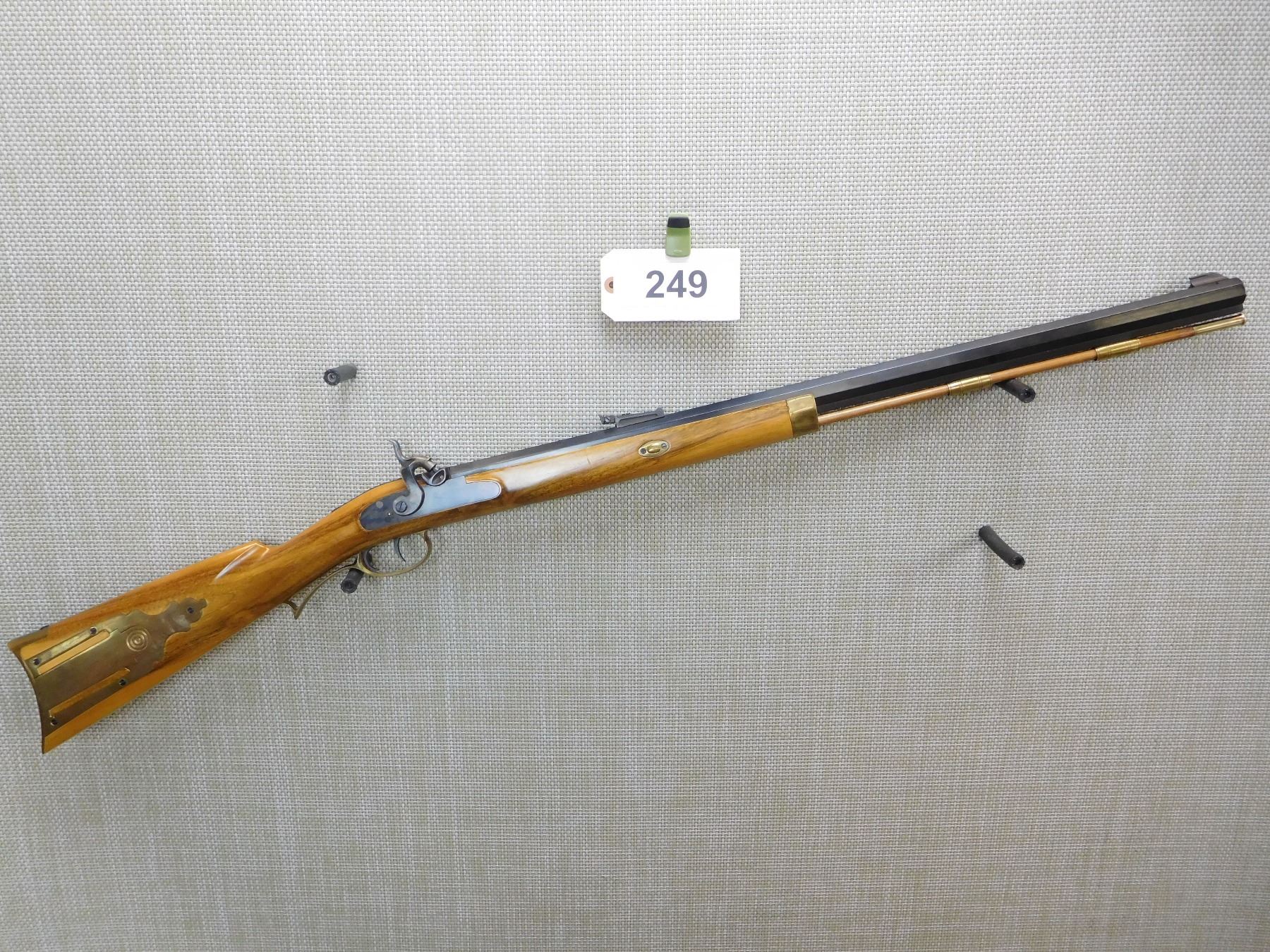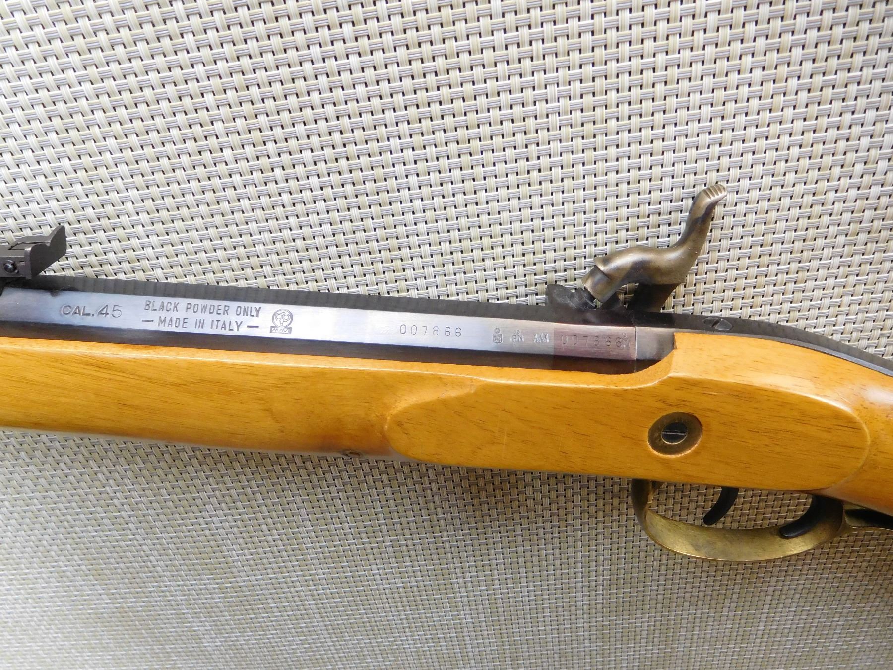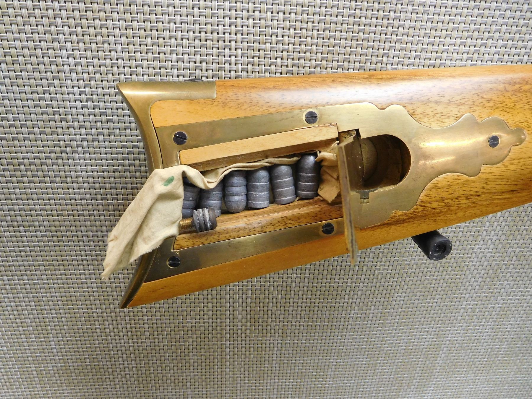 COMES WITH SMALL AMOUNT OF BULLETS THAT WERE STORED IN THE PATCH BOX,HAS A RAM ROD, OCTAGONAL BARREL, CASE HARDENED BACK ACTION LOCK, BLADE FRONT AND FULLY ADJUSTABLE REAR SIGHT, ITALIAN PROOFS, SET TRIGGER, BRASS FURNITURE INCLUDING PATCH BOX, CRESENT BUTT, EXCELLENT BORE , ACTION: SINGLE SHOT PERCUSSION , BARREL LENGTH: 28" , STOCK # 7141 , SERIAL # 007786 , CONDITION: 9/10 , CLASS: CANADIAN NON RESTRICTED CLASS