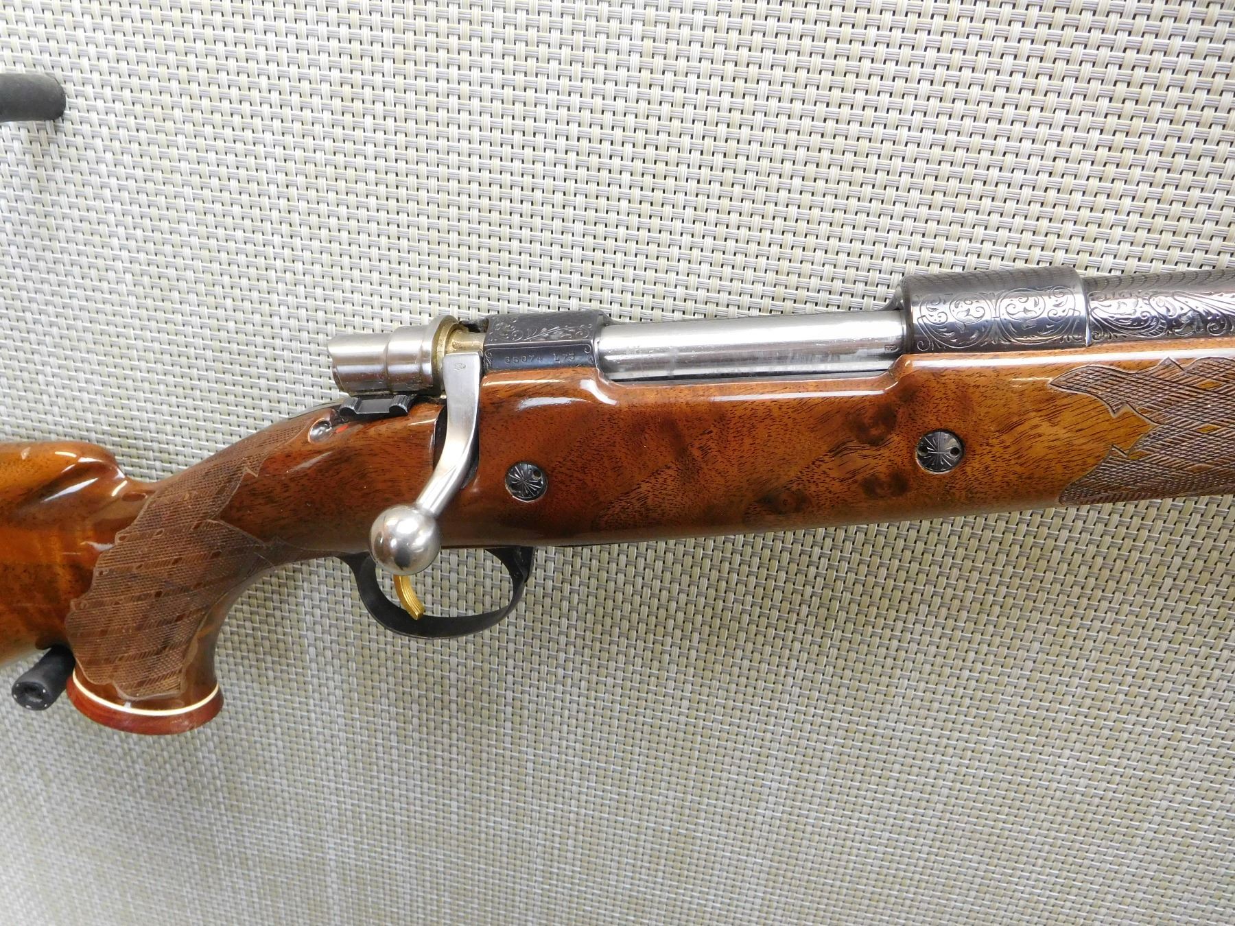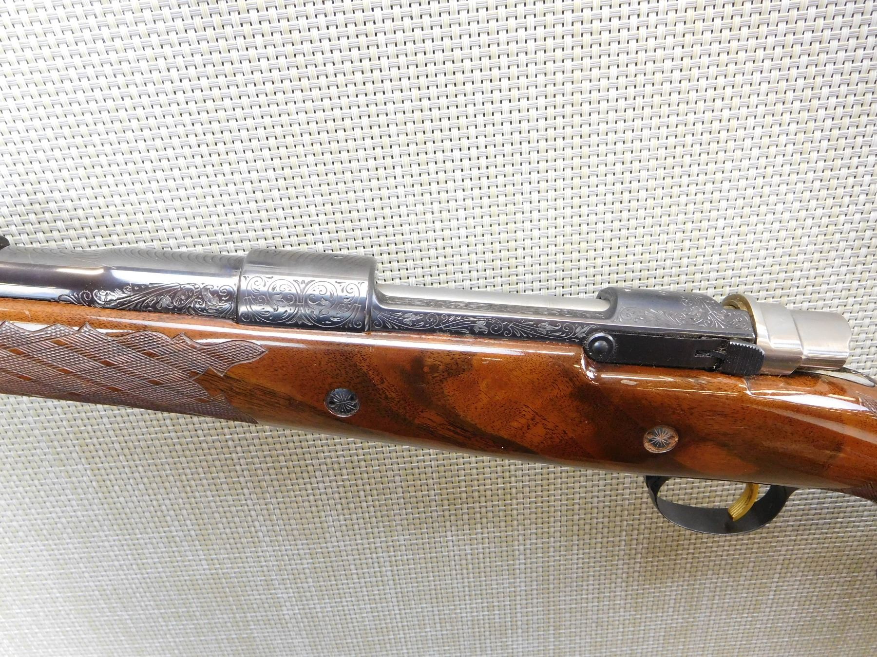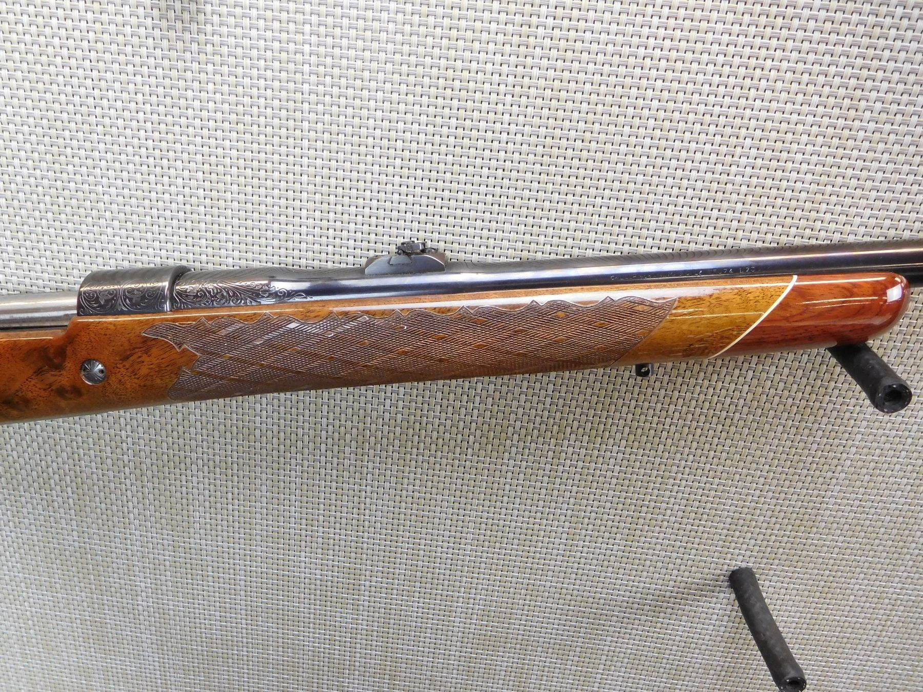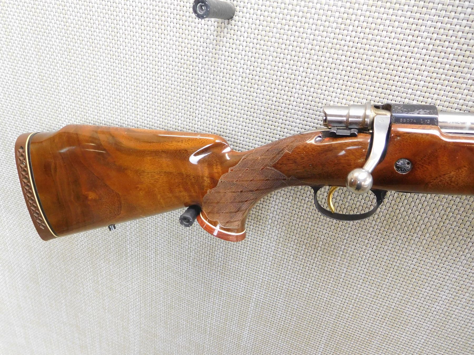 MANUFACTURED IN 1973, HOODED FRONT AND FLIP ADJUSTABLE REAR SIGHT, ENGRAVED RECEIVER AND BARREL, GOOD BORE, CHECKERED FOREND AND FULL PISTOL GRIP BUTT STOCK WITH RAISED CHEEK PIECE, GOLD TRIGGER, VENTED RUBBER RECOIL PAD, SLING STUDS , ACTION: BOLT ACTION RIFLE , BARREL LENGTH: 24" , STOCK # 7172 , SERIAL # 65074-L73 , CONDITION: 8/10 , CLASS: CANADIAN NON RESTRICTED CLASS