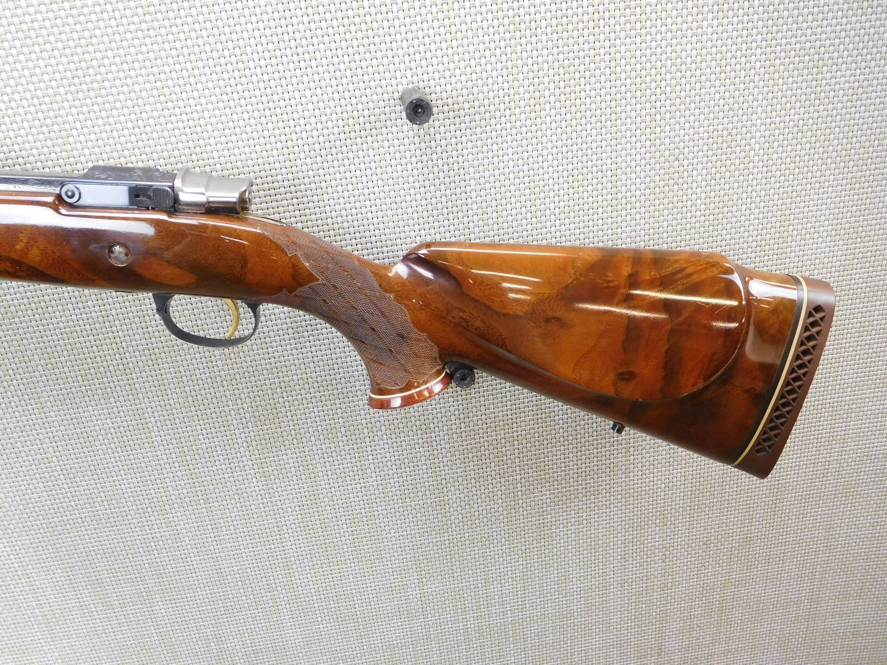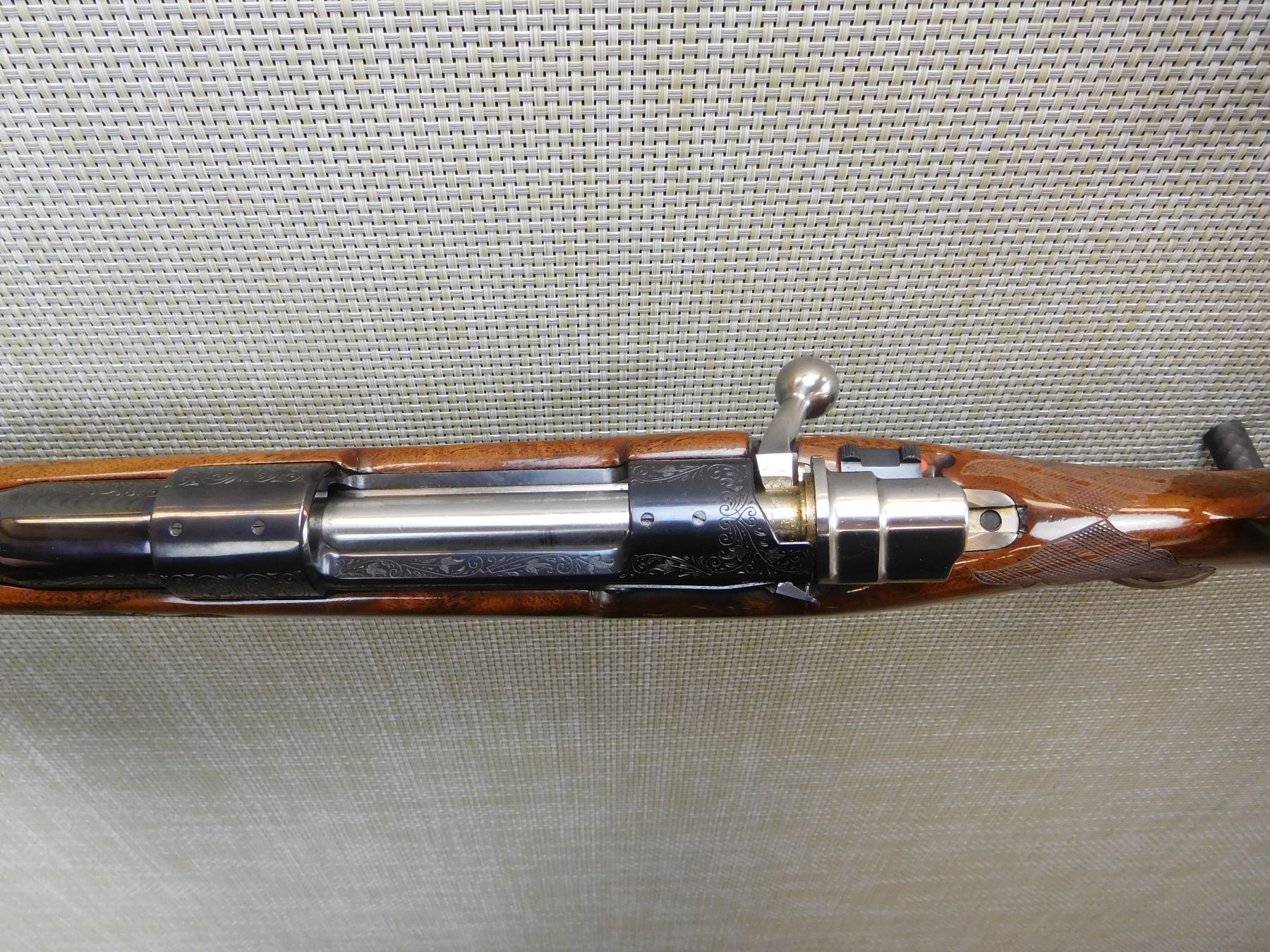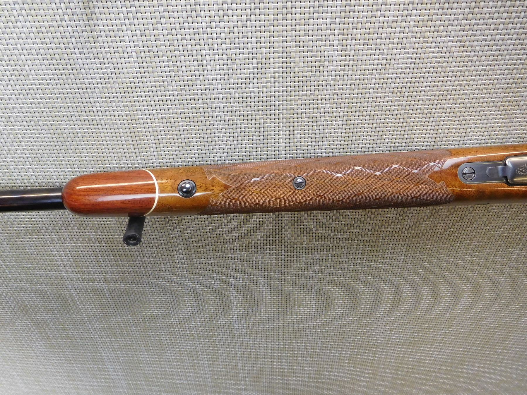 MANUFACTURED IN 1973, HOODED FRONT AND FLIP ADJUSTABLE REAR SIGHT, ENGRAVED RECEIVER AND BARREL, GOOD BORE, CHECKERED FOREND AND FULL PISTOL GRIP BUTT STOCK WITH RAISED CHEEK PIECE, GOLD TRIGGER, VENTED RUBBER RECOIL PAD, SLING STUDS , ACTION: BOLT ACTION RIFLE , BARREL LENGTH: 24" , STOCK # 7172 , SERIAL # 65074-L73 , CONDITION: 8/10 , CLASS: CANADIAN NON RESTRICTED CLASS