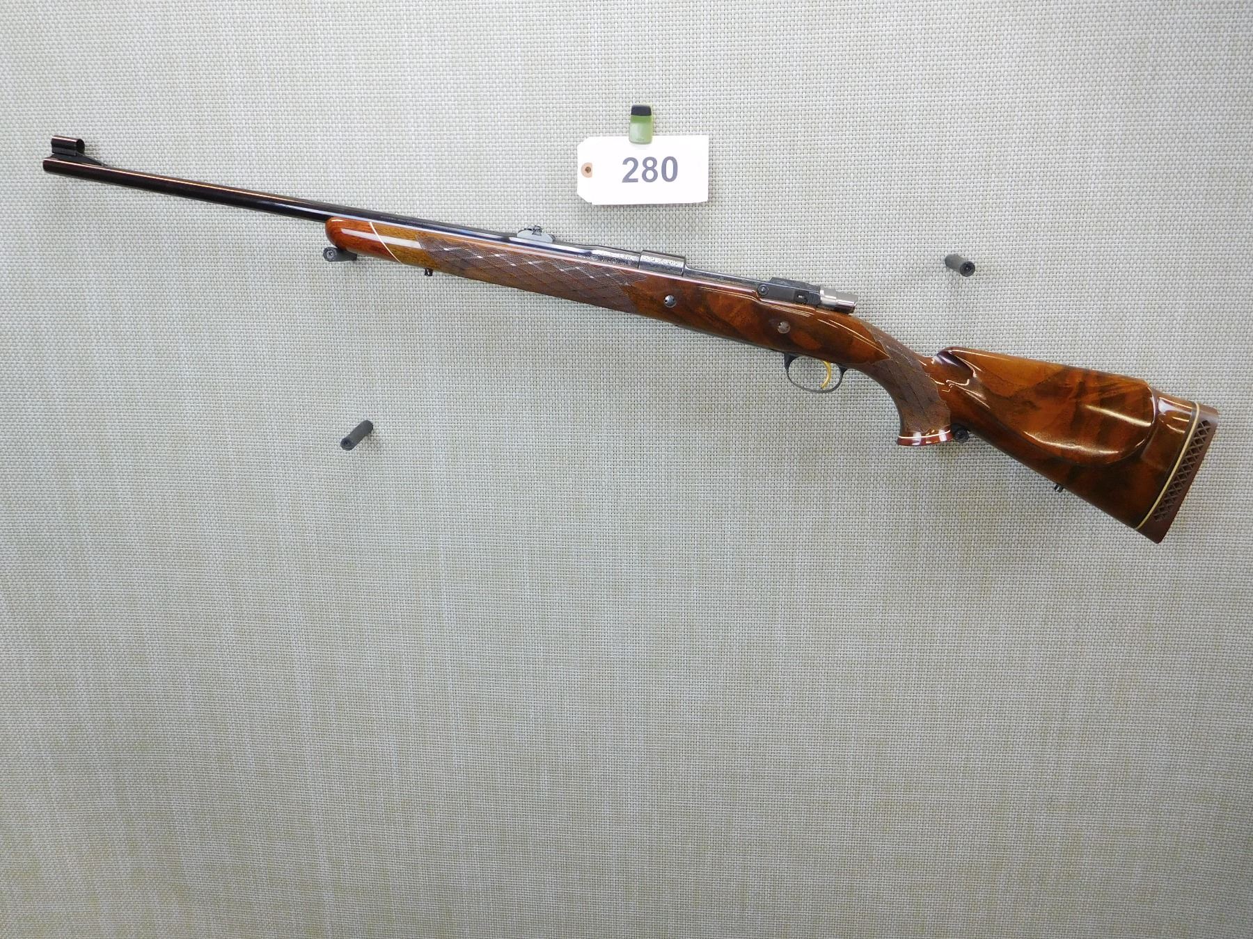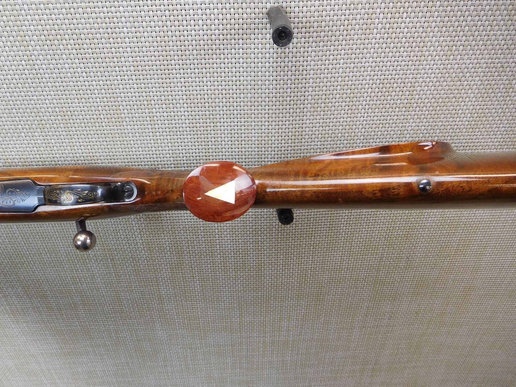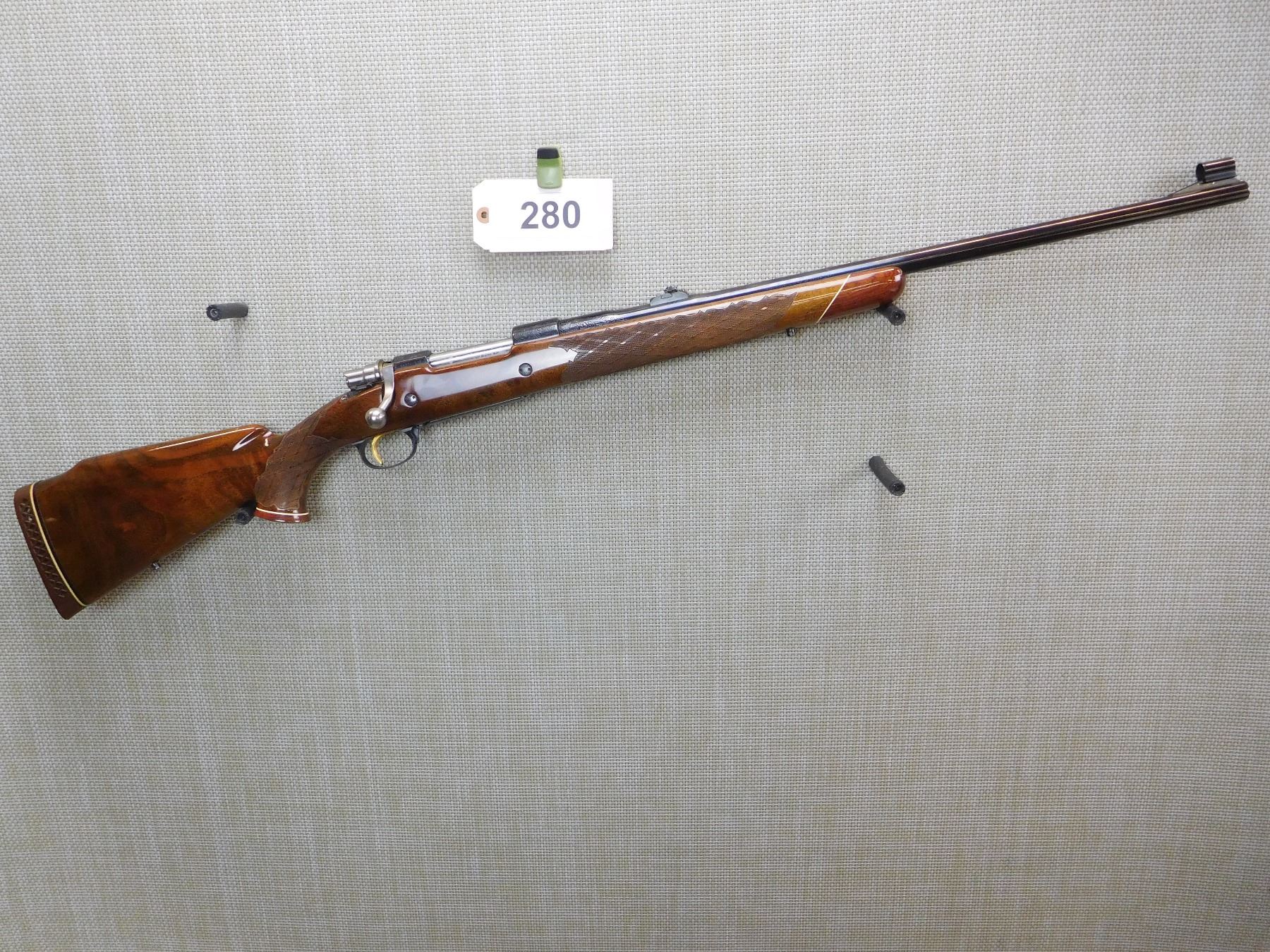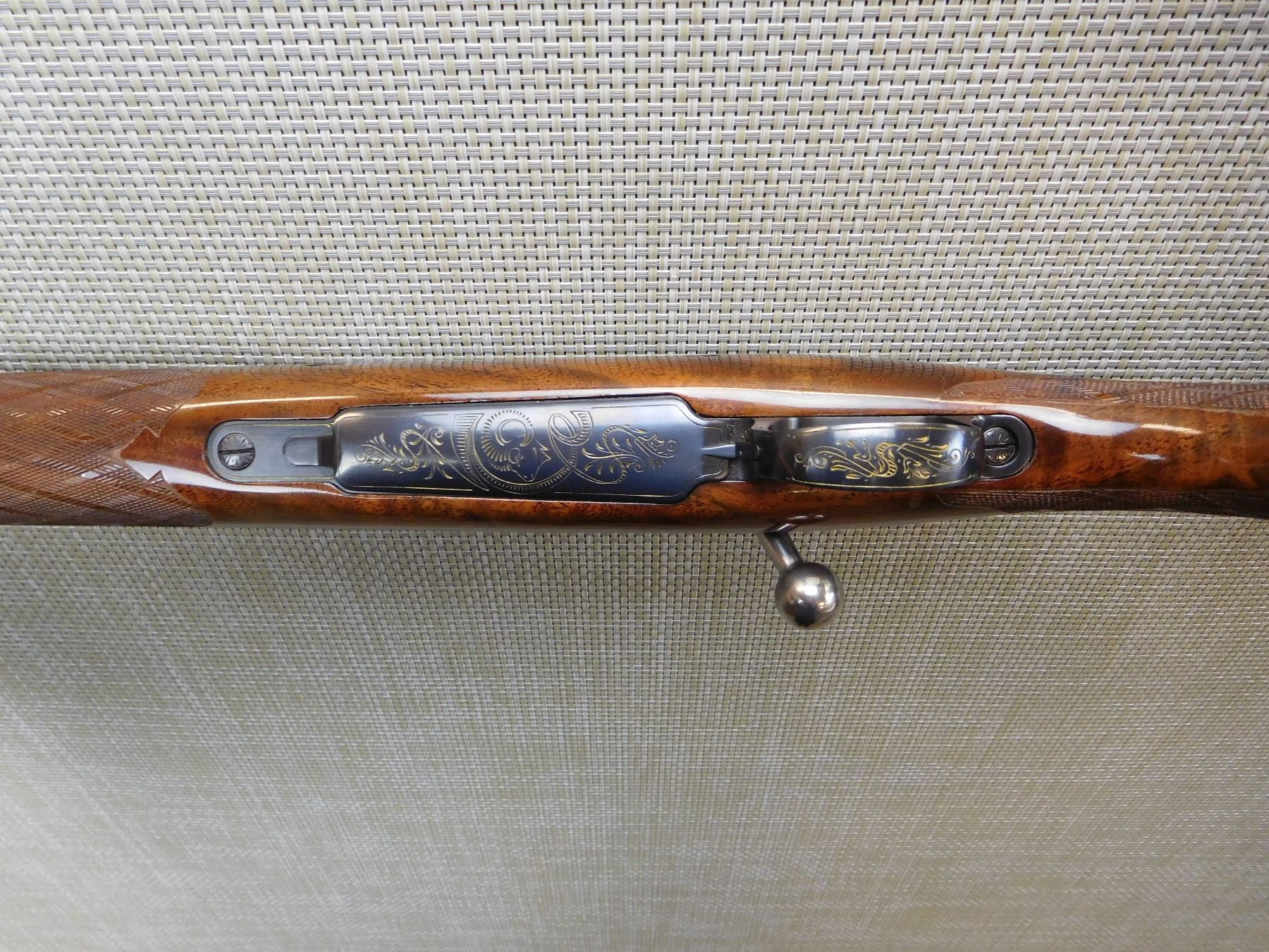 MANUFACTURED IN 1973, HOODED FRONT AND FLIP ADJUSTABLE REAR SIGHT, ENGRAVED RECEIVER AND BARREL, GOOD BORE, CHECKERED FOREND AND FULL PISTOL GRIP BUTT STOCK WITH RAISED CHEEK PIECE, GOLD TRIGGER, VENTED RUBBER RECOIL PAD, SLING STUDS , ACTION: BOLT ACTION RIFLE , BARREL LENGTH: 24" , STOCK # 7172 , SERIAL # 65074-L73 , CONDITION: 8/10 , CLASS: CANADIAN NON RESTRICTED CLASS