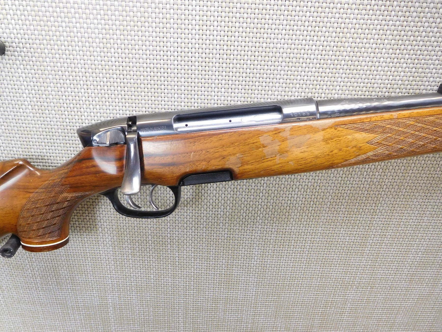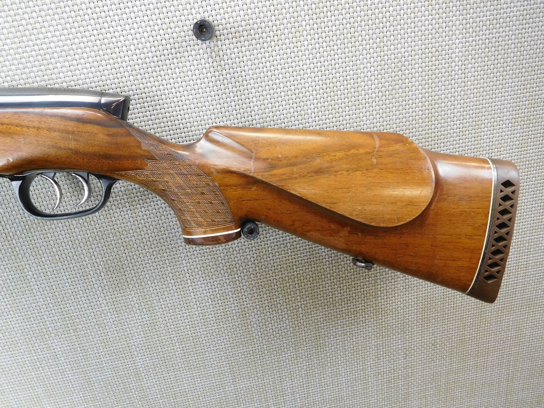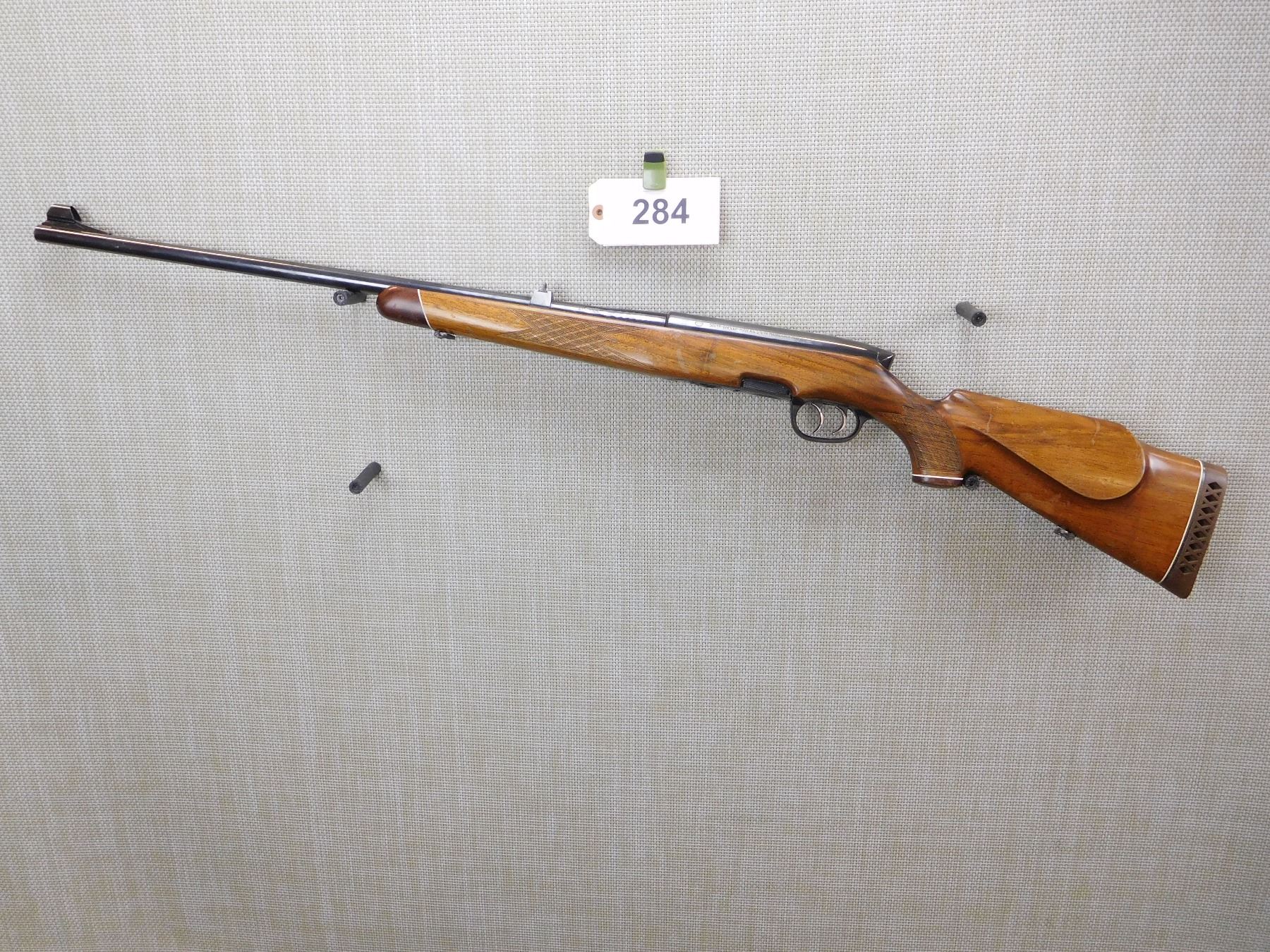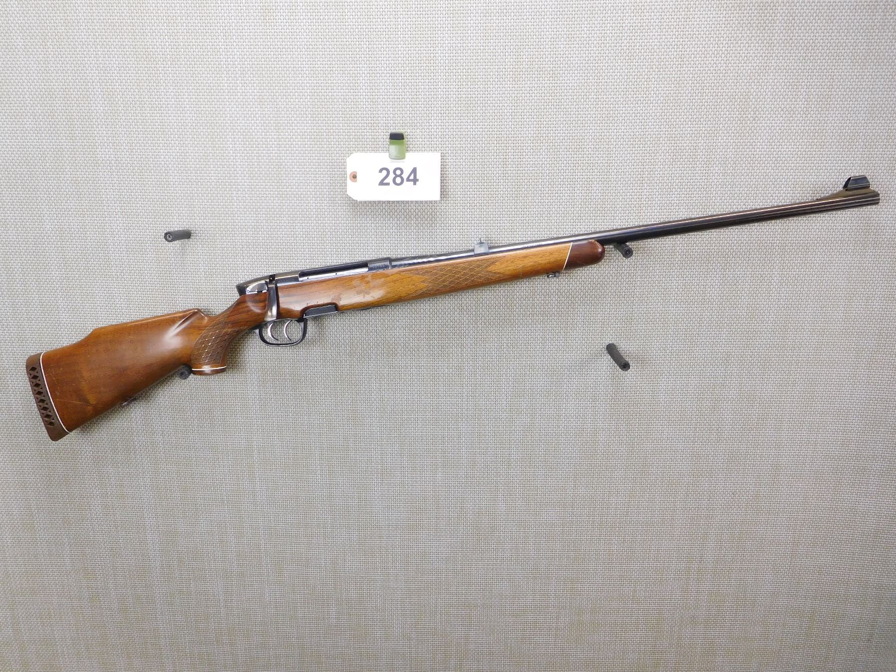 COMES WITH MAGAZINE, SET TRIGGER, BORE IS EXCELLENT, HOODED FRONT SIGHT AND FIXED REAR SIGHT, DRILLED AND TAPPED FOR SCOPE MOUNTS, SLING LOOPS, BUTTER KNIFE BOLT KNOB, CHECKERED FOREND AND CHECKERED CAPPED PISTOL GRIP STOCK WITH RAISED CHEEK PIECE AND RUBBER RECOIL PAD, OARTIALLY FLUTED BARREL AT THE BREACH , ACTION: BOLT ACTION RIFLE , BARREL LENGTH: 26" , STOCK # 7176 , SERIAL # 10189 , CONDITION: 8/10 , CLASS: CANADIAN NON RESTRICTED CLASS