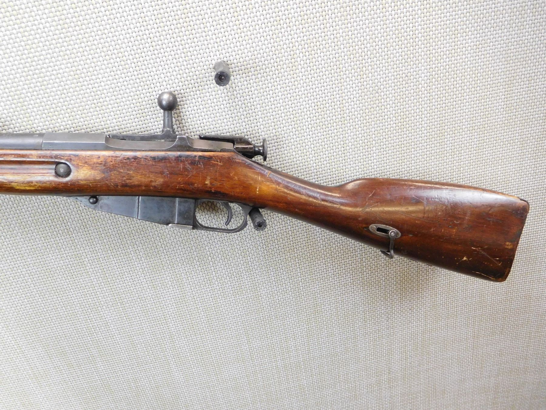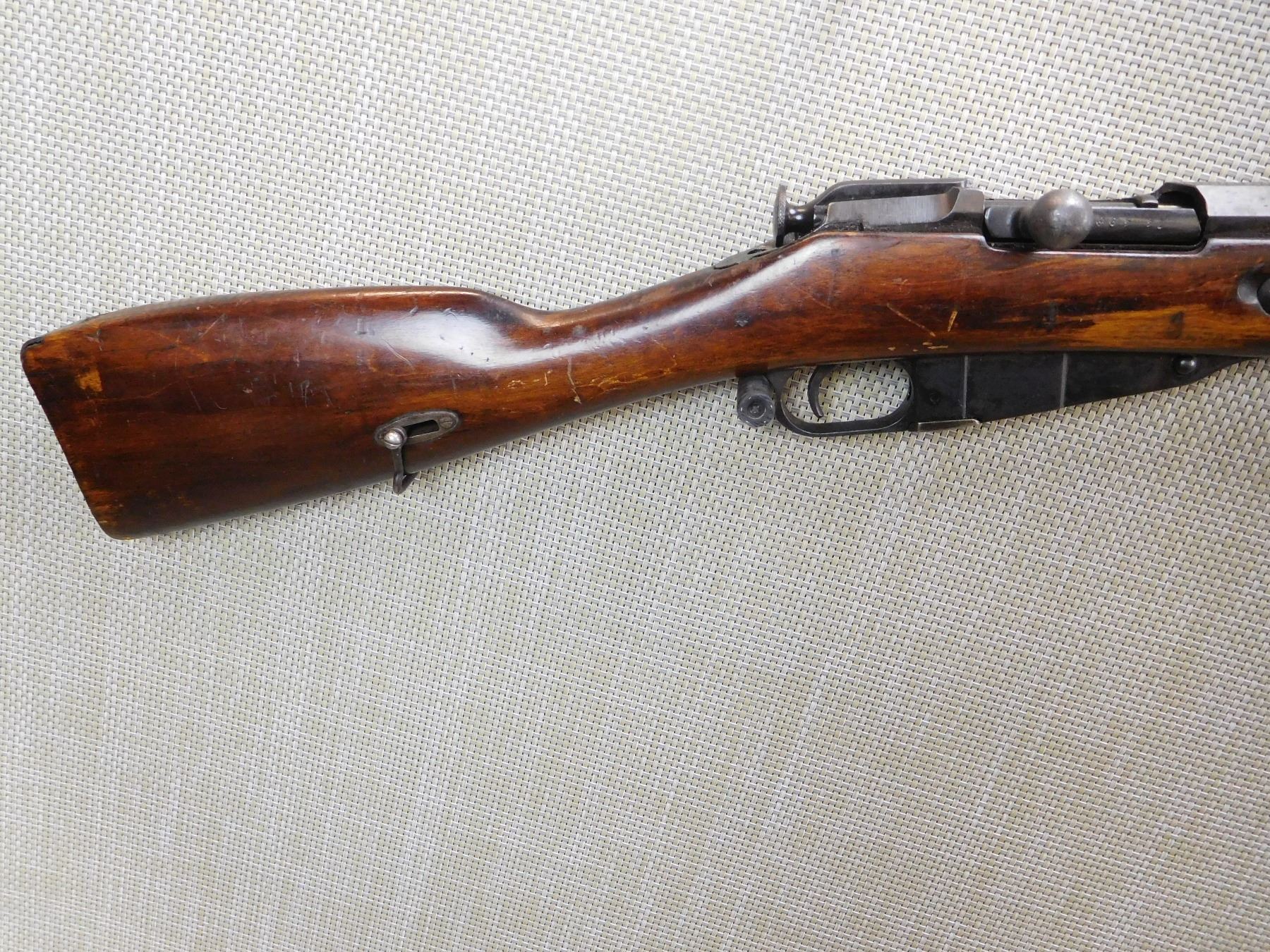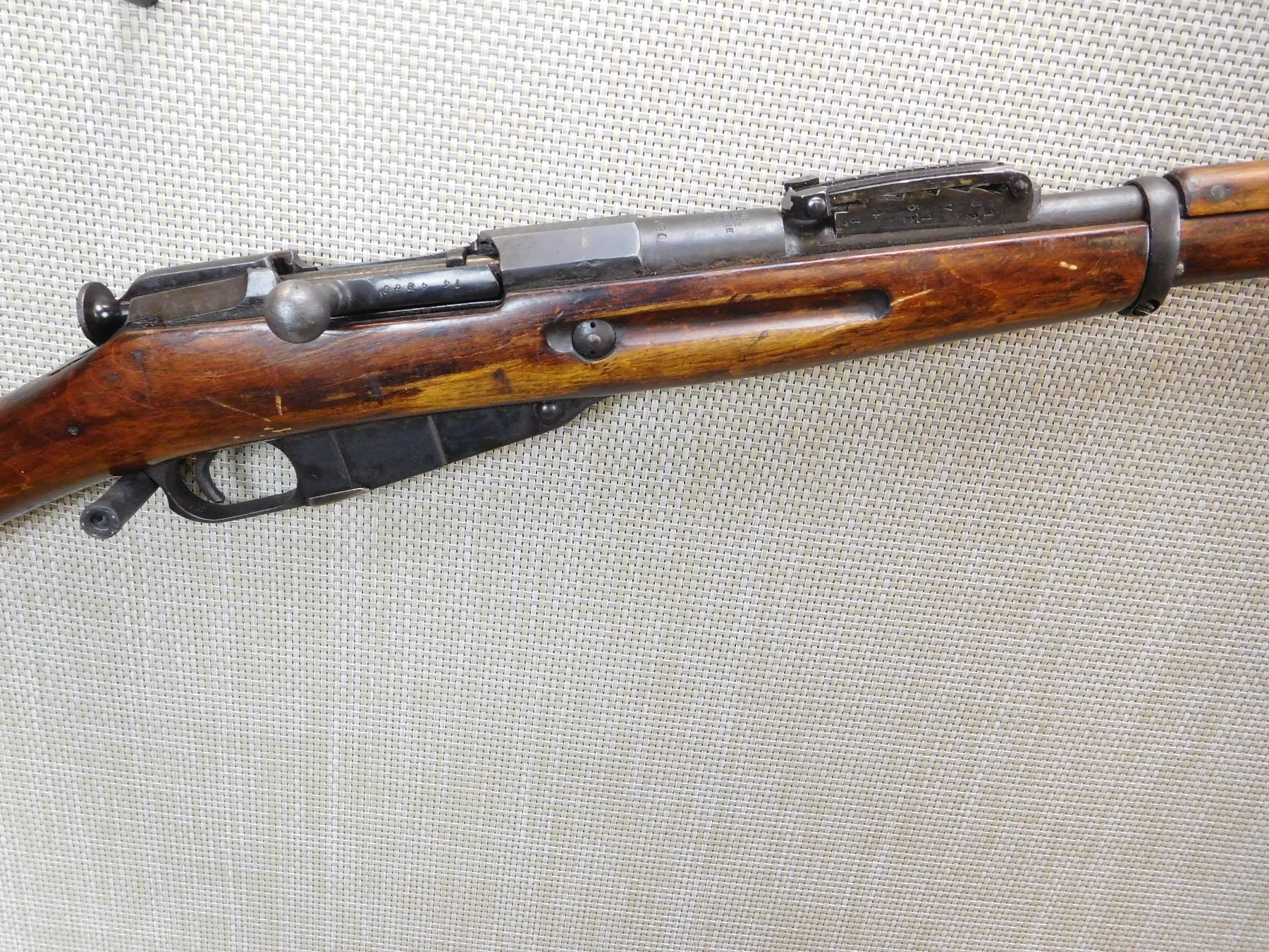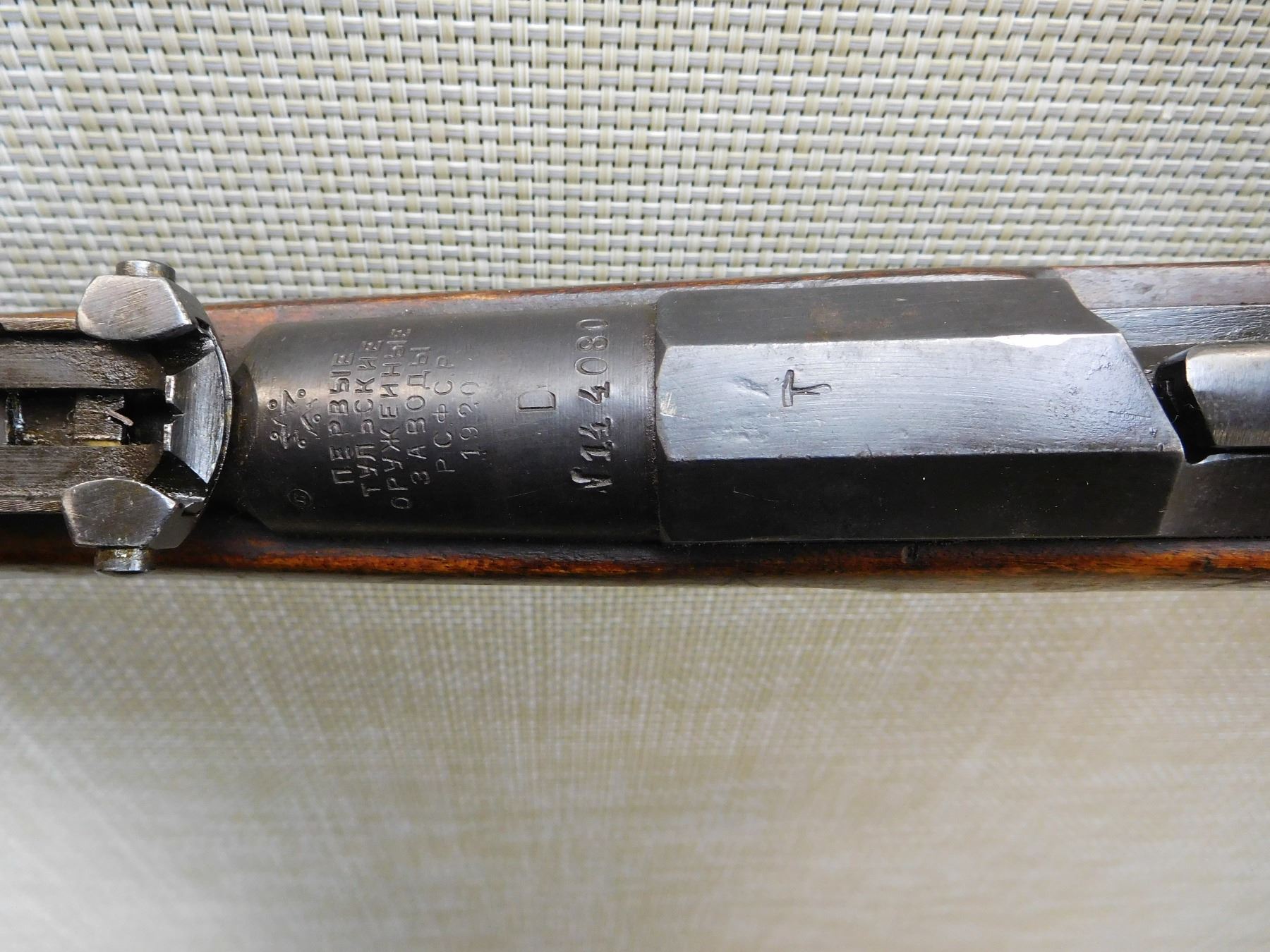 RARE MOSIN NAGANT 1891 COLLECTOR YEAR, MANUFACTURED BY RUSSIAN STATE ARSENAL IN 1920, 1920 WAS THE LAST YEAR THE LONG MODEL 1891 WAS PRODUCED AS IT WAS REPLACED BY THE 1891 DRAGOON RIFLE FROM 1920, BORE IS DARK, HAS CLEANING ROD, BOLT AND RECEIVER MATCH, SLING LOOPS, DOVETAIL FRONT AND MILITARY ADJUSTABLE REAR SIGHT , ACTION: BOLT ACTION RIFLE , BARREL LENGTH: 32" , STOCK # 7179 , SERIAL # 144080 , CONDITION: 7/10 , CLASS: CANADIAN NON RESTRICTED CLASS