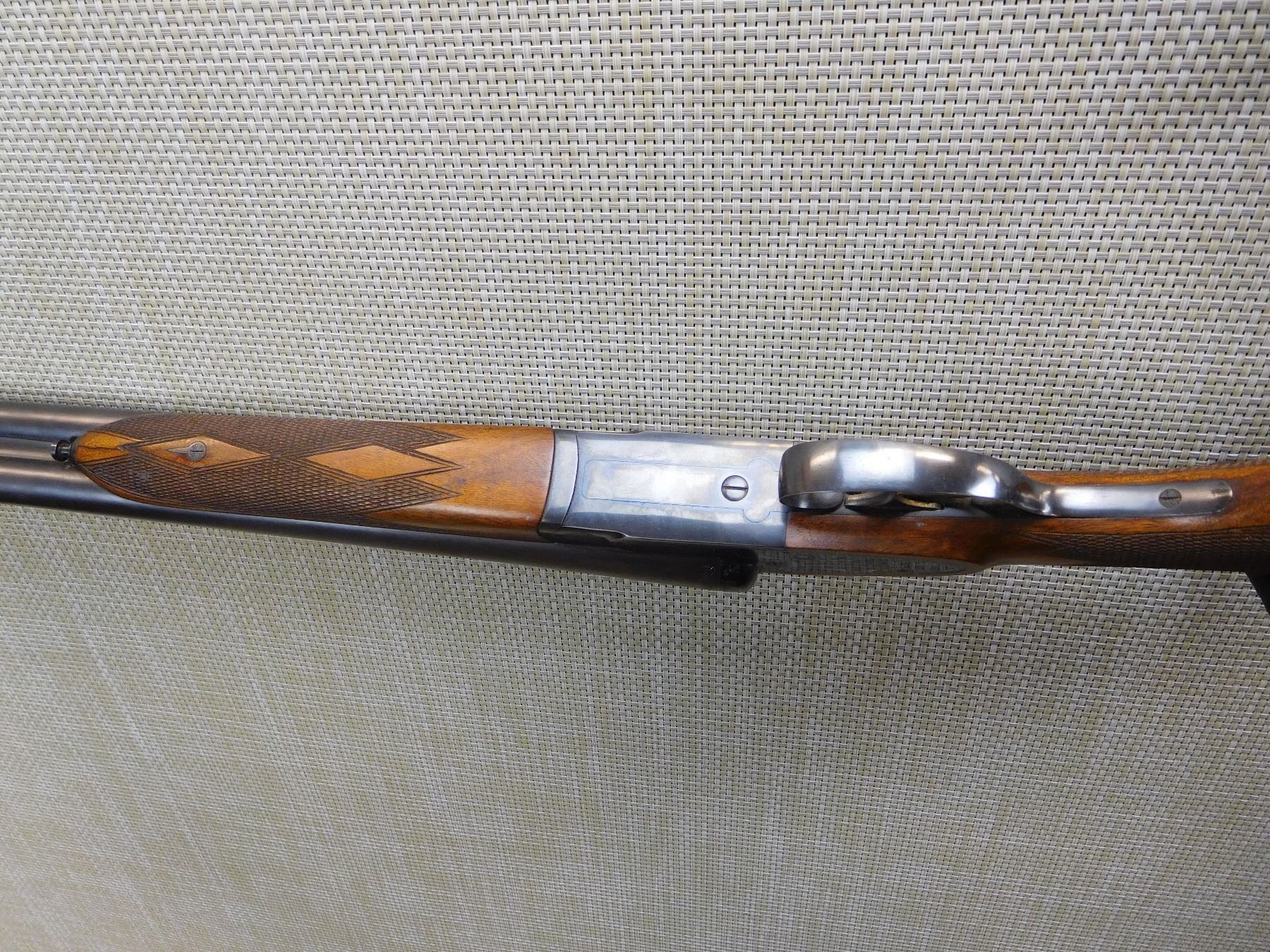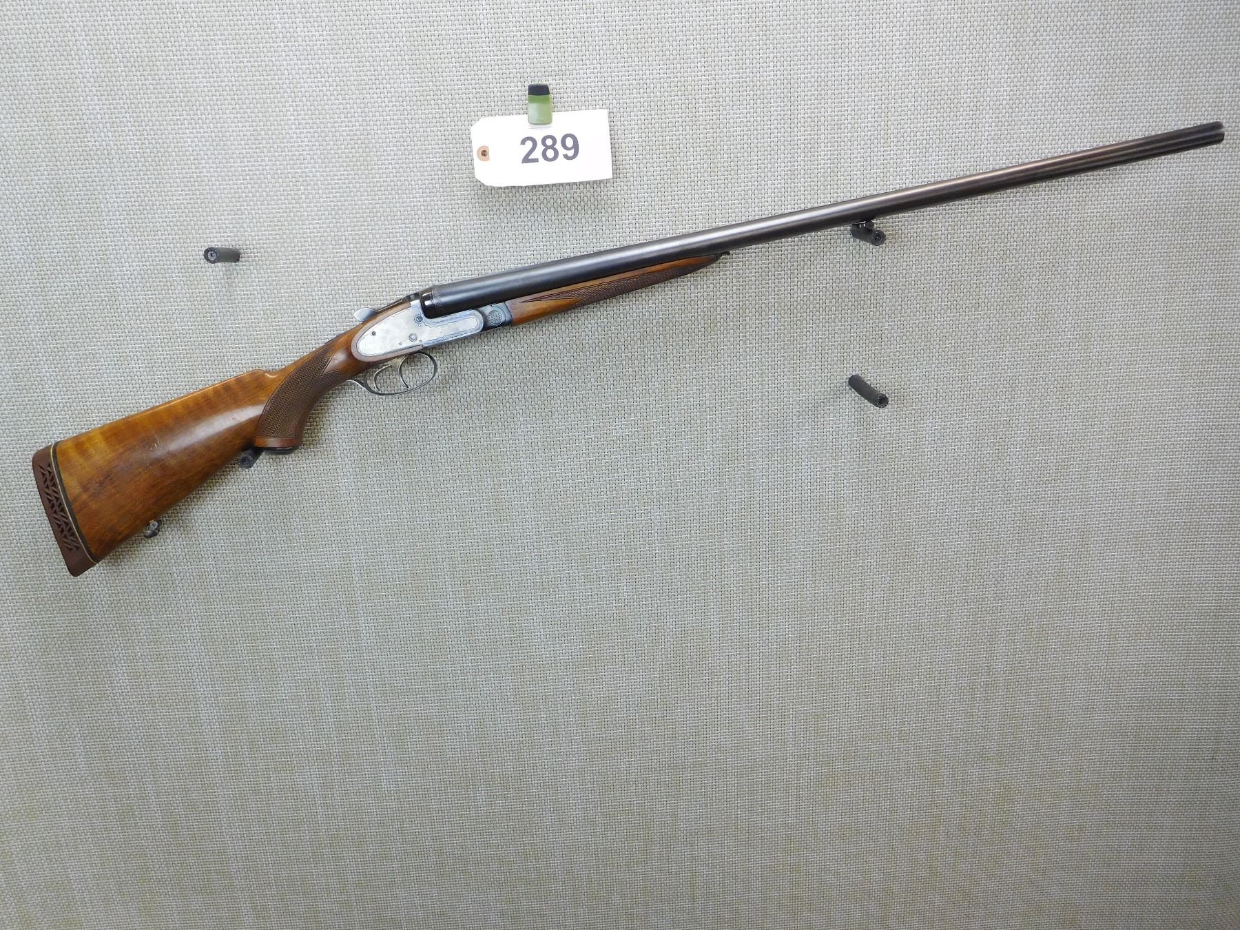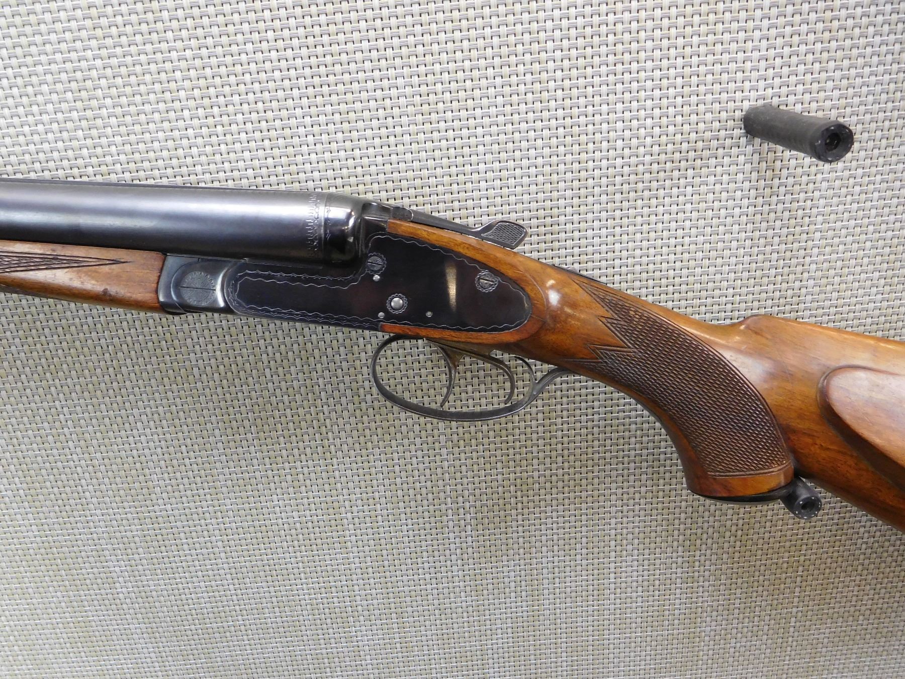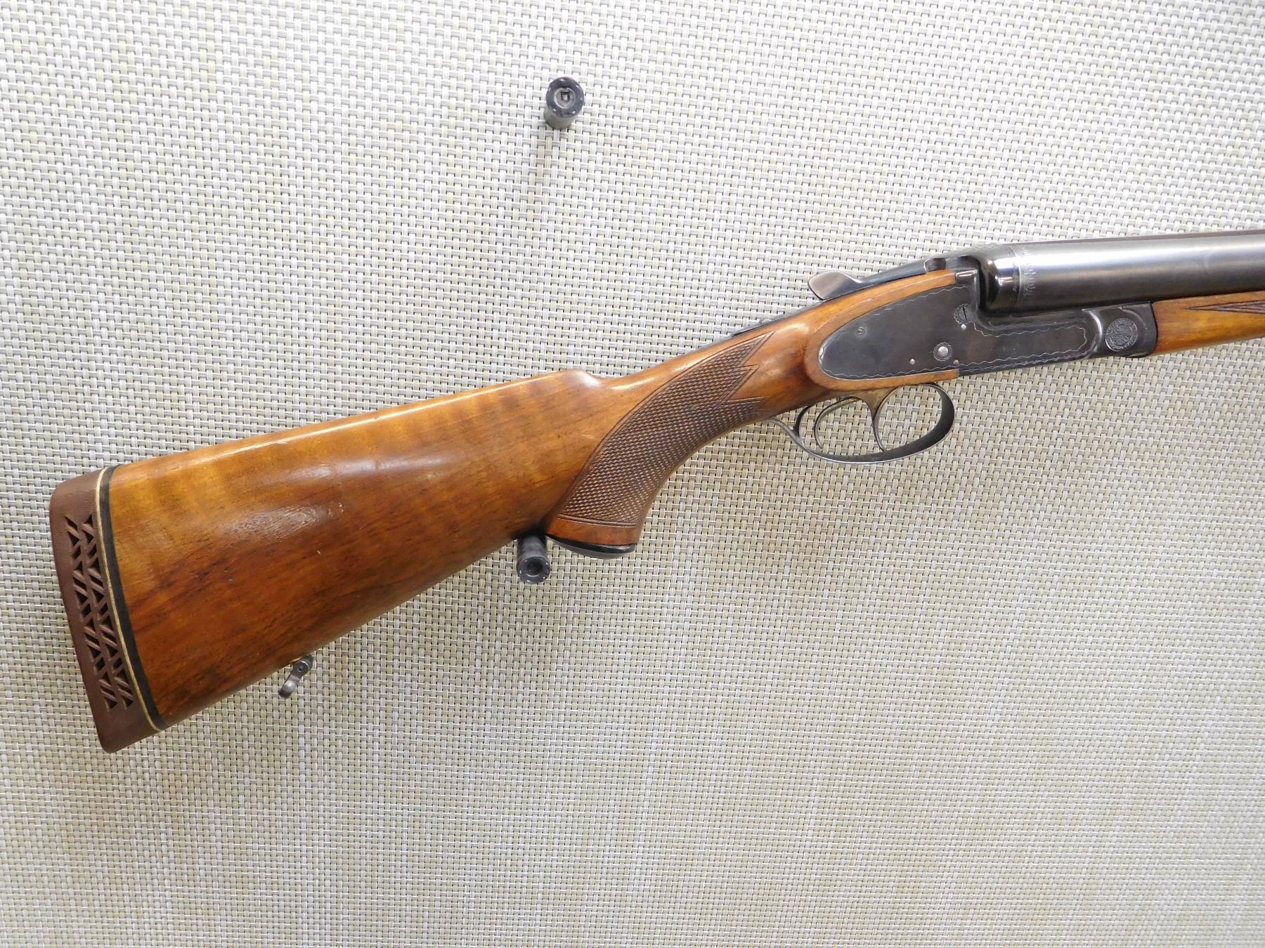 SIDE LOCK, THERE IS A BULGE IN THE LEFT BARREL AT APPROX 13" FROM THE BREACH, ( THIS COULD BE REPAIRED), CHOKES ARE FIXED FULL, CHECKERED FOREND AND CAPPED PISTOL GRIP WITH VENTED RECOIL PAD, SLING SWIVELS, BEAD FRONT SIGHT WITH A SOLID RIB, BORE IS VERY GOOD , ACTION: SIDE BY SIDE BREAK ACTION SHOTGUN , BARREL LENGTH: 28" , STOCK # 7181 , SERIAL # 2357258 , CONDITION: 6/10 , CLASS: CANADIAN NON RESTRICTED CLASS