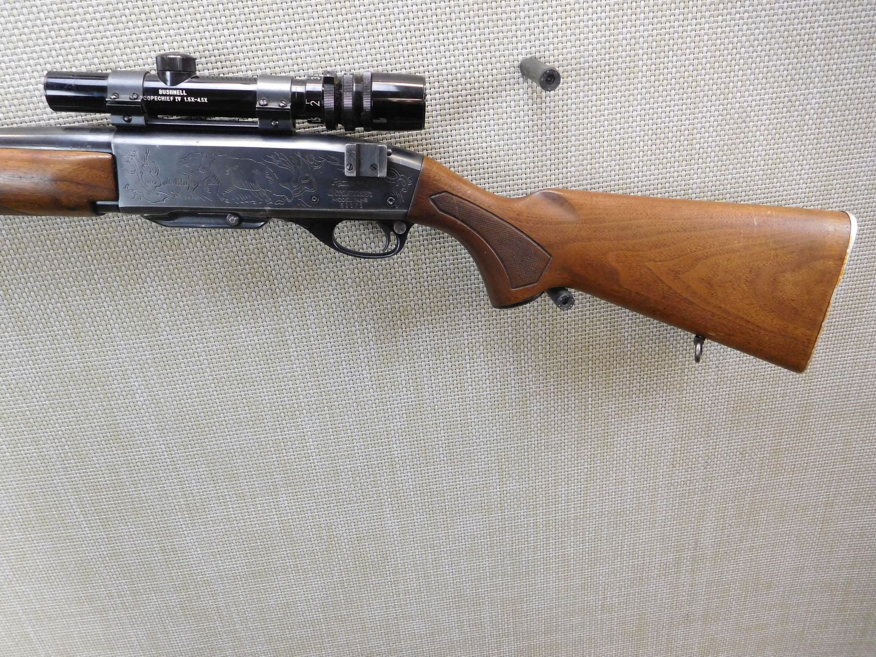 COMES WITH MAGAIZNE, 1.5 - 4.5 BUSHNELL SCOPE, DRILLED AND MOUNT FOR SIDE APERATURE SIGHT, RAMP FRONT AND NO REAR SIGHT, BORE IS GOOD, CHECKERED FOREND AND CAPPED PISTOL GRIP STOCK WITH STEEL BUTT PLATE, MINOR PITTING ON FOREND CAP AND BARREL , ACTION: SEMI AUTOMATIC RIFLE , BARREL LENGTH: 21" , STOCK # 7203 , SERIAL # 51171 , CONDITION: 6/10 , CLASS: CANADIAN NON RESTRICTED CLASS