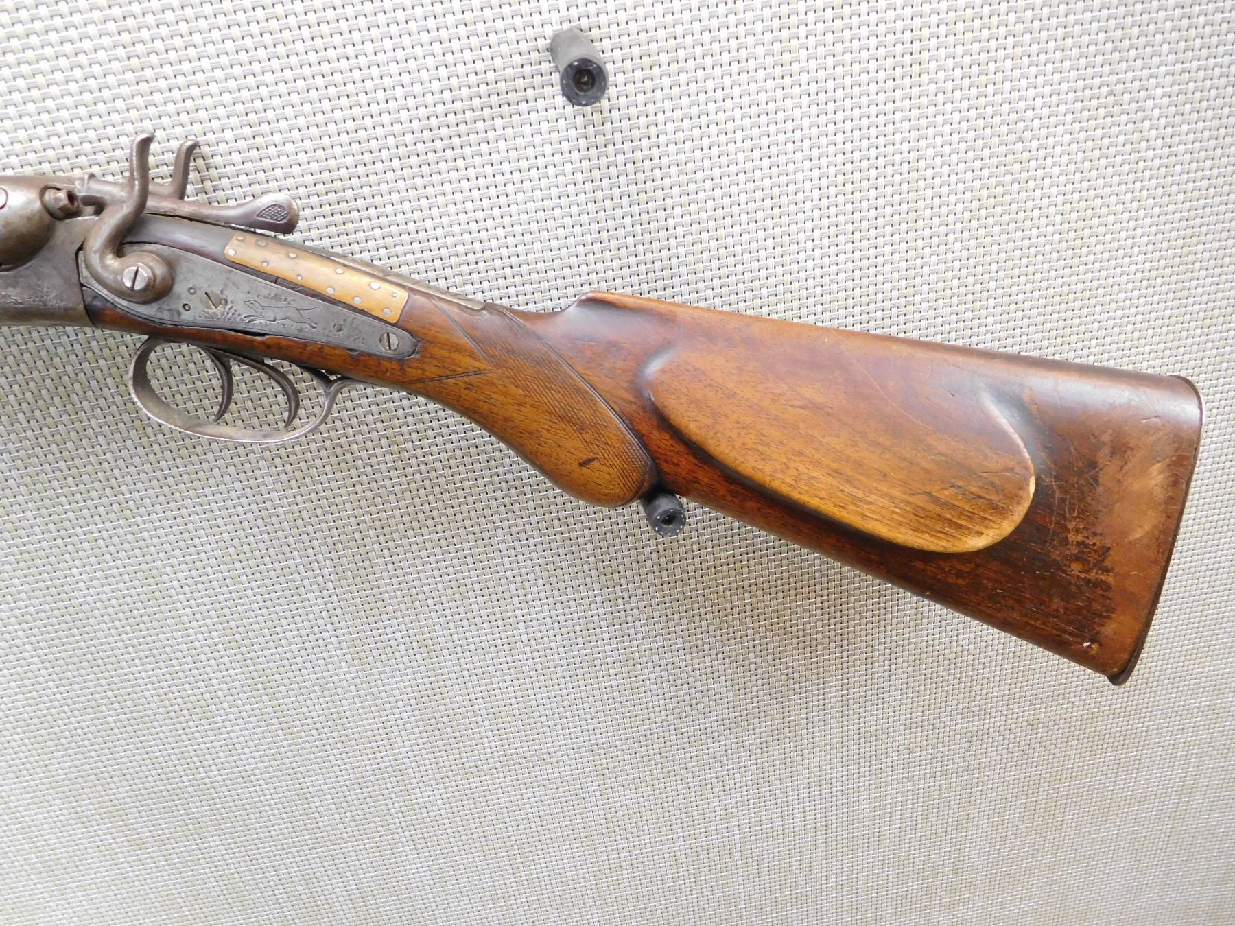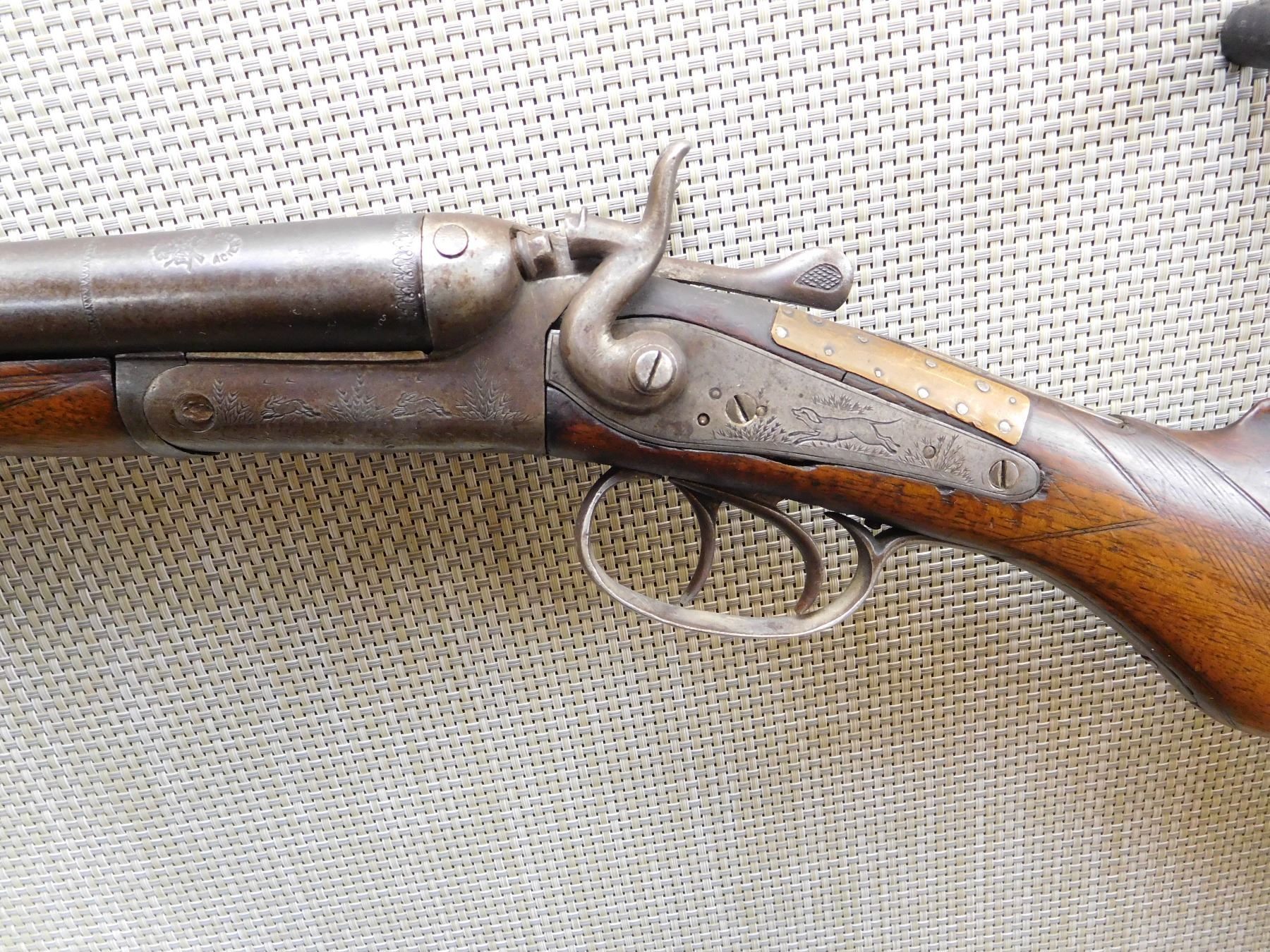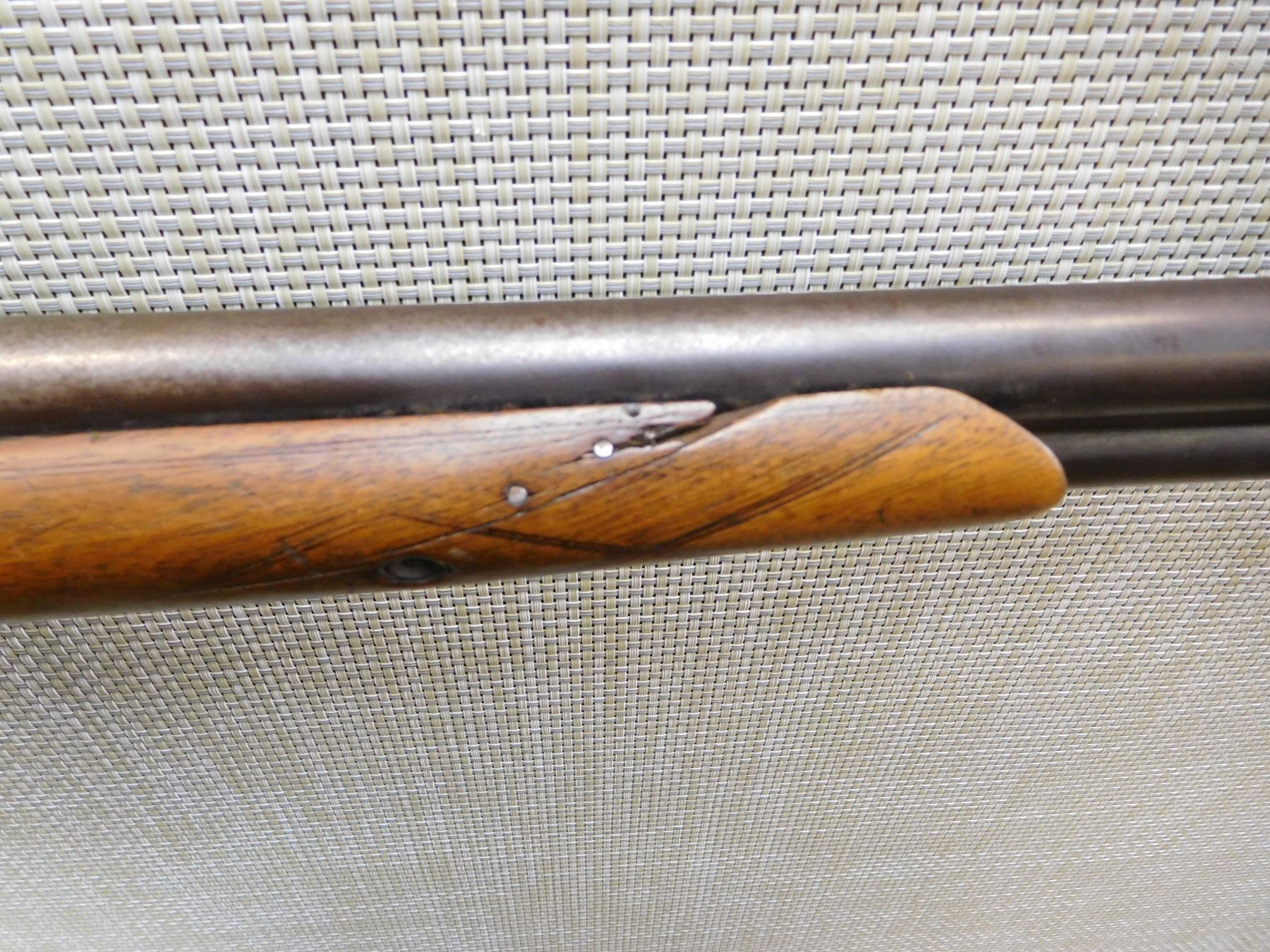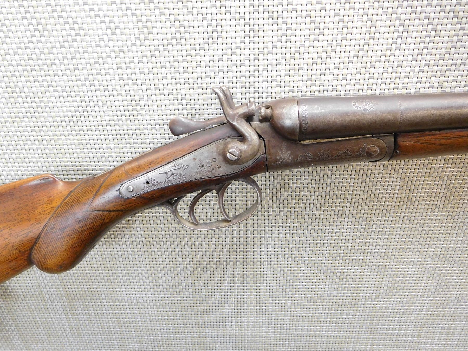 CHOKES ARE FIXED FULL AND MODIFIED, REPAIRED AT THE WRIST AND A WELDED TANG, STEEL BUTT PLATE, GOOD BORES, RIGHT HAMMER SPRING IS BROKEN, ONE SLING SWIVEL OTHER IS MISSING , ACTION: SIDE BY SIDE BREAK ACTION DOUBLE HAMMERS DOUBLE TRIGGERS , BARREL LENGTH: 29 1/2" , STOCK # 7206 , SERIAL # 7473 , CONDITION: 3/10 , CLASS: CANADIAN NON RESTRICTED CLASS