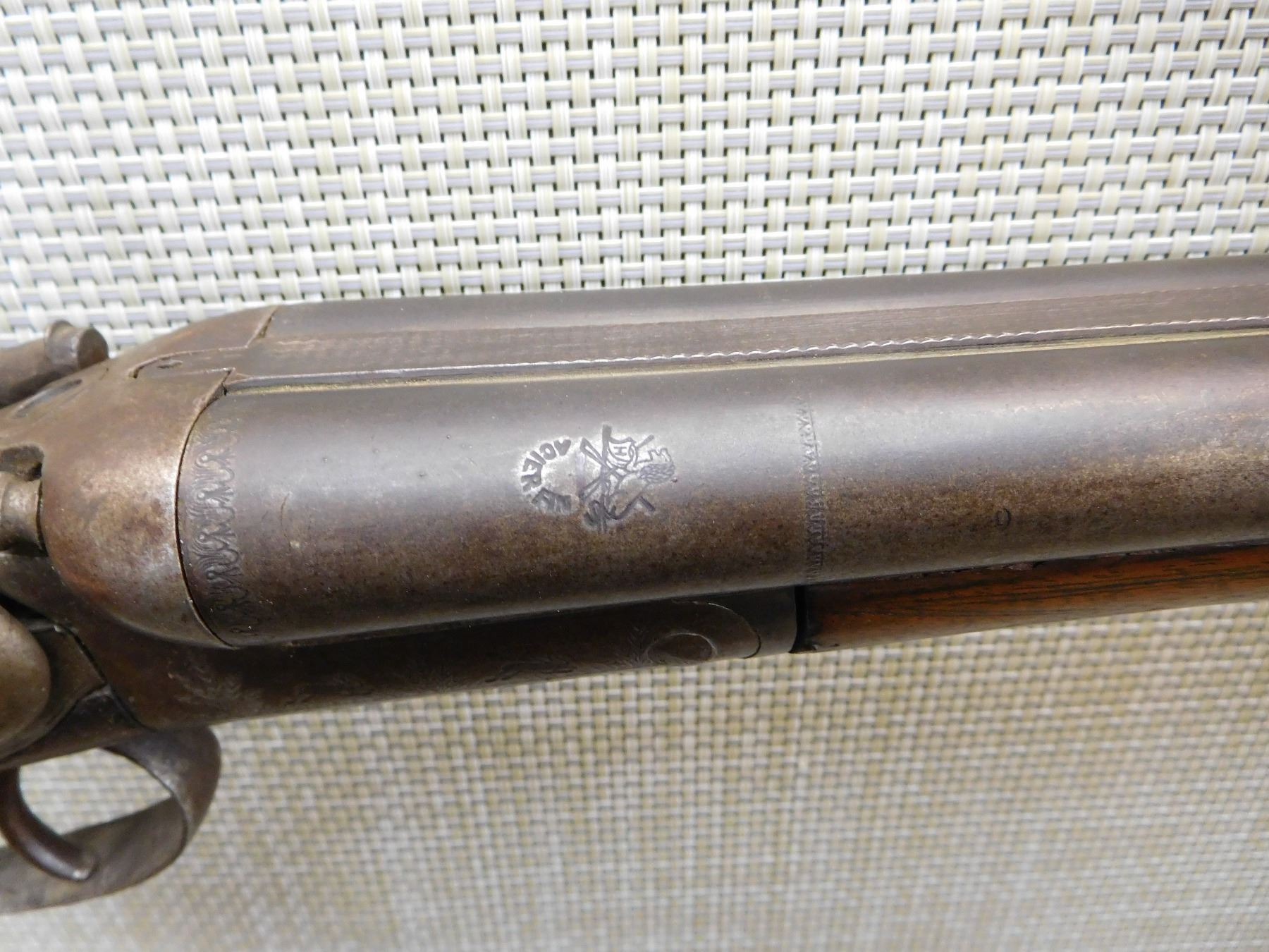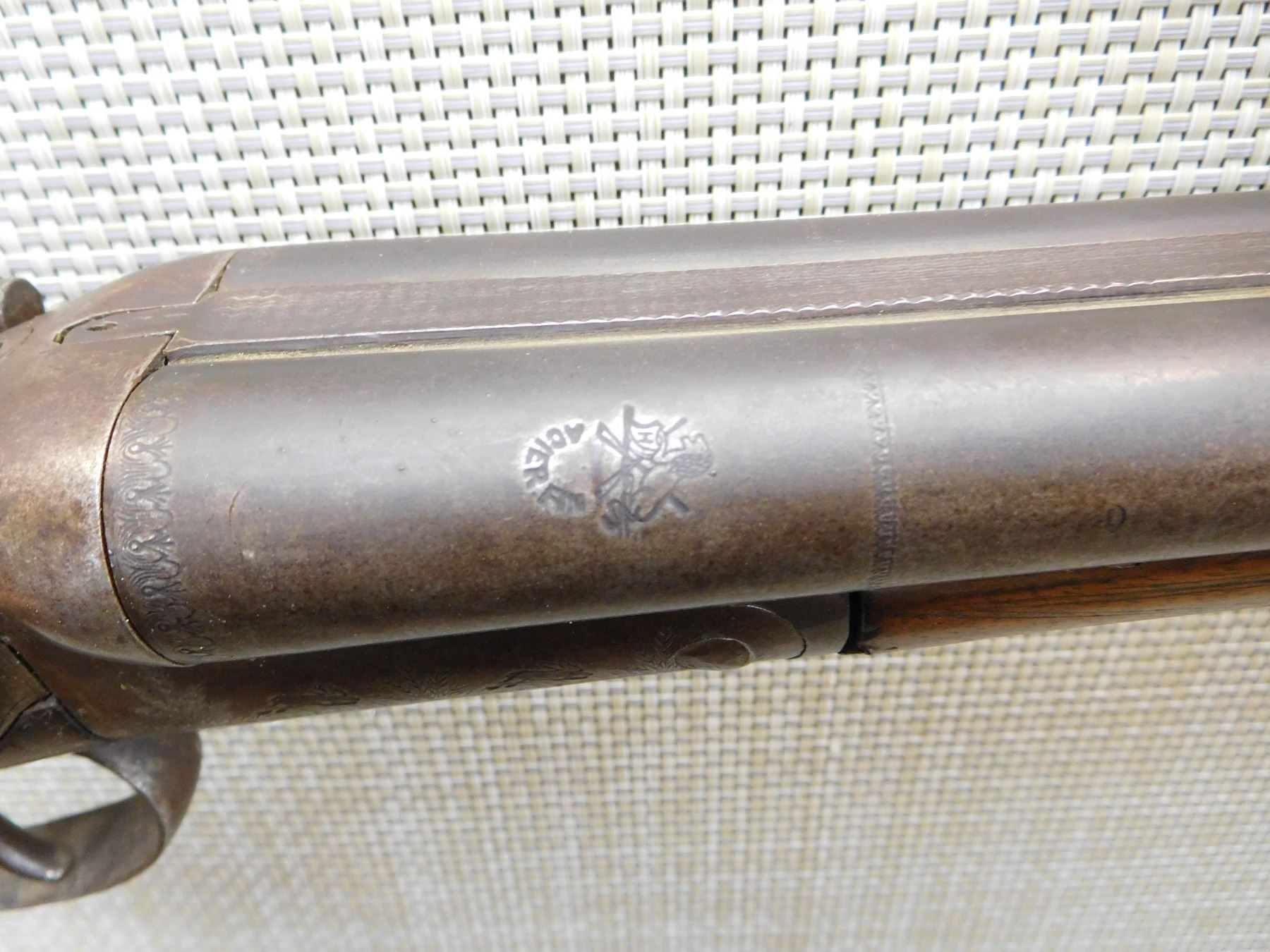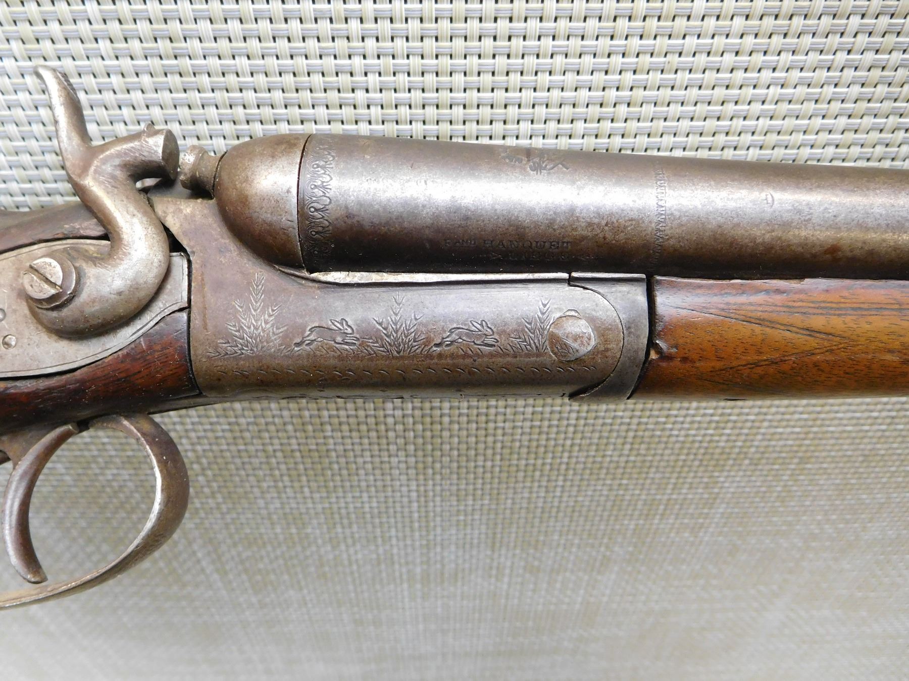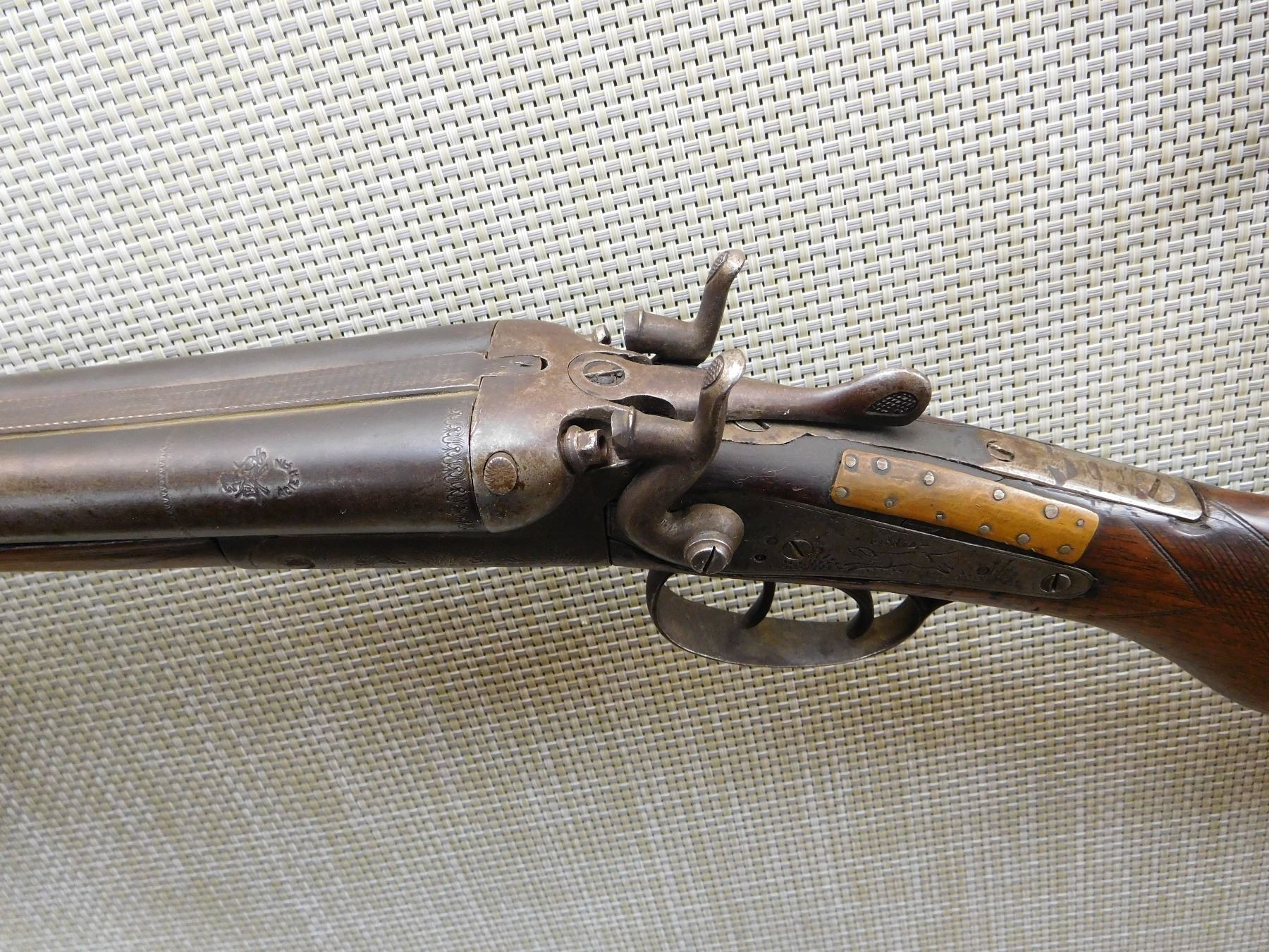 CHOKES ARE FIXED FULL AND MODIFIED, REPAIRED AT THE WRIST AND A WELDED TANG, STEEL BUTT PLATE, GOOD BORES, RIGHT HAMMER SPRING IS BROKEN, ONE SLING SWIVEL OTHER IS MISSING , ACTION: SIDE BY SIDE BREAK ACTION DOUBLE HAMMERS DOUBLE TRIGGERS , BARREL LENGTH: 29 1/2" , STOCK # 7206 , SERIAL # 7473 , CONDITION: 3/10 , CLASS: CANADIAN NON RESTRICTED CLASS