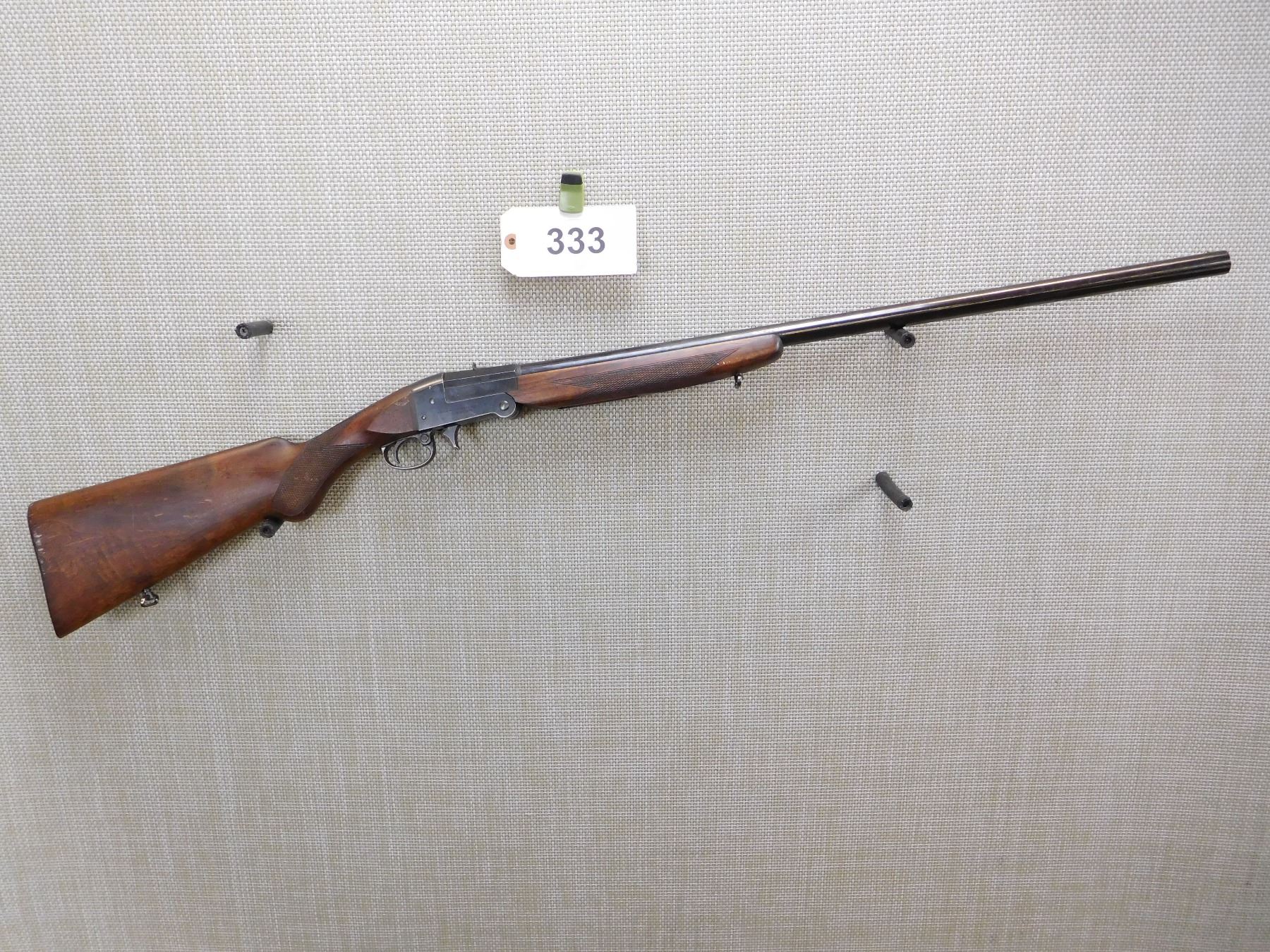 HAS AN EJECTOR, FIXED FULL CHOKE, VERY GOOD BORE, SLING SWIVEL STUDS, BEAD FRONT SIGHT, FIXED REAR SIGHT, CHECKERED FOREND AND SEMI PISTOL GRIP BUTT STOCK, FOLDS IN HALF FOR EASE OF TRANSPORT , ACTION: SINGLE SHOT SHOTT , BARREL LENGTH: 28" , STOCK # 7225 , SERIAL # D015953 , CONDITION: 7/10 , CLASS: CANADIAN NON RESTRICTED CLASS