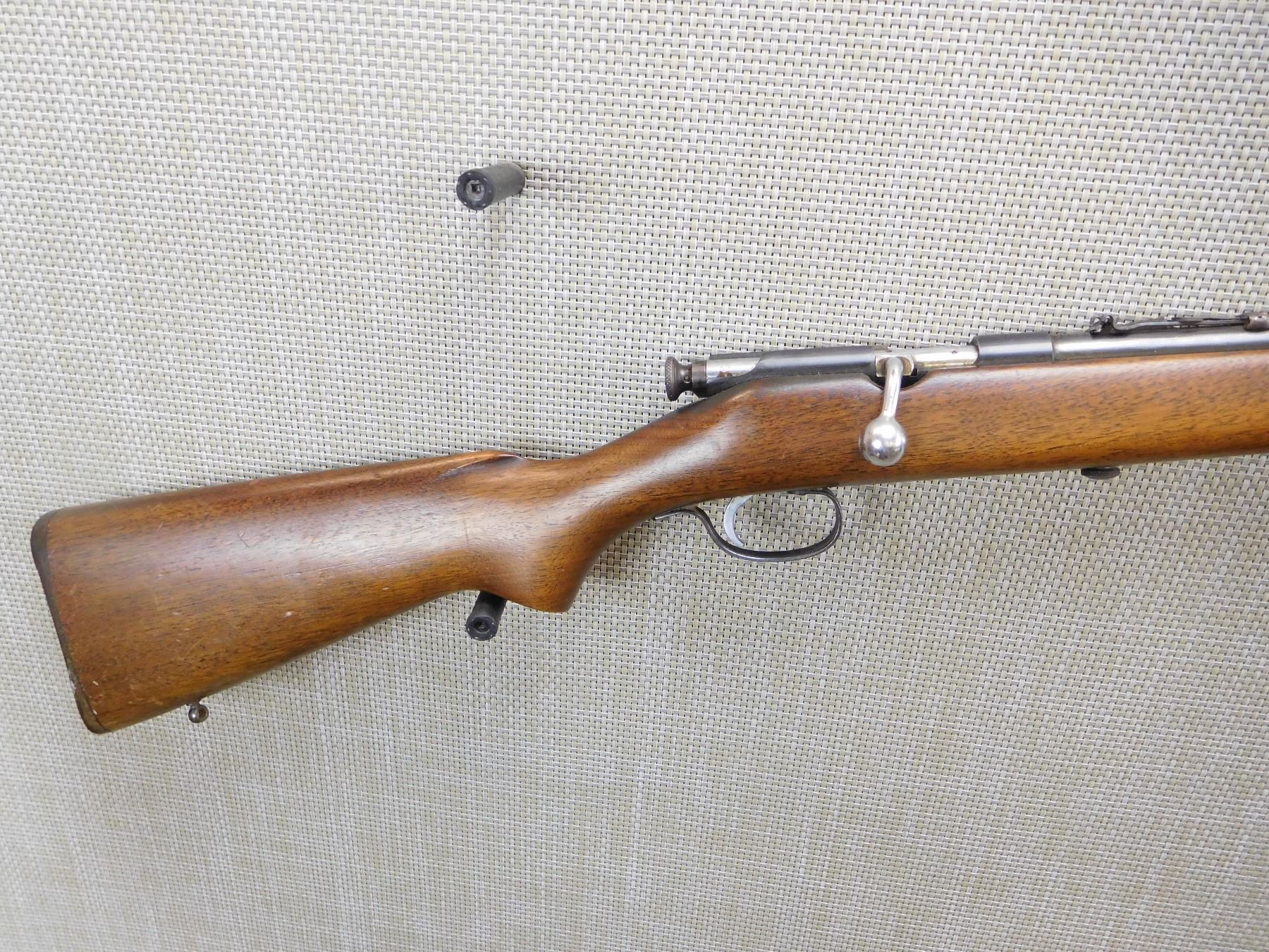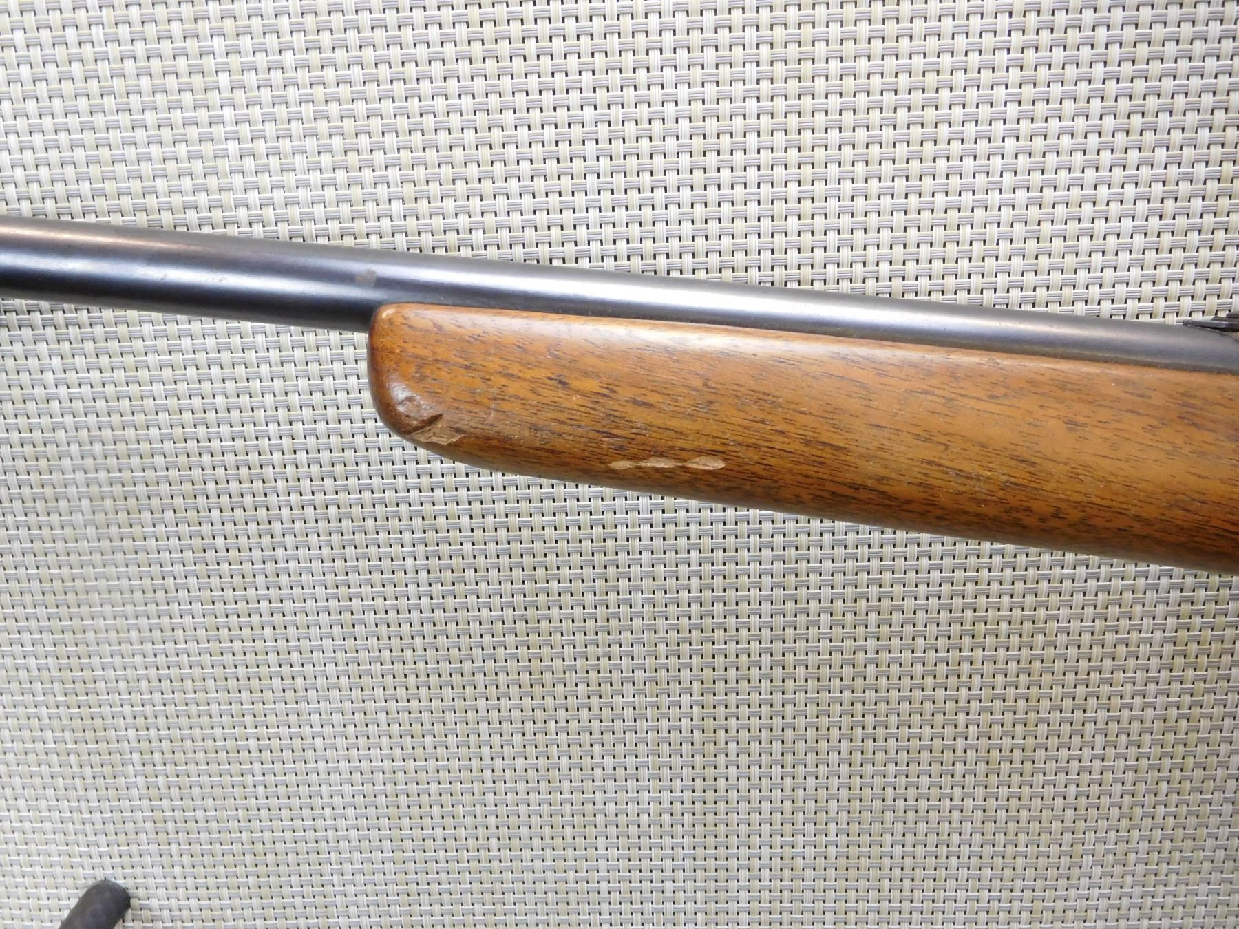 HOODED FRONT SIGHT AND FULLY ADJUSTABLE REAR SIGHT, BORE IS EXCELLENT, ONE PIECE HARDWOOD STOCK WITH ONE SLING SWIVEL LOOP, MISSING THE FRONT SLING SWIVEL LOOP, SOME DINGS IN THE WOOD IN THE FOREND, MISSING THE REAR PEEP APERTURE SIGHT, HARD RUBBER BUTT PLATE , ACTION: SINGLE SHOT RIFLE , BARREL LENGTH: 26" , STOCK # 7227 , SERIAL # 02934770 , CONDITION: 6/10 , CLASS: CANADIAN NON RESTRICTED CLASS
