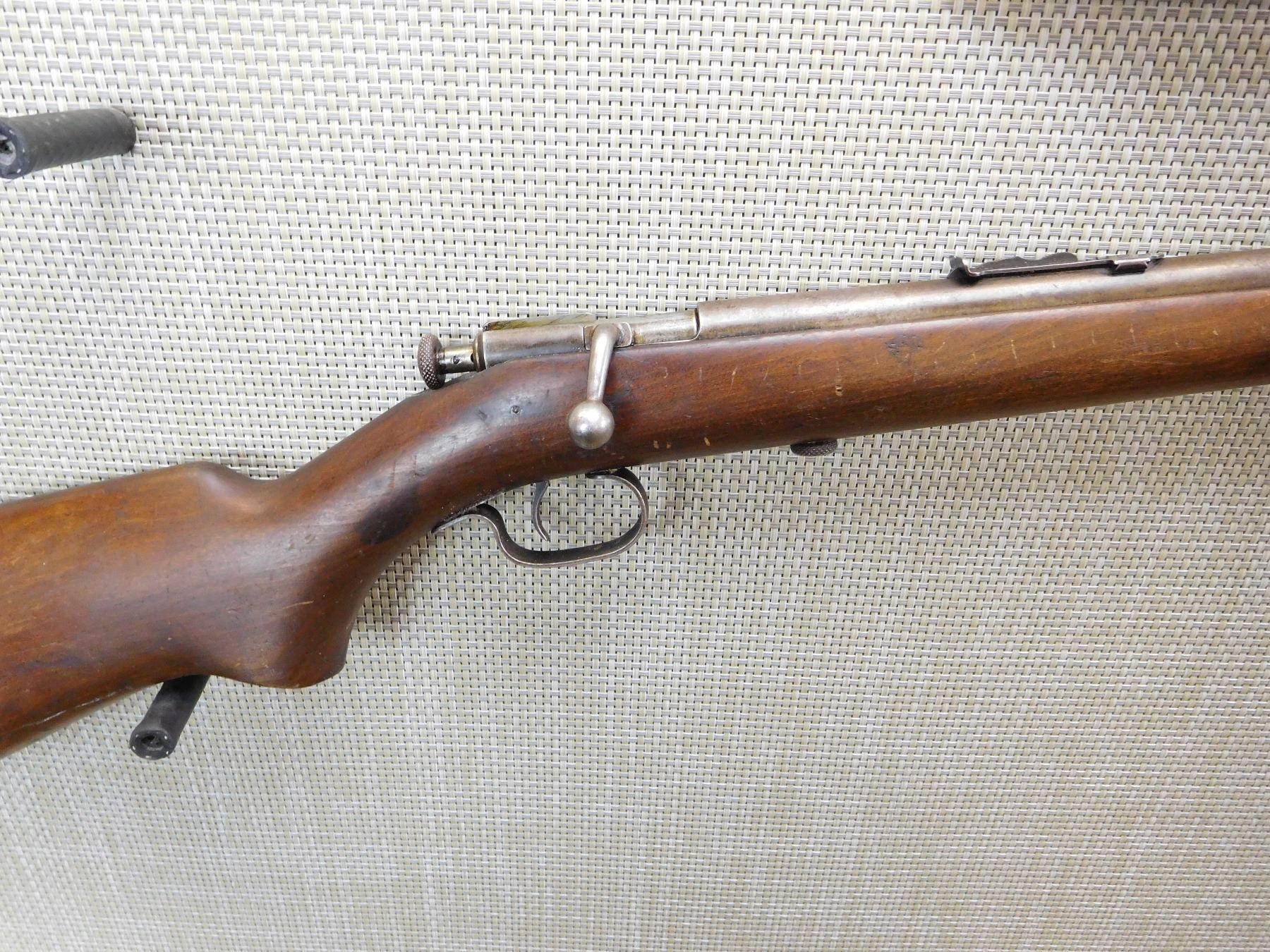 BORE IS DARK, OVERALL LIGHTLY RUSTED, HARD RUBBER BUTT PLATE, FIXED FRONT AND ADJUSTABLE REAR SIGHT , ACTION: BOLT ACTION SINGLE SHOT RIFLE , BARREL LENGTH: 23" , STOCK # 7285 , SERIAL # N/A , CONDITION: 5/10 , CLASS: CANADIAN NON RESTRICTED CLASS