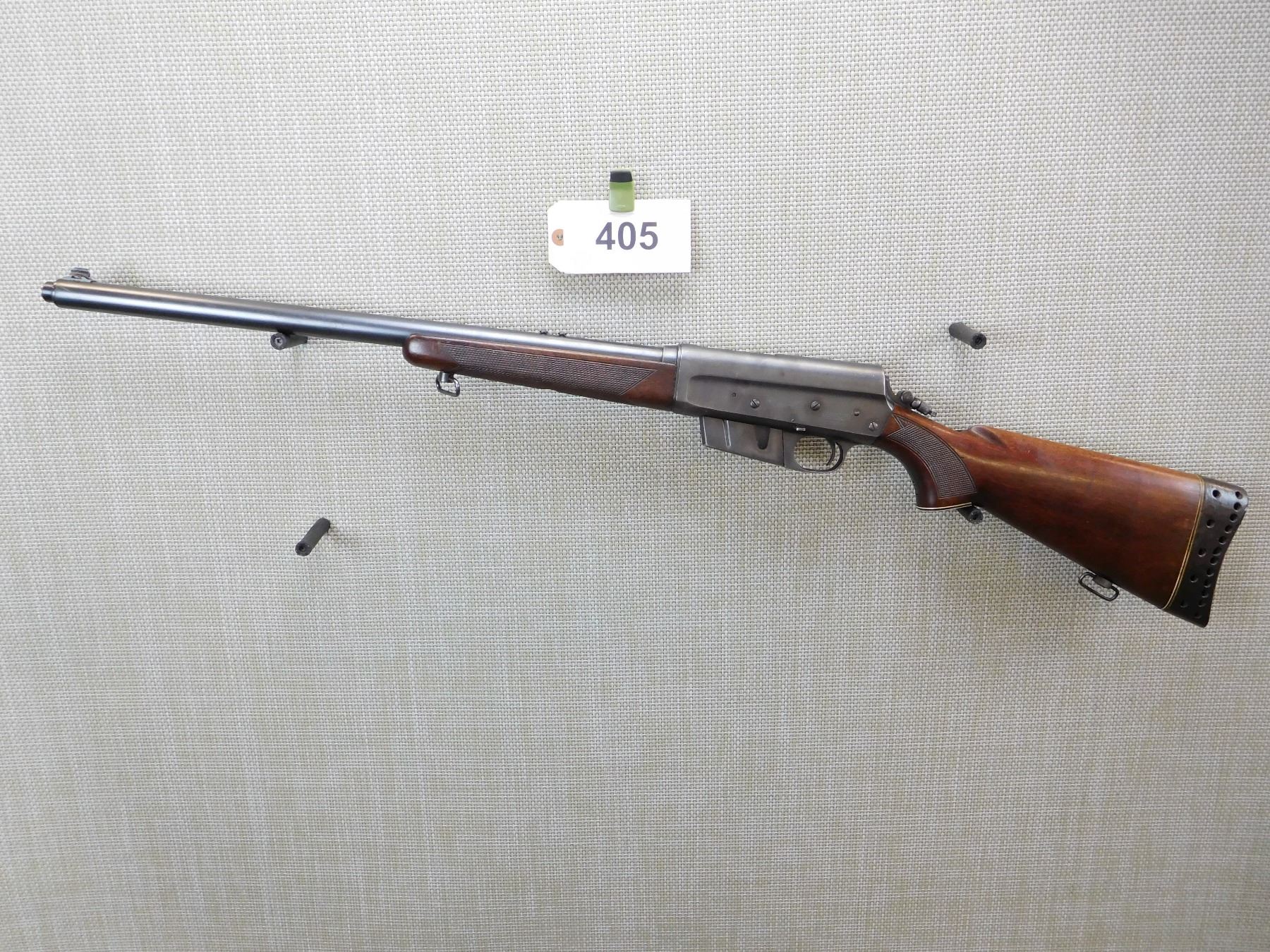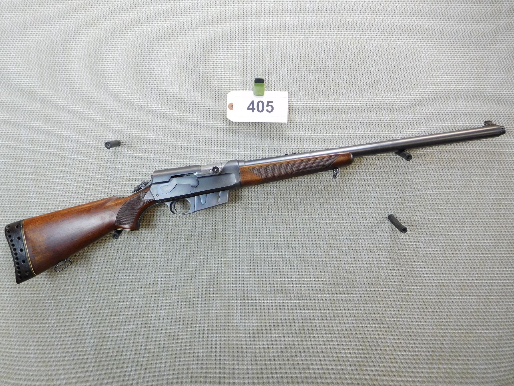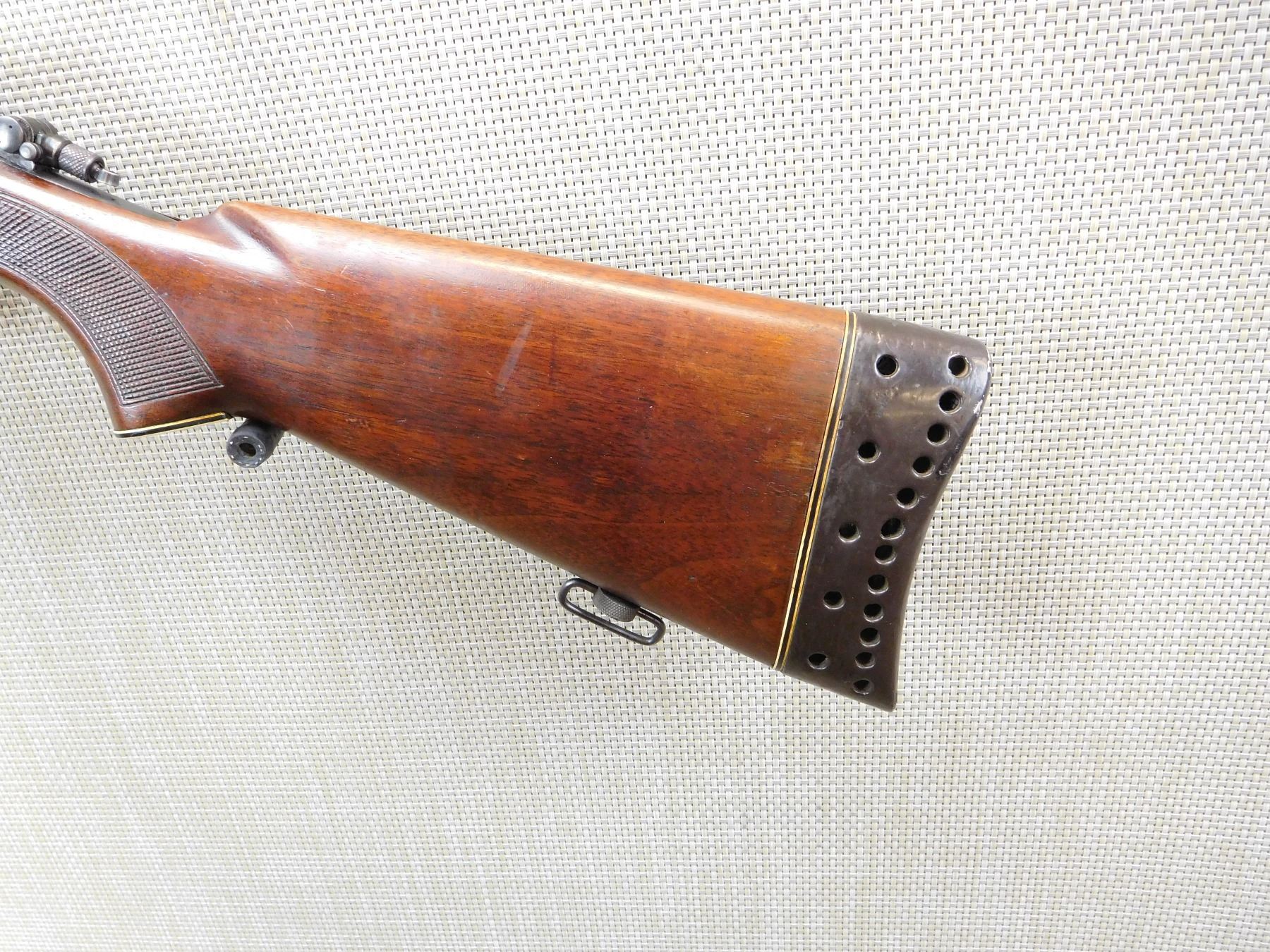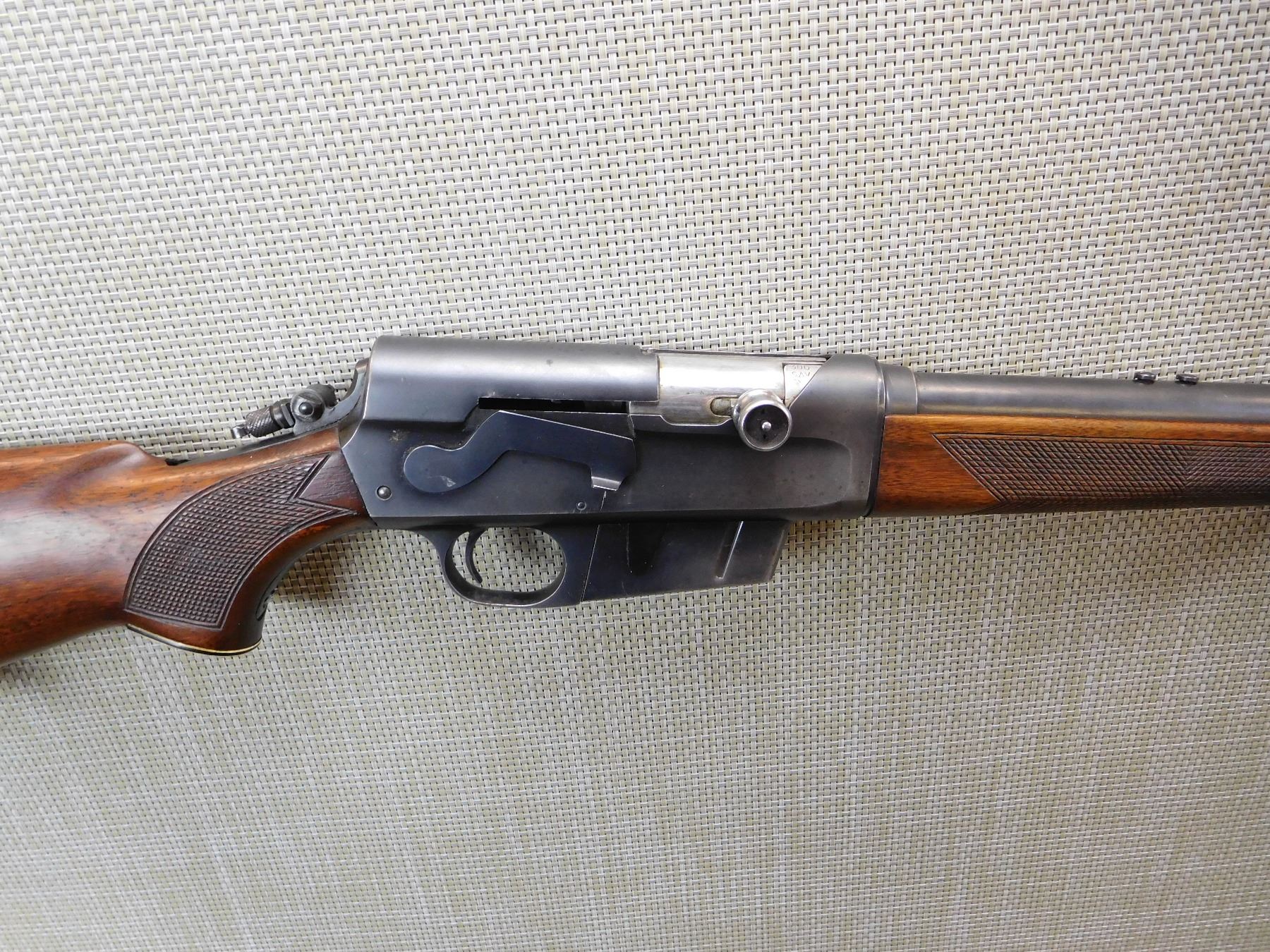 LYMAN TANG SIGHT, DOVETAIL FRONT SIGHT, CHECKERED FOREND AND CAPPED PISTOL GRIP, EXTENDED RUBBER RECOIL PAD, SLING SWIVELS, BORE IS VERY GOOD, , ACTION: SEMI AUTOMATIC RIFLE , BARREL LENGTH: 22" , STOCK # 7297 , SERIAL # 33104 , CONDITION: 7/10 , CLASS: CANADIAN NON RESTRICTED CLASS
