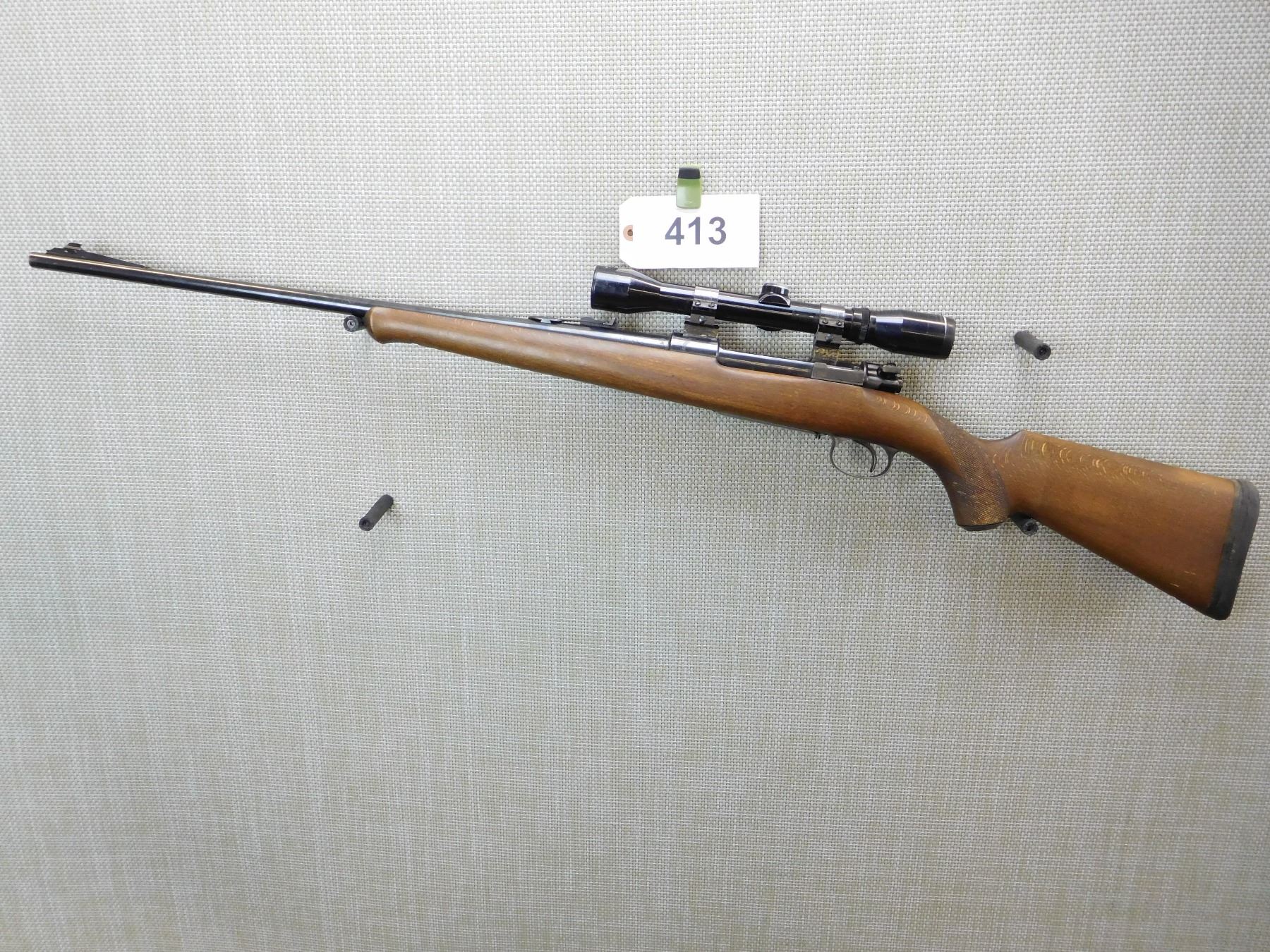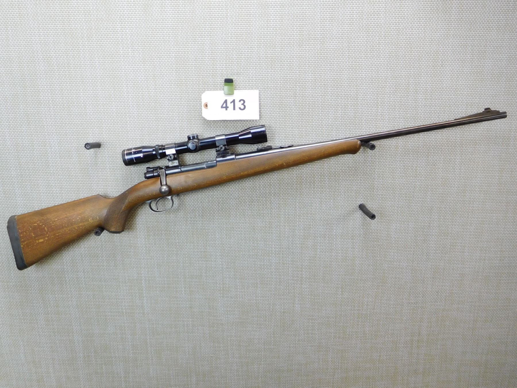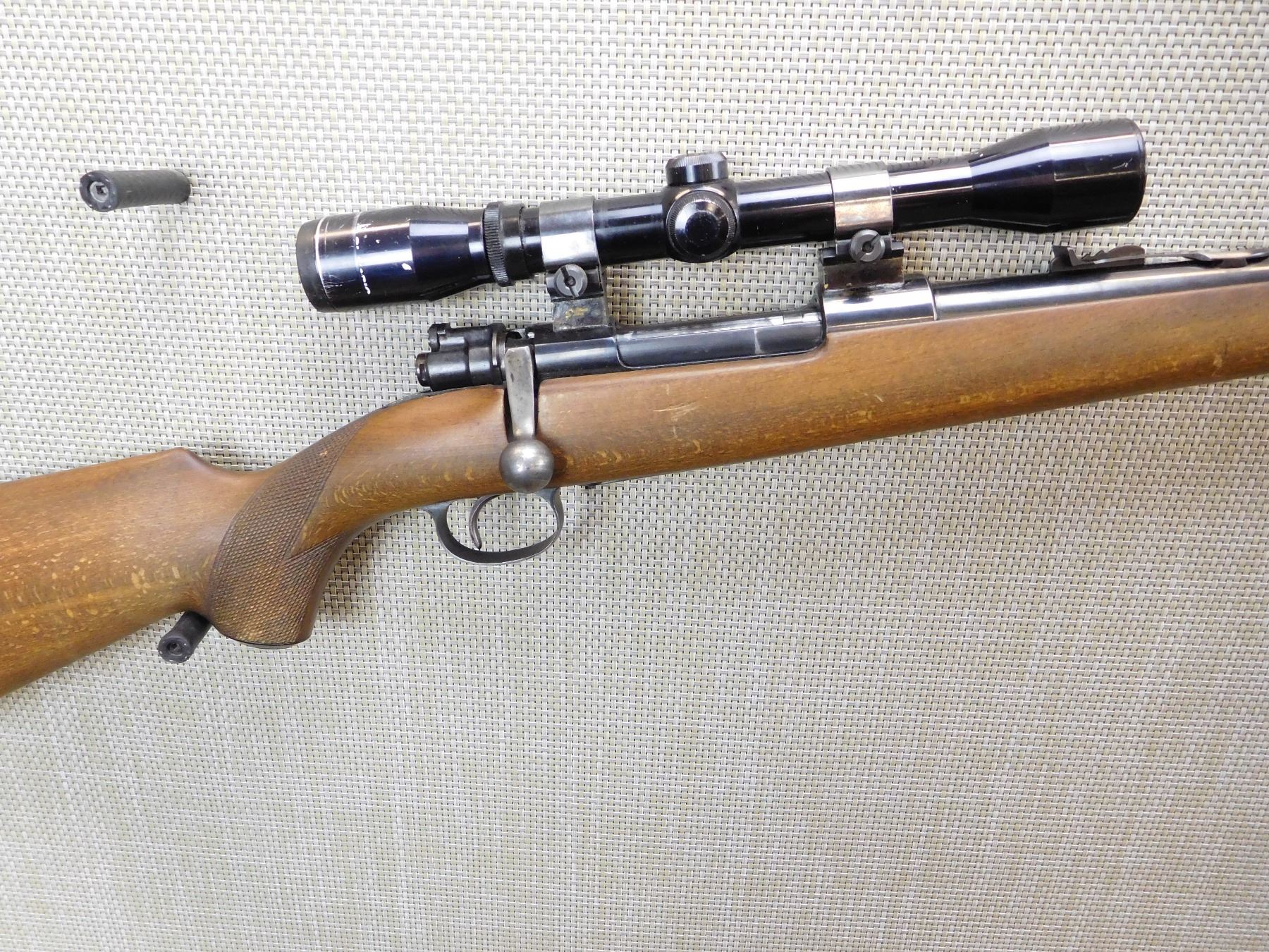 HAS A WEAVER MOUNTED UNKNOWN SCOPE, DOVETAIL RAMP AND ADJUSTABLE REAR SIGHT, CHECKERED CAPPED PISTOL GRIP STOCK WITH SCHNOBEL FOREND, MISSING SLING SWIVELS, EXCELLENT BORE, FITTED RUBBER BUTT PAD , ACTION: BOLT ACTION RIFLE , BARREL LENGTH: 24" , STOCK # 7305 , SERIAL # 190358 , CONDITION: 6/10 , CLASS: CANADIAN NON RESTRICTED CLASS