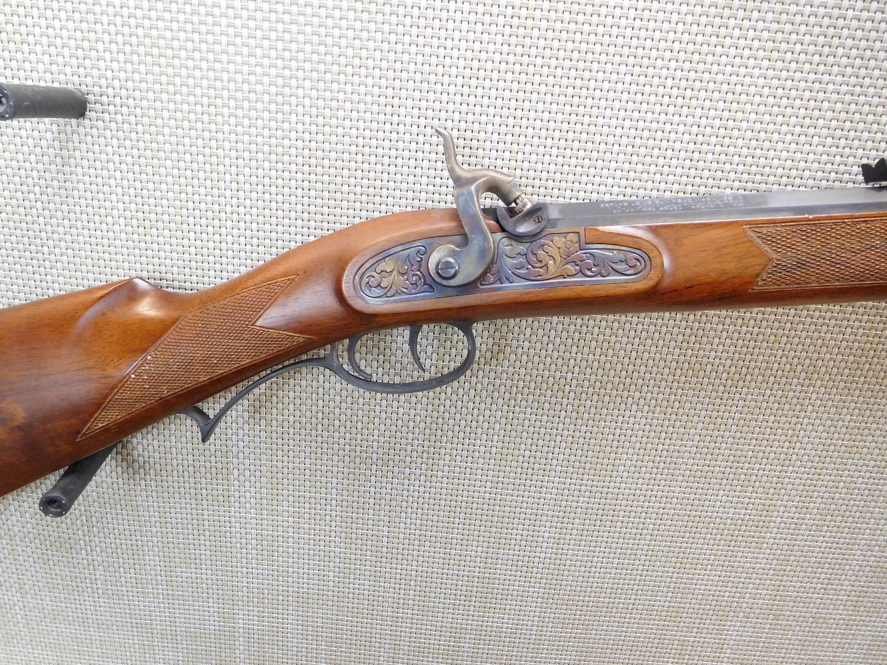 OCTAGONAL BARREL, DOVETAIL FRONT AND ADJUSTABLE REAR SIGHTS, CHECKERED FOREND AND STRAIGHT BUTT STOCK, SET TRIGGER, VENTED RECOIL PAD, SCROLL ENGRAVED SIDEPLATE, DRILLED FOR A TANG SIGHT, BORE IS GOOD , ACTION: SINGLE SHOT BLACK POWDER , BARREL LENGTH: 22" , STOCK # 7319 , SERIAL # 517351 , CONDITION: 8/10 , CLASS: CANADIAN NON RESTRICTED CLASS