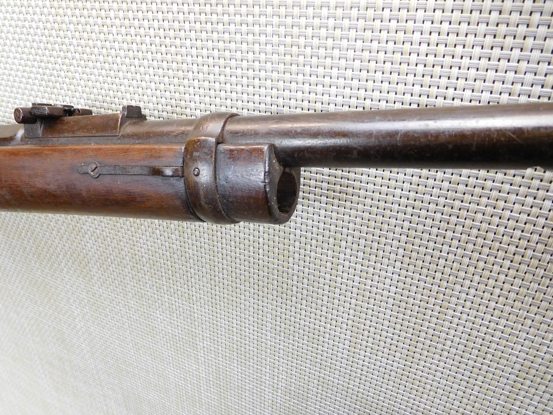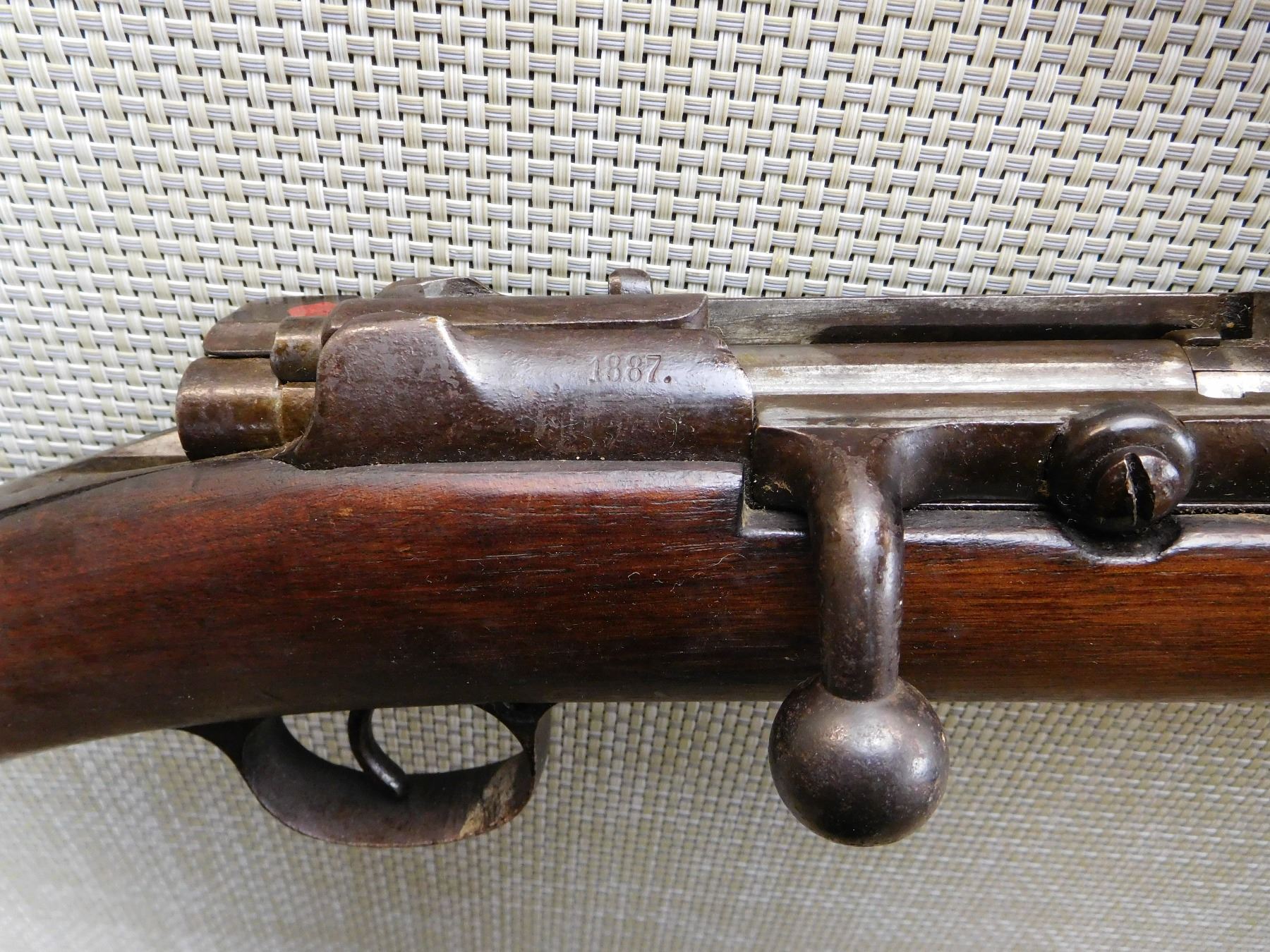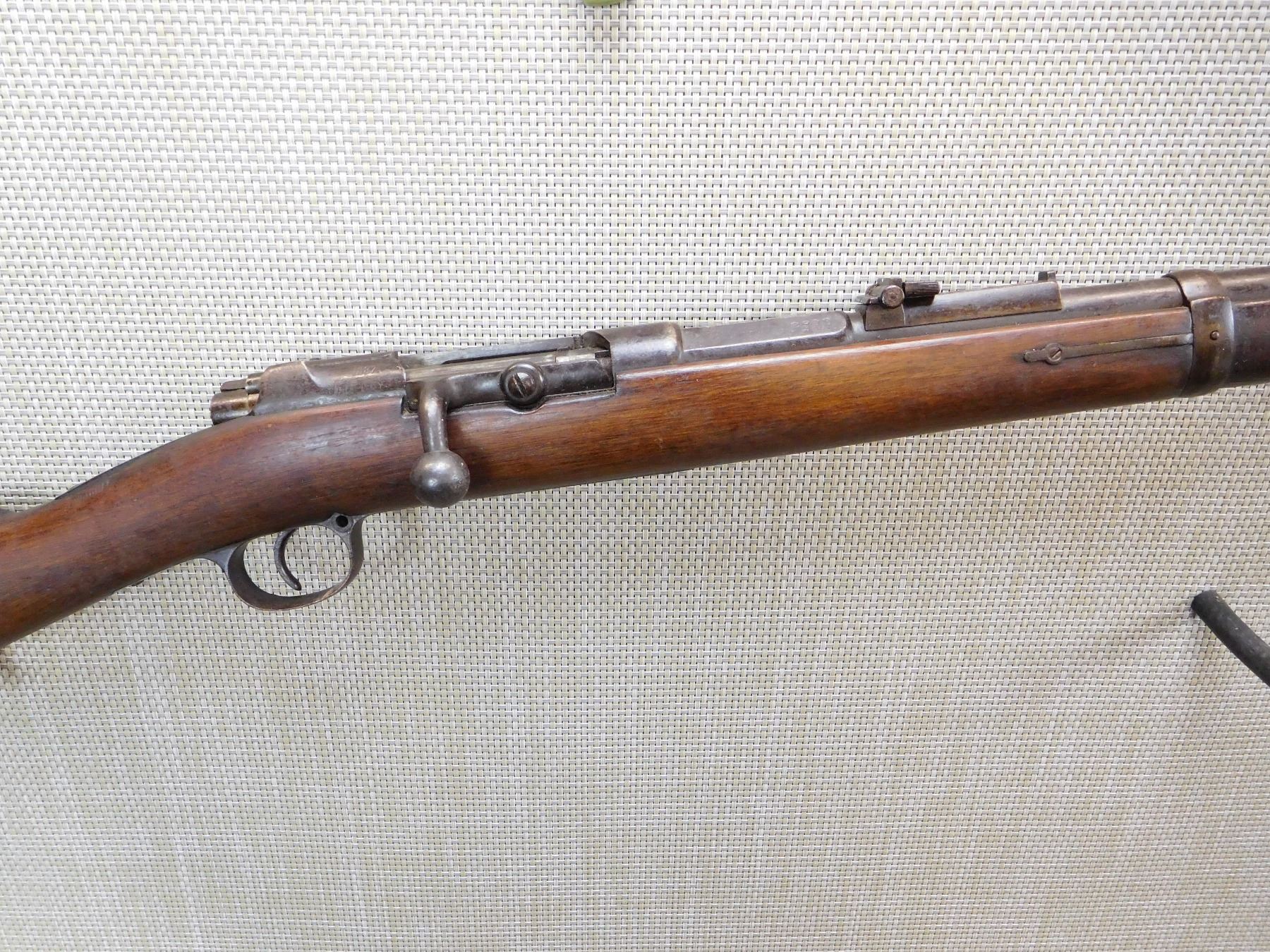 SPORTERIZED MILITARY STOCK, MADE IN 1887, MISSING THE MAGAZINE TUBE, REPLACED FRONT SIGHT, REAR SIGHT IS MISSING THE LADDER, BORE IS DARK , ACTION: BOLT ACTION RIFLE , BARREL LENGTH: 23" , STOCK # 7333 , SERIAL # 3525 , CONDITION: 3/10 , CLASS: CANADIAN NON RESTRICTED CLASS