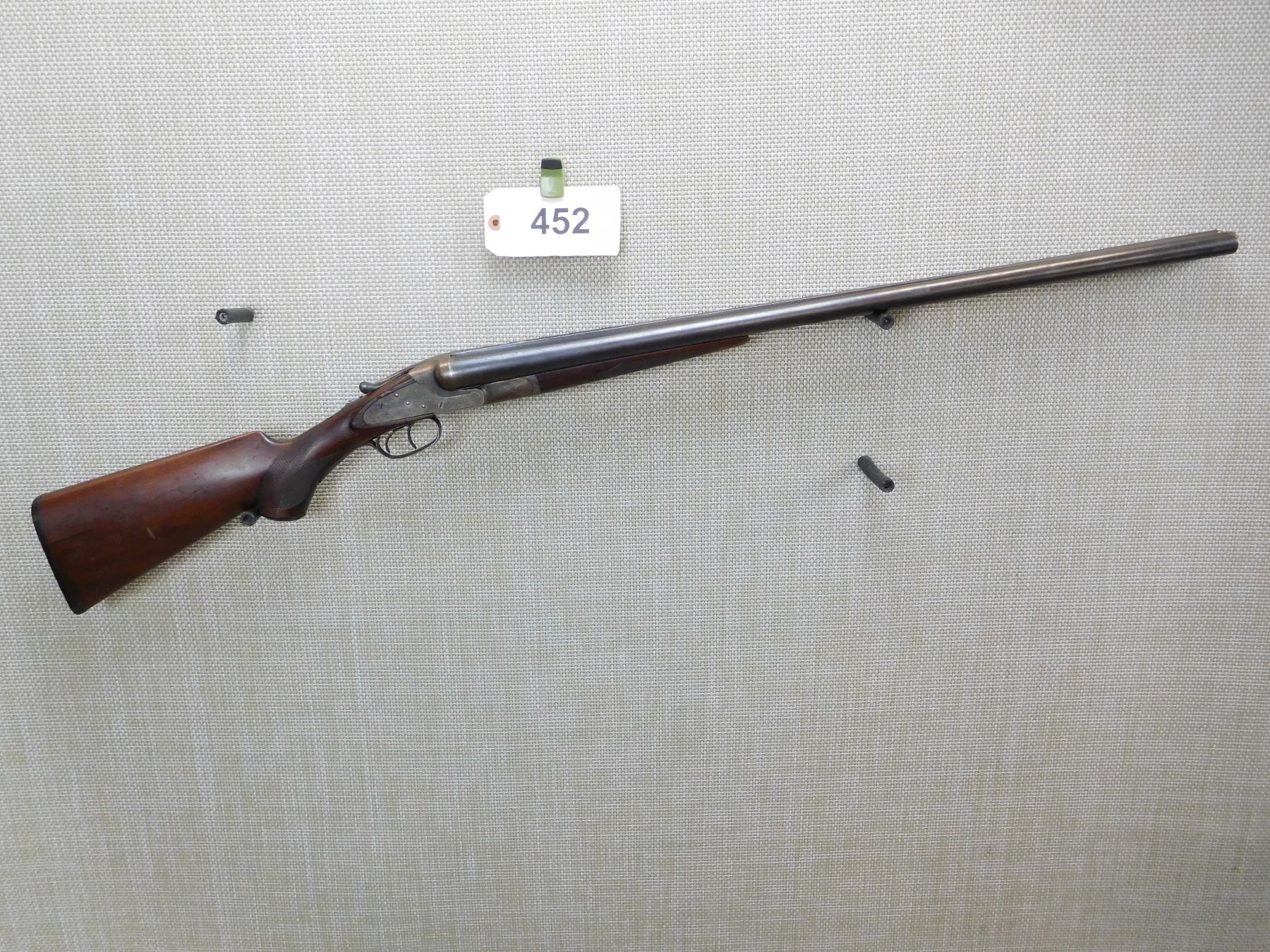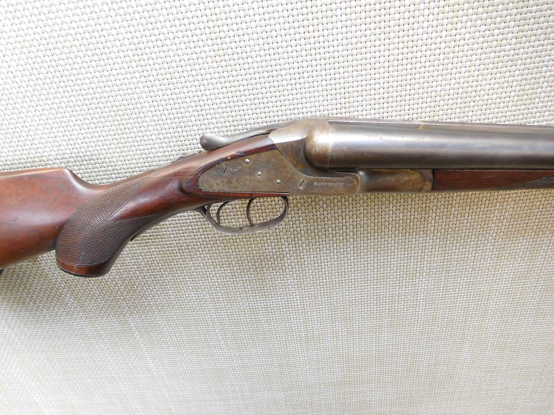MANUFACTURED BY BAKER, FULL AND MODIFIED CHOKES, BEAD FRONT SIGHT, VERY GOOD BORES, SMALL CRACK AT THE WRIST, LIGHT SURFACE PITTING ON THE BARREL, CHECKERED FOREND AND CAPPED PISTOL GRIP BUTT STOCK, MINOR CRACKS IN BUTT STOCK AND CHIP AT THE TANG, HARD RUBBER BUTT PAD THAT HAS A CRACK , ACTION: SIDE BY SIDE SHOTGUN , BARREL LENGTH: 28" , STOCK # 7344 , SERIAL # 50496 , CONDITION: 5/10 , CLASS: CANADIAN NON RESTRICTED CLASS
