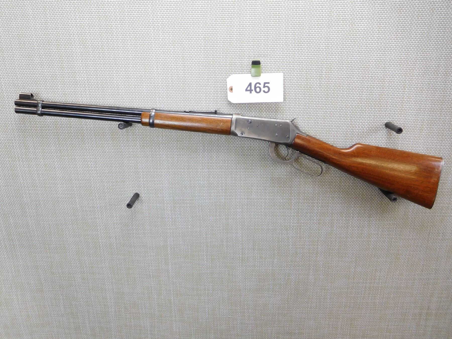 MANUFACTURED IN 1964, HOODED DOVETAIL RAMP FRONT RAMP AND ADJUSTABLE REAR SIGHT, BORE IS GOOD, STEEL BUTT PLATE , ACTION: LEVER ACTION RIFLE , BARREL LENGTH: 20" , STOCK # 7357 , SERIAL # 2742324 , CONDITION: 7/10 , CLASS: CANADIAN NON RESTRICTED CLASS