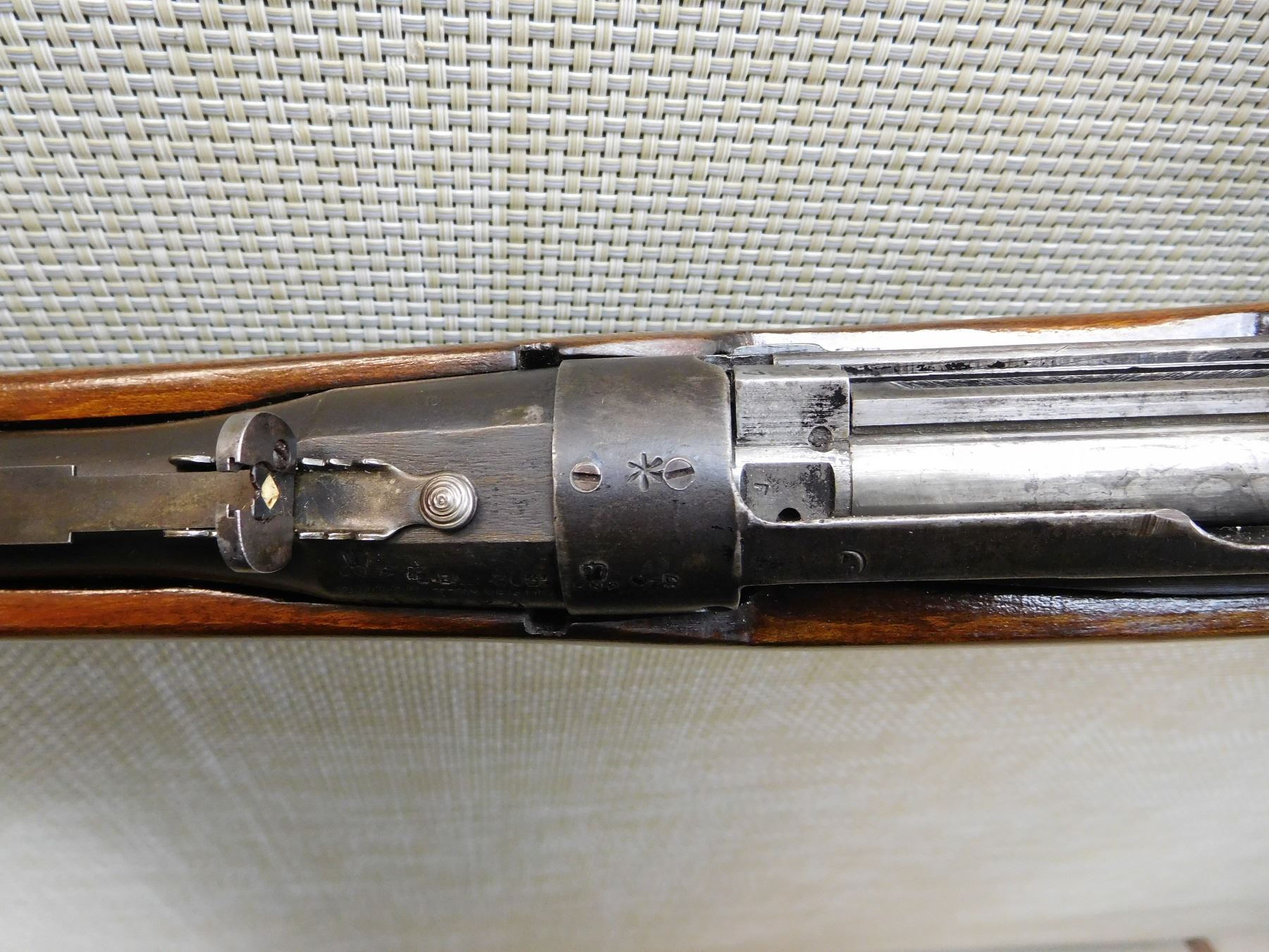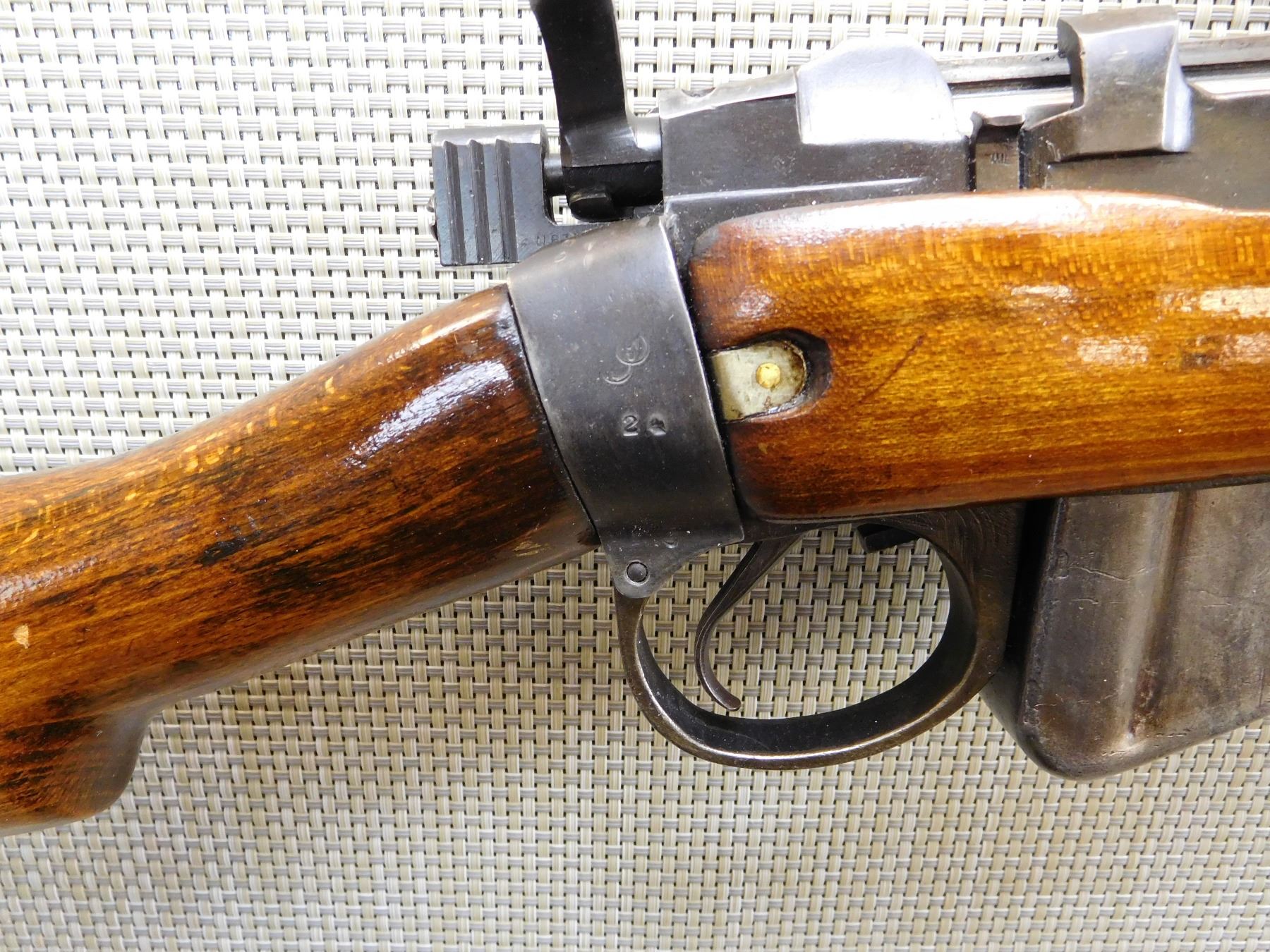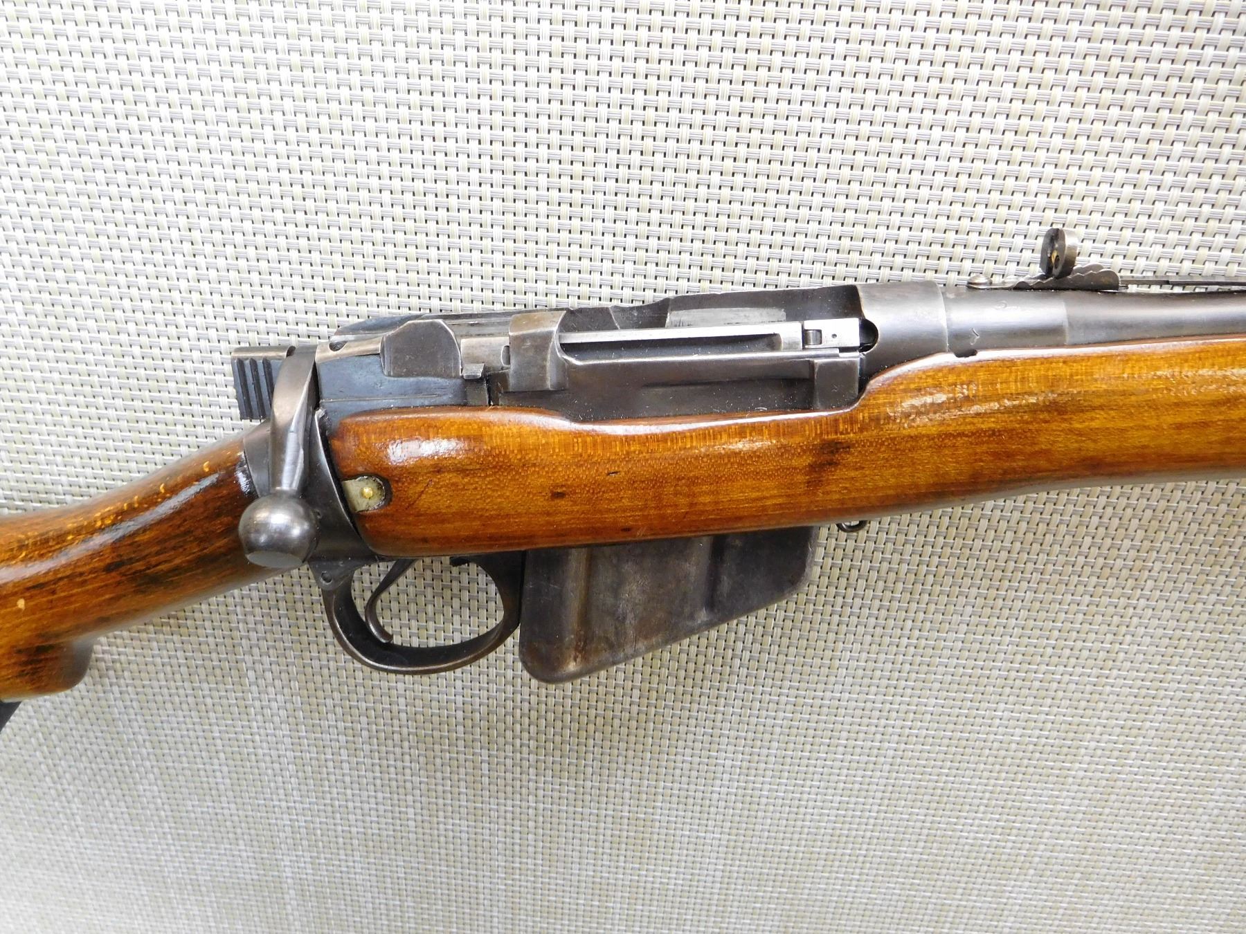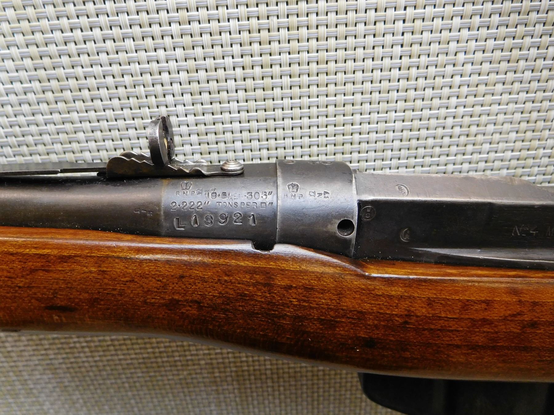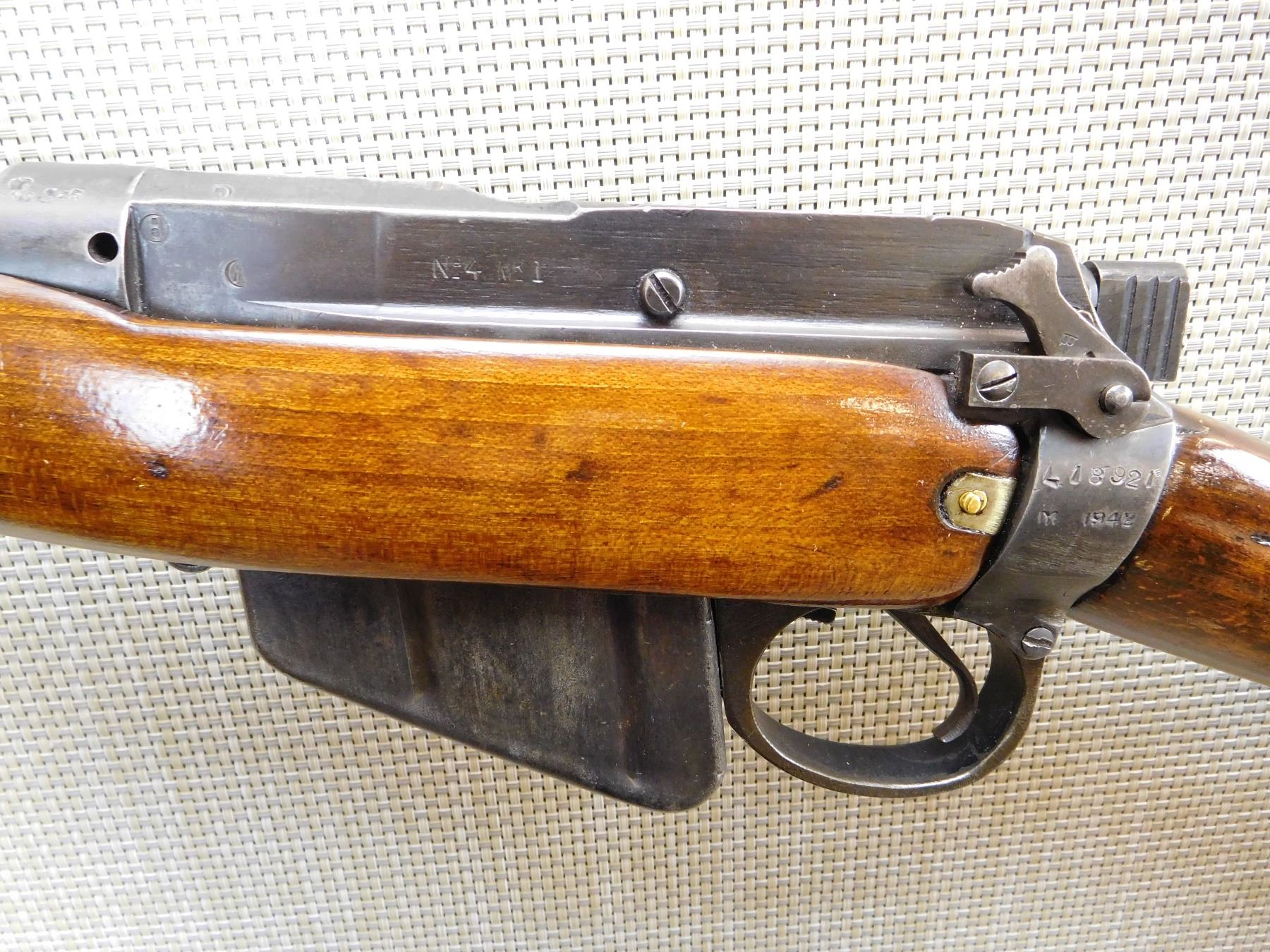 COMES WITH MAGAZINE, DATED 1942, DOVETAIL RAMP FRONT SIGHT, BUCKHORN ADJUSTABLE REAR SIGHT, SPORTERIZED STOCK, SLING SWIVELS, STEEL BUTT PLATE, GOOD BORE, ORIGINAL MILITARY REAR SIGHT REMOVED , ACTION: BOLT ACTION RIFLE , BARREL LENGTH: 22" , STOCK # 7378 , SERIAL # L18921 , CONDITION: 5/10 , CLASS: CANADIAN NON RESTRICTED CLASS