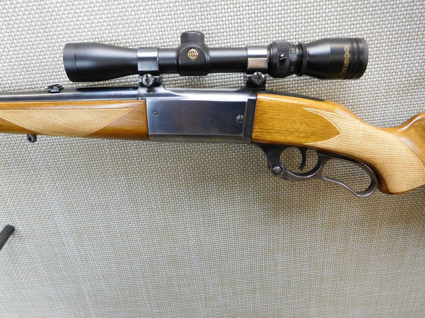HOME CHECKERED STOCK WHICH MAY BE A REPLACEMENT, DOVETAIL FRONT AND FOLDING REAR SIGHT, WEAVER 1.5 X 4.5 SCOPE, BORE IS GOOD, SLING SWIVEL STUDS, HARD RUBBER BUTT PAD , ACTION: LEVER ACTION RIFLE , BARREL LENGTH: 19" , STOCK # 7387 , SERIAL # 1085308 , CONDITION: 6/10 , CLASS: CANADIAN NON RESTRICTED CLASS