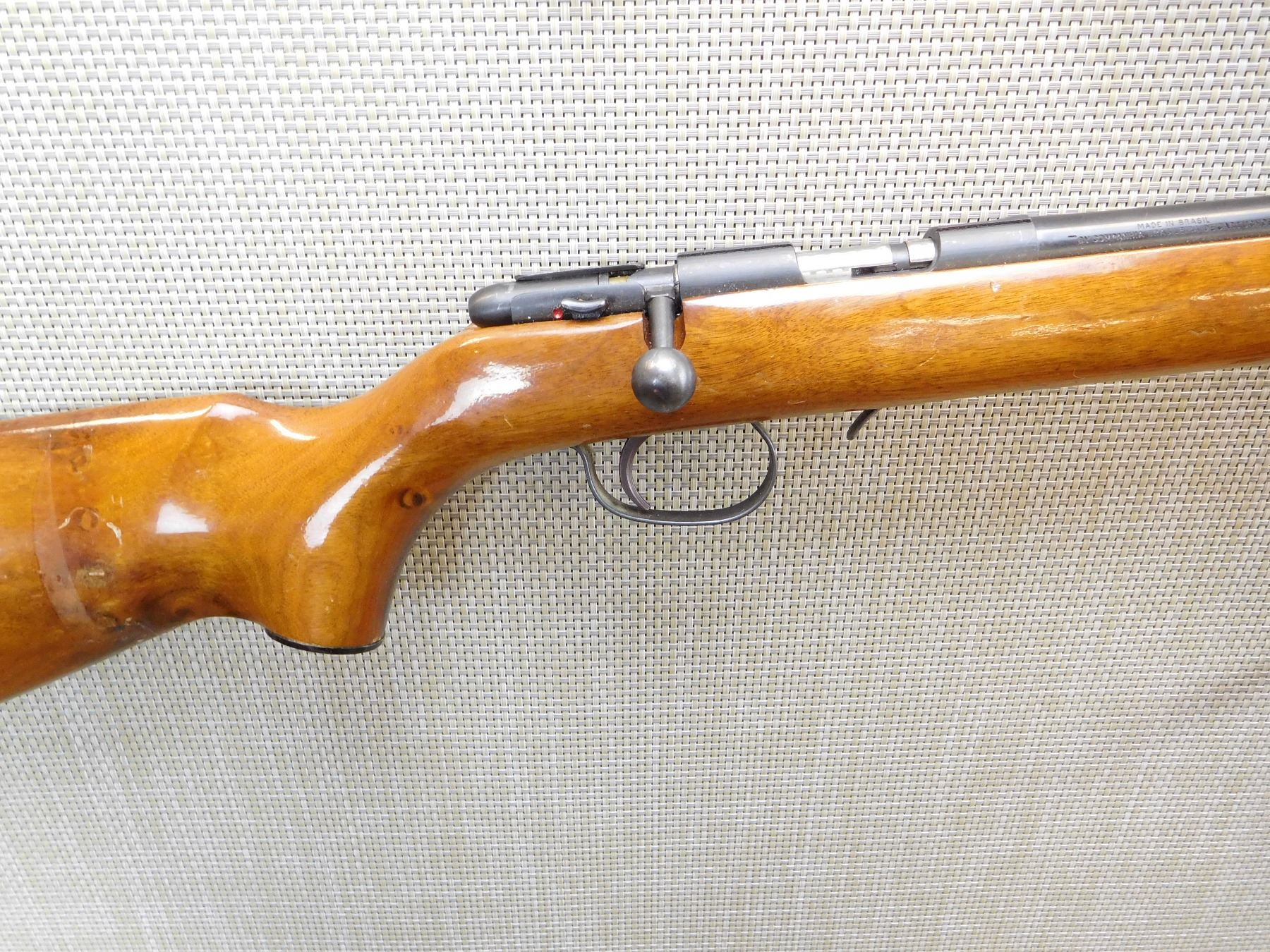 DOES NOT COME WITH MAGAZINE, GOOD BORE, SLING SWIVEL STUDS, CAPPED PISTOL GRIP STOCK, PLASTIC BUTT PLATE, OVERSIZED FRONT DOVETAILED SIGHT, NO REAR SIGHT , ACTION: BOLT ACTION REPEATER RIFLE , BARREL LENGTH: 21" , STOCK # 7409 , SERIAL # 104436 , CONDITION: 5/10 , CLASS: CANADIAN NON RESTRICTED CLASS