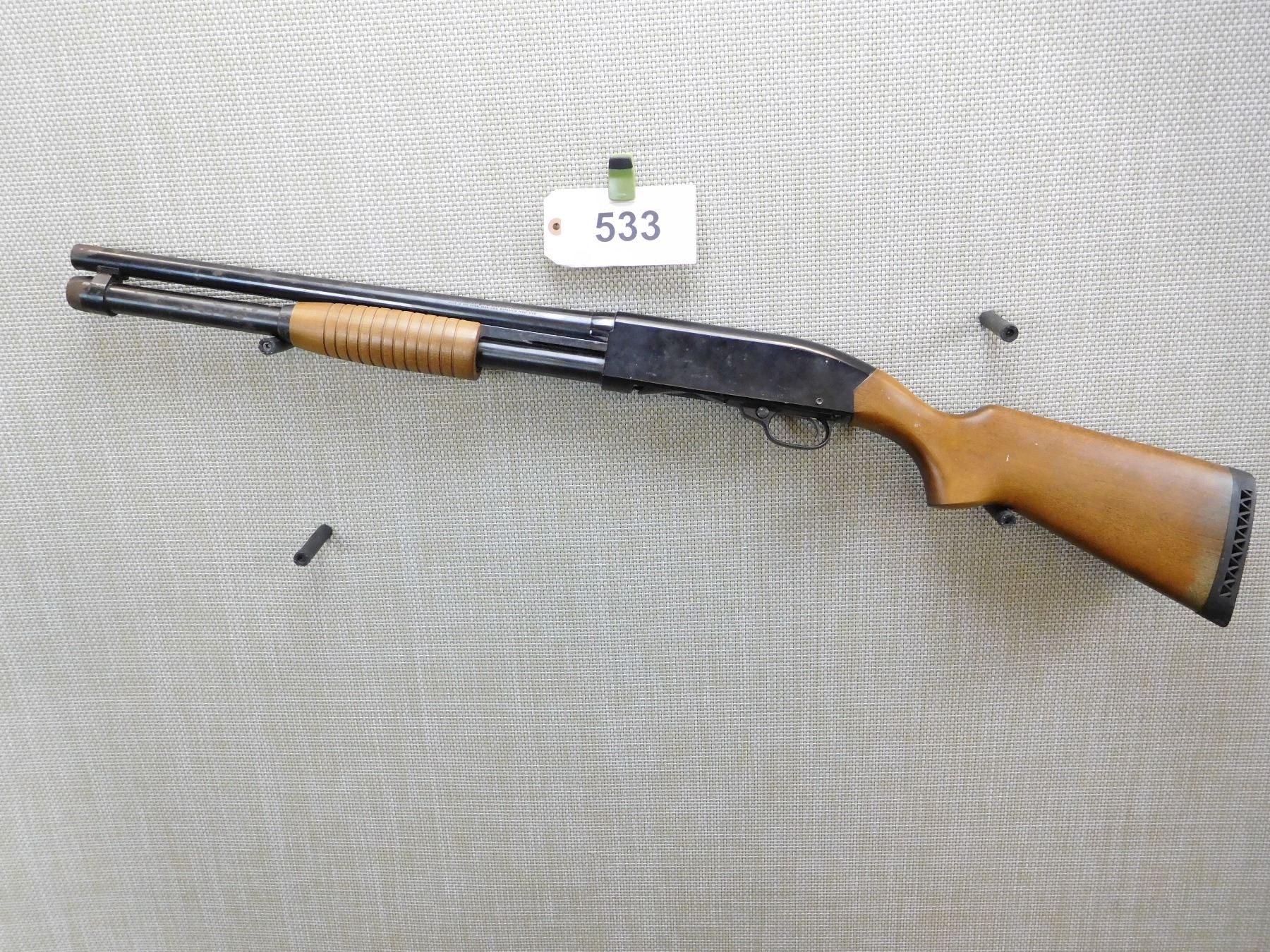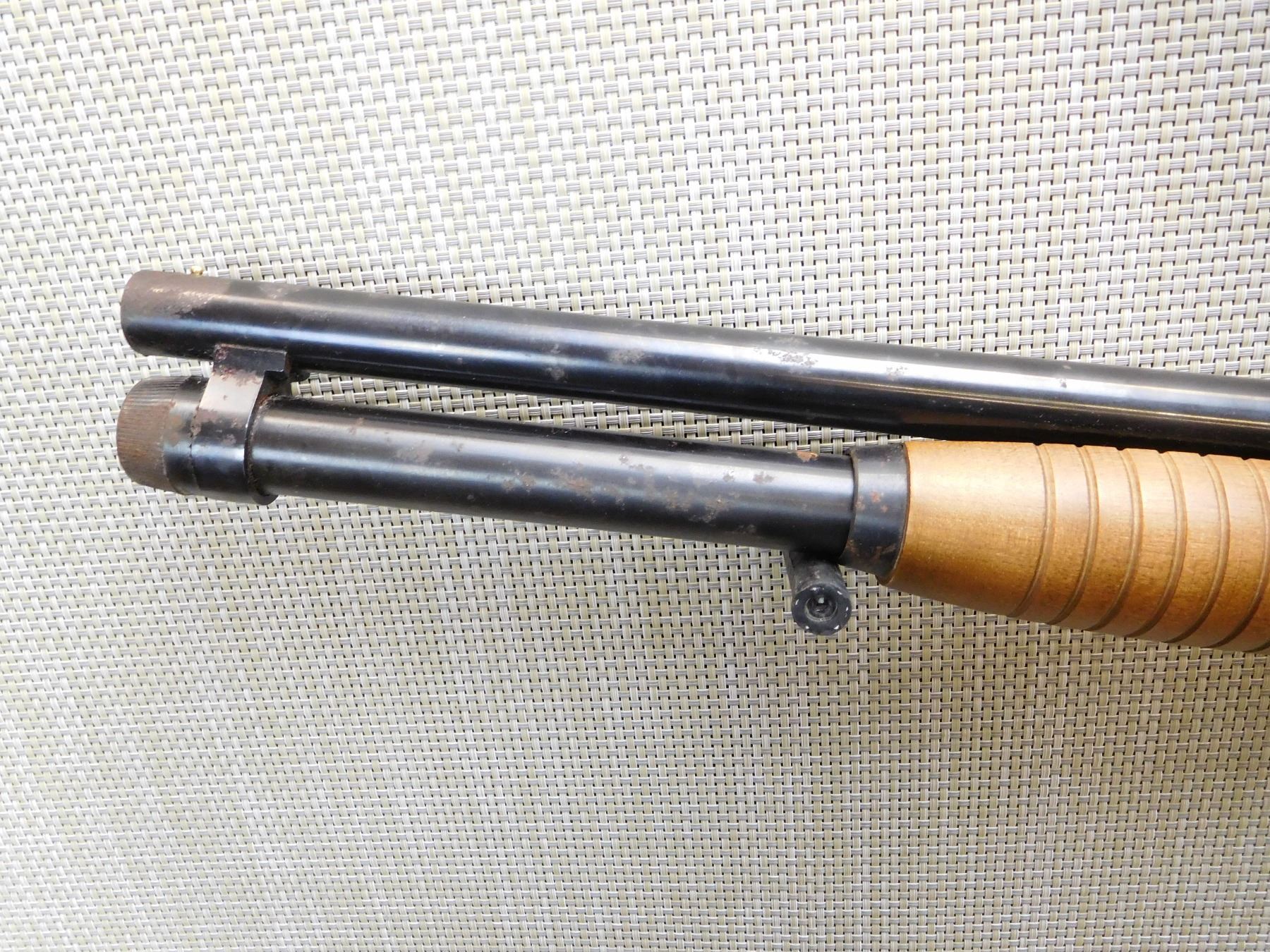 CYLINDER BORE, BORE IS GOOD, RUST AND PITTING AT MUZZLE AND ON MAGAZINE CAP, BEAD FROTN SIGHT, RUBBER VENTED RECOIL PAD , ACTION: PUMP ACTION SHOTGUN , BARREL LENGTH: 19" , STOCK # 7425 , SERIAL # L2106626 , CONDITION: 5/10 , CLASS: CANADIAN NON RESTRICTED CLASS