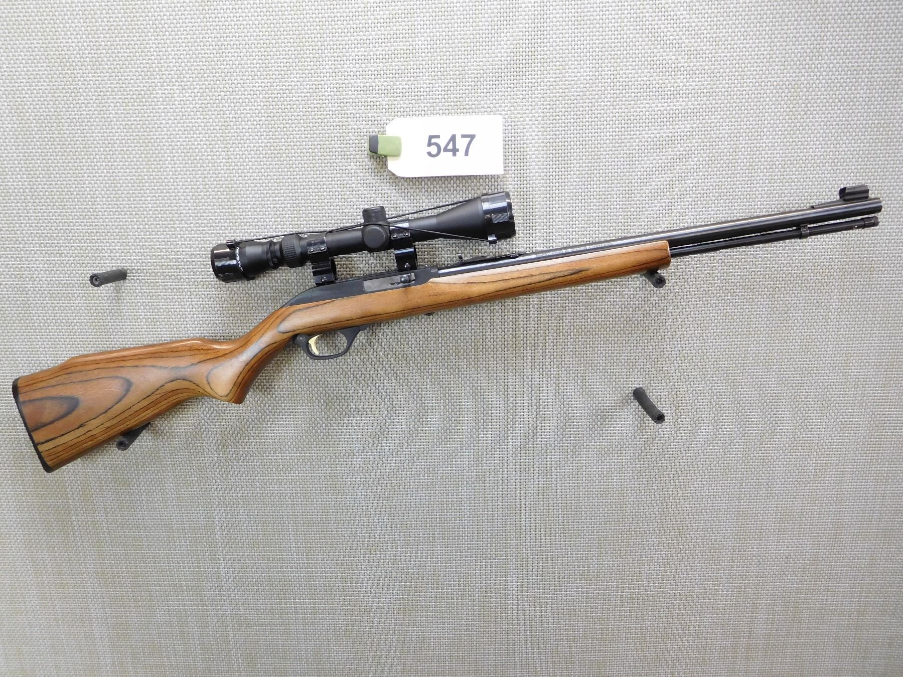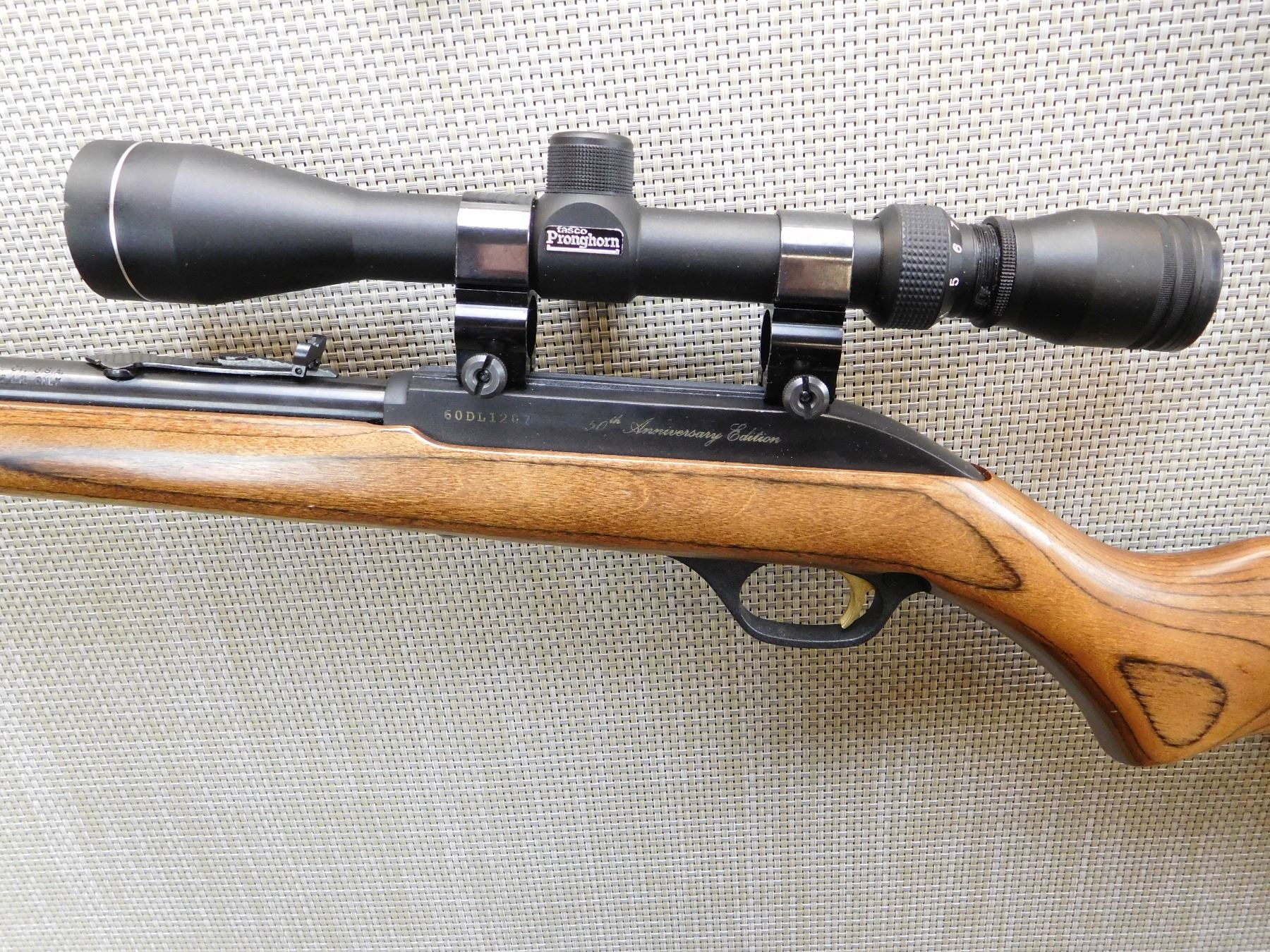 LAMINATED STOCK, TUBE MAGAZINE, ADJUSTABLE METAL SIGHTS, TASCO PRONG HORN 3 - 9 SCOPE, HARD RUBBER BUTT PLATE, BORE IS EXCELLENT , ACTION: SEMI AUTOMATIC RIFLE , BARREL LENGTH: 490MM , STOCK # 7438 , SERIAL # 60DL1207 , CONDITION: 8/10 , CLASS: CANADIAN NON RESTRICTED CLASS