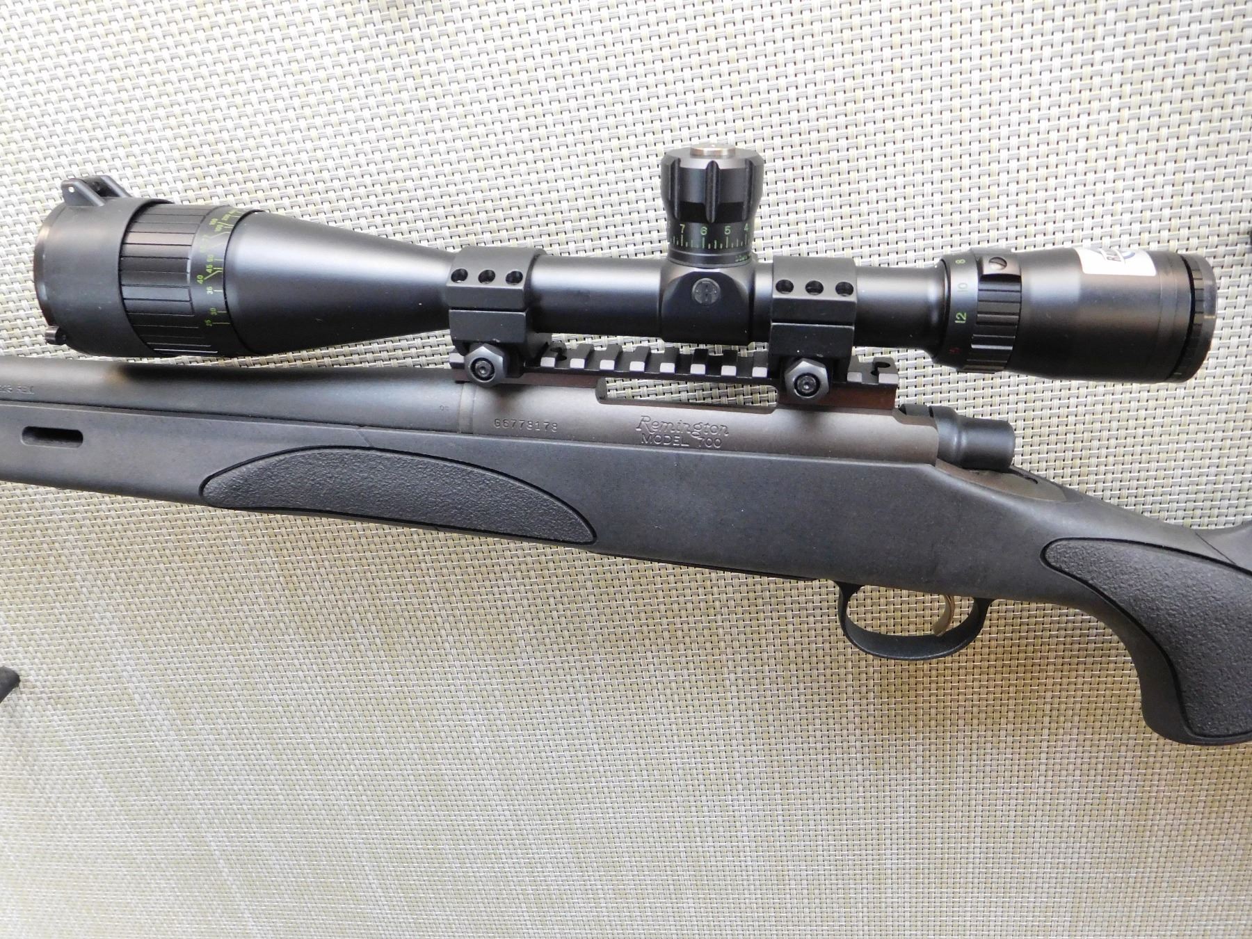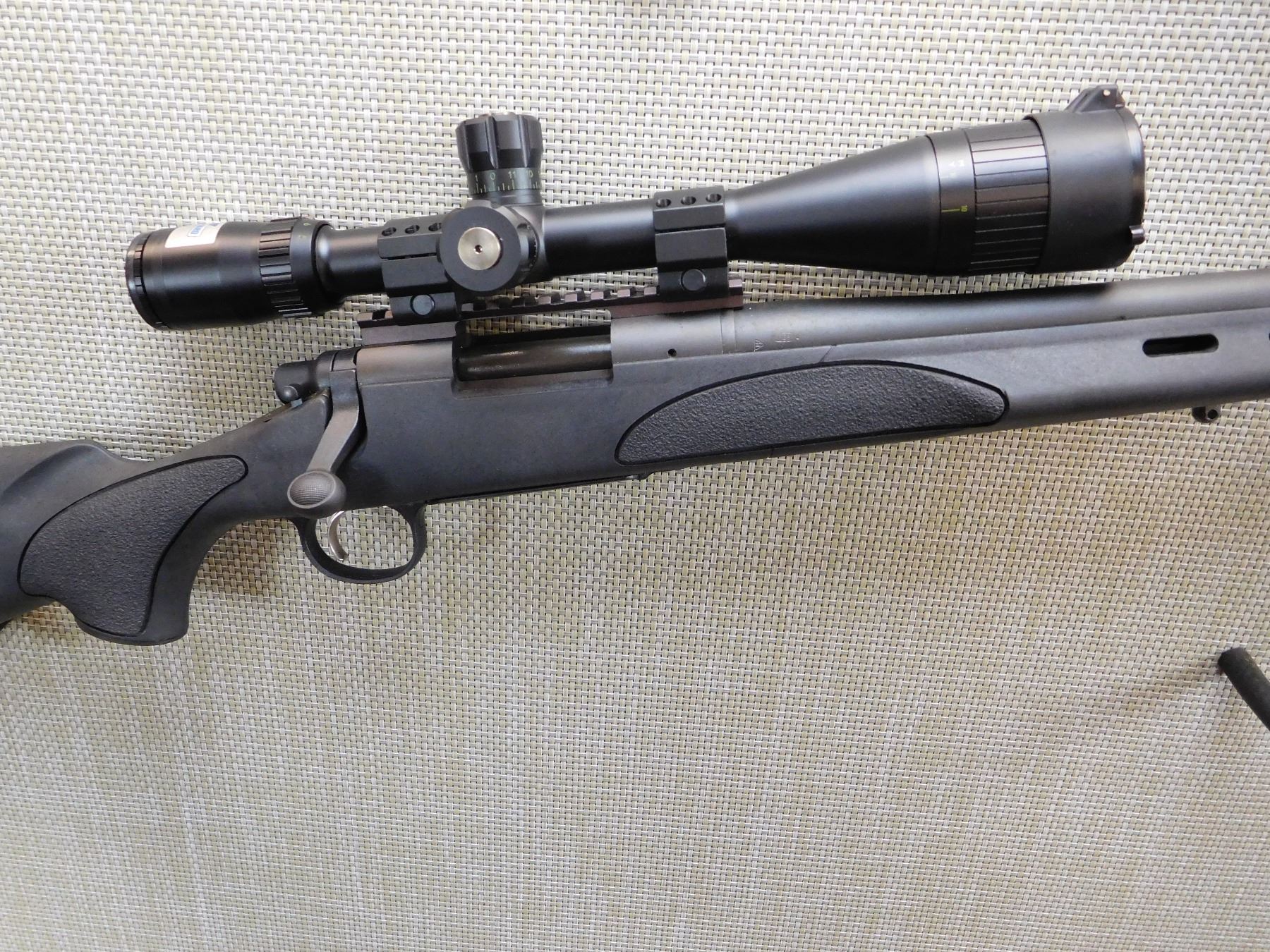 HAS A FLOOR PLATE, BLACK MATTE HEAVY BARREL, BLACK SYNTHETIC STOCK WITH A VENTILATED FOREND, SLING STUDS, RECOIL PAD, ADJUSTABLE SCOPE RAIL WITH A BUSHNELL RAINGUARD HD 5 -15 ADJUSTABLE SCOPE , ACTION: BOLT ACTION RIFLE , BARREL LENGTH: 660MM , STOCK # 7453 , SERIAL # 66778178 , CONDITION: 9/10 , CLASS: CANADIAN NON RESTRICTED CLASS