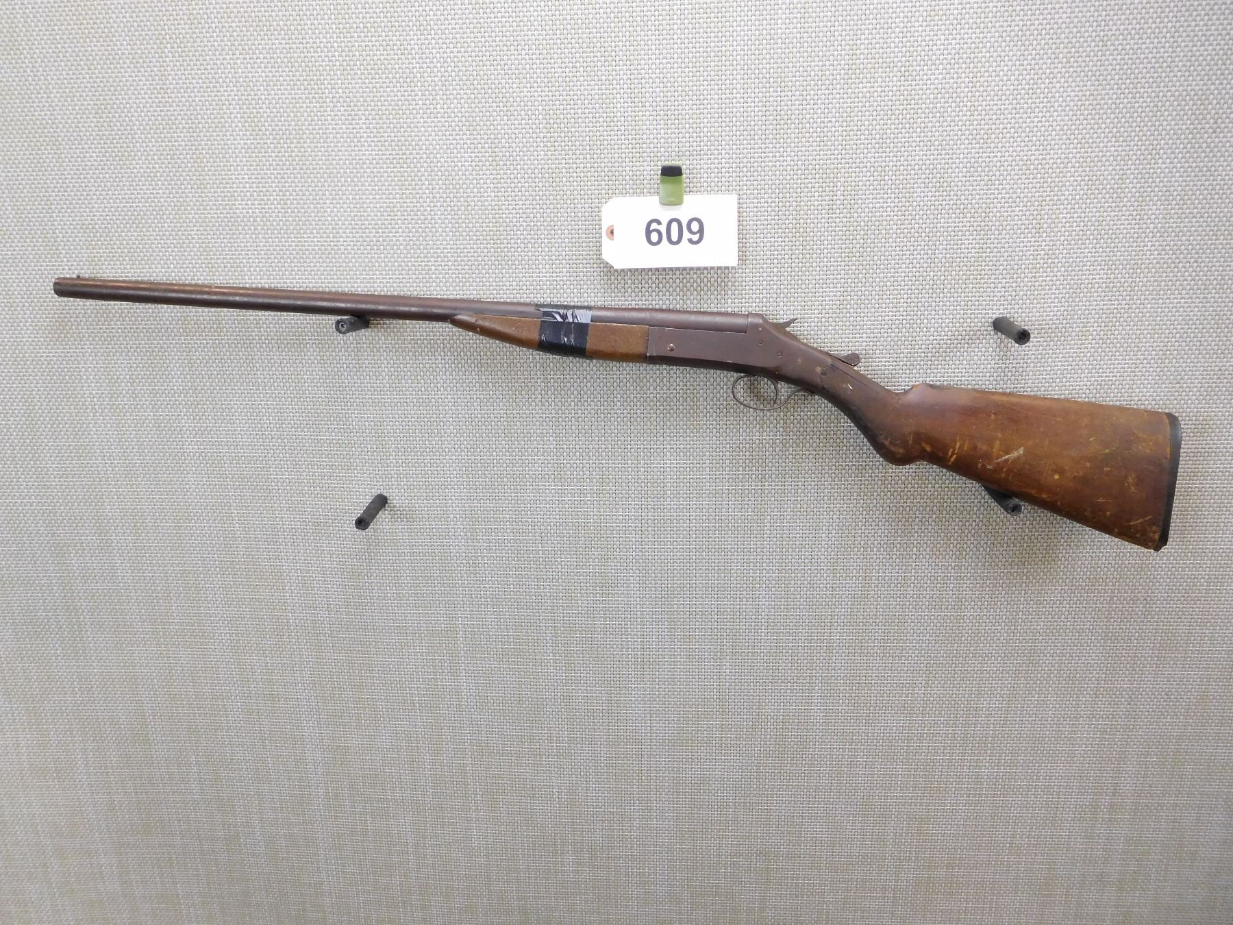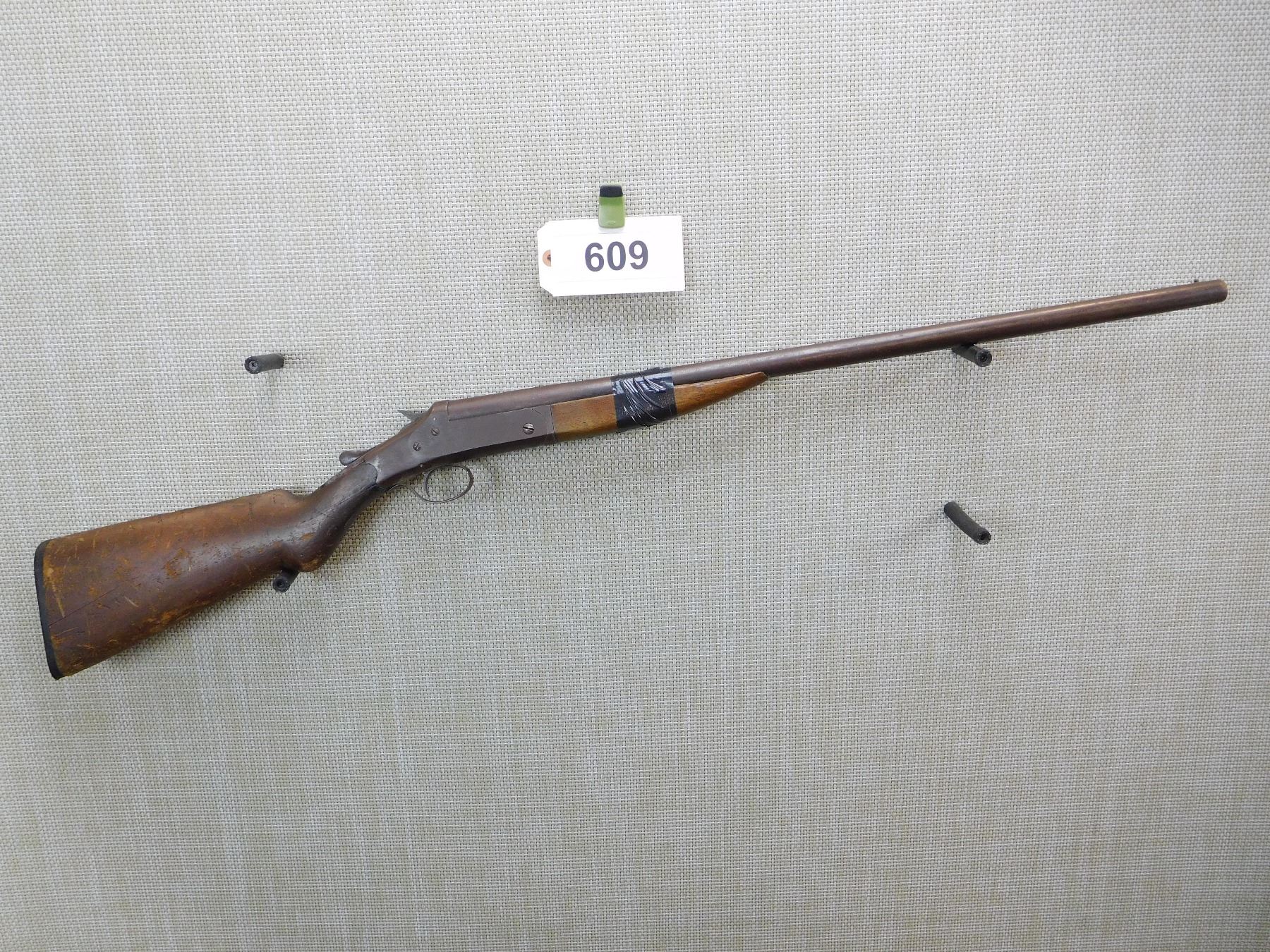 DARK BORE, CHIPPED AND CRACKED STOCK, OVERALL RUST, FOREND RETAINED BY ELECTRICAL TAPE, BEAD FRONT SIGHT , ACTION: SINGLE SHOT BREAK ACTION SHOTGUN , BARREL LENGTH: 25 1/2" , , , CONDITION: PARTS GUN , CLASS: CANADIAN NON RESTRICTED CLASS