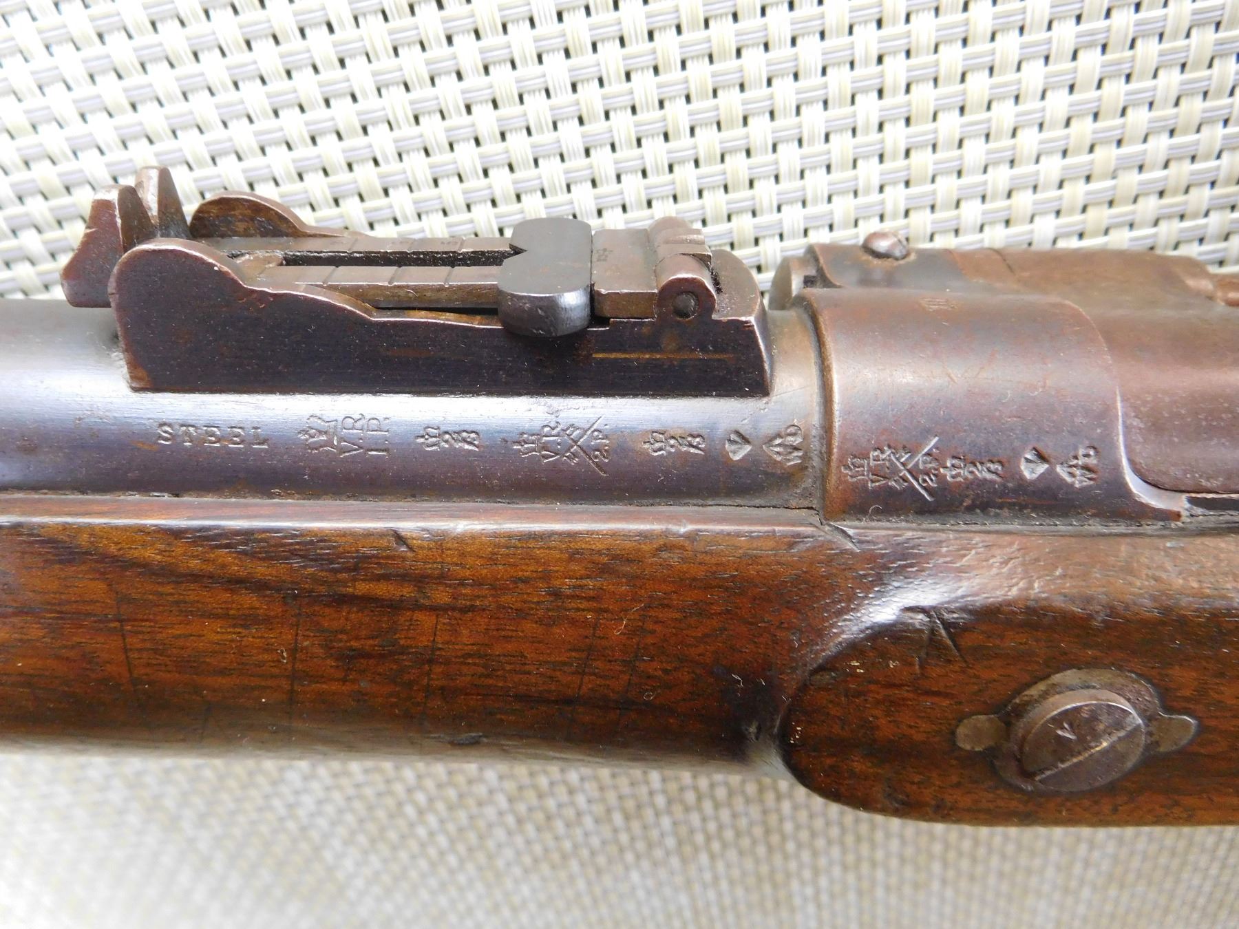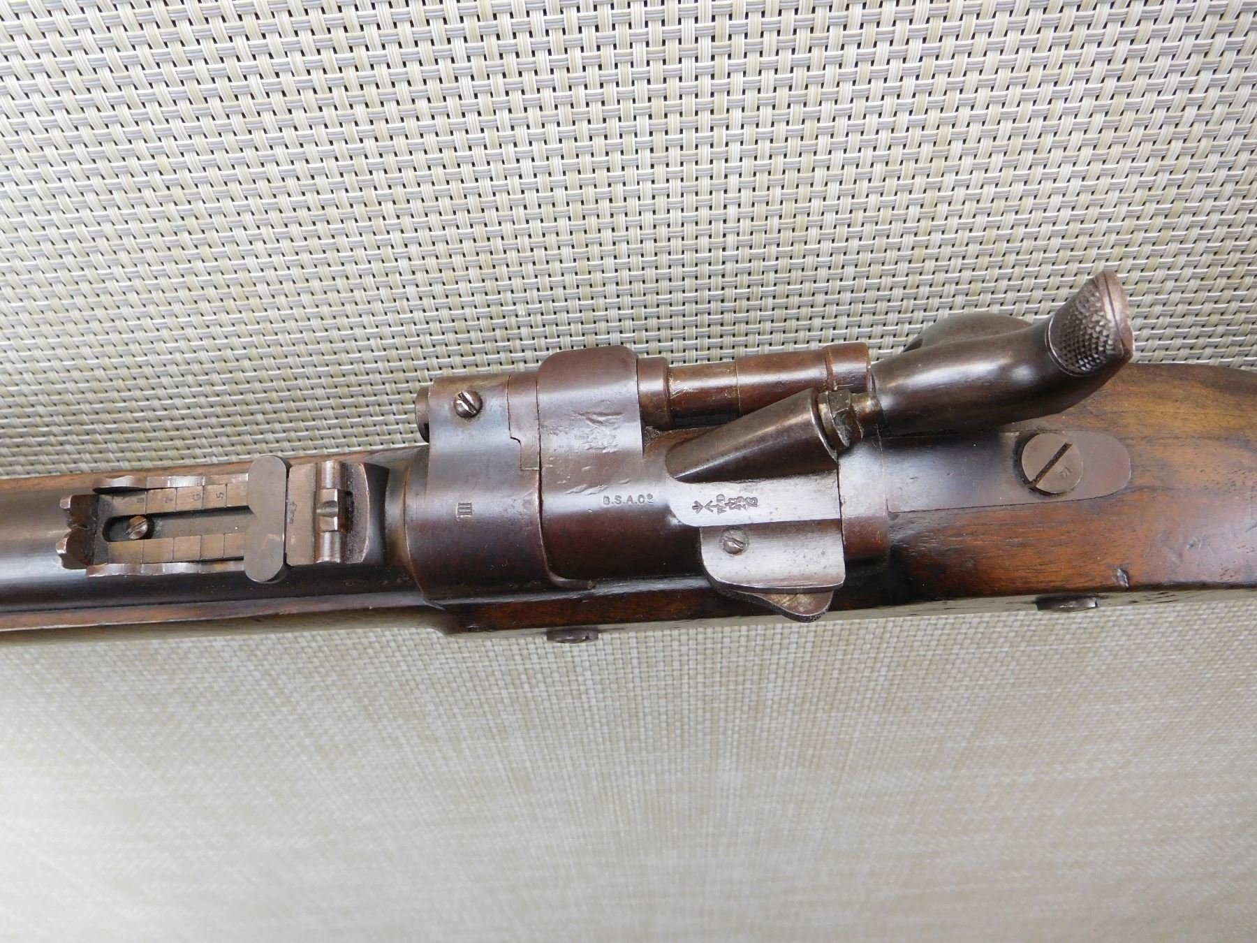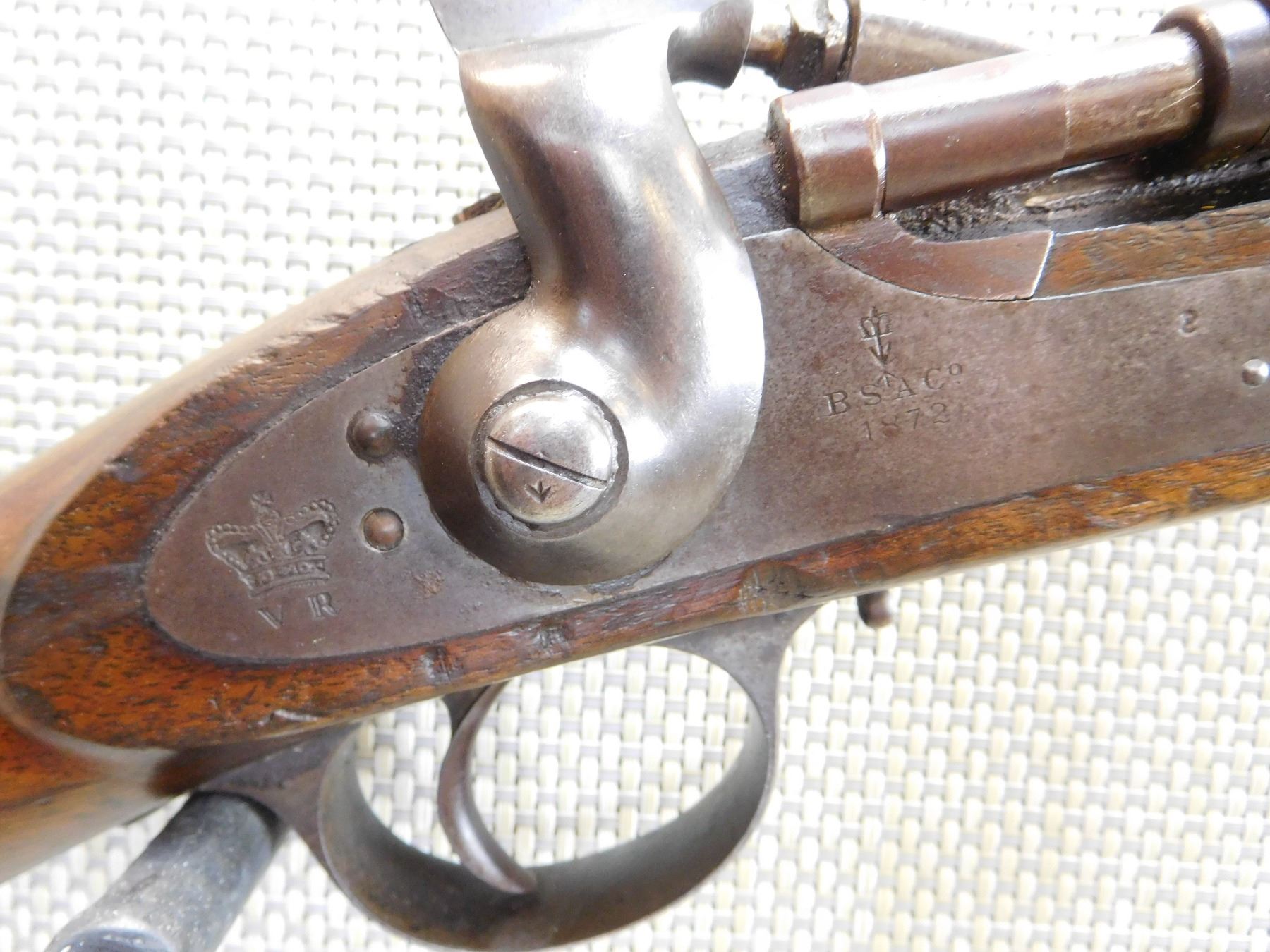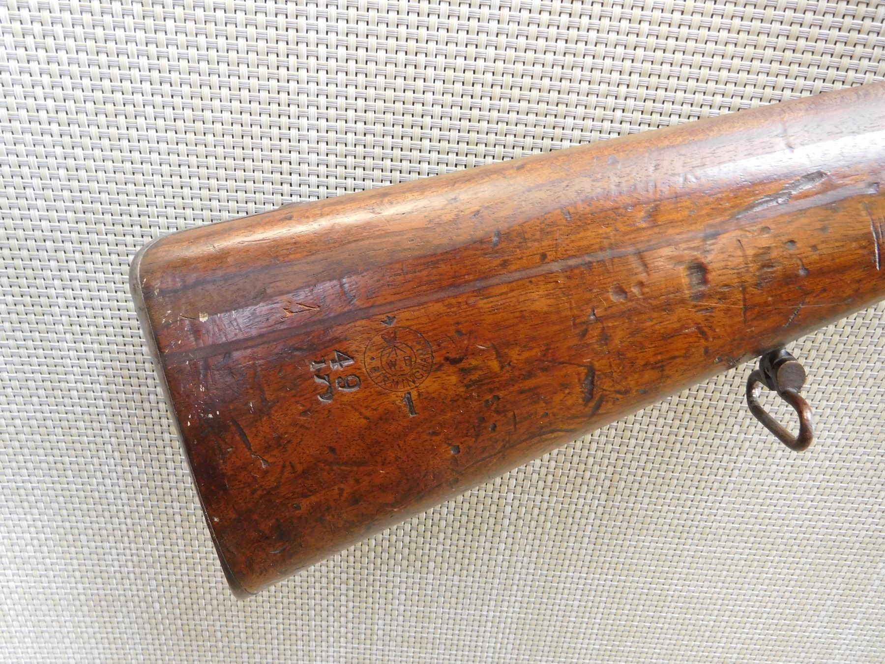 MILITARY WOOD STOCK, WITH BLADED NLOK FRONT AND RAMP ADJUSTABLE REAR, HOLDS COCK AND FIRES, REGIMENTAL MARKS, MINOR DINGS IN THE STOCK, SLING SWIVEL STUDS, INCLUDES RAM ROD, NO NINPPLE CHAIN OR PROTECTOR , STEEL FURNITURE, BSA MARKIII MFG 1872 , ACTION: SINGLE SHOT , BARREL LENGTH: 30 1/2" , , , CONDITION: ANTIQUE 8/10 , CLASS: CANADIAN ANTIQUE CLASS