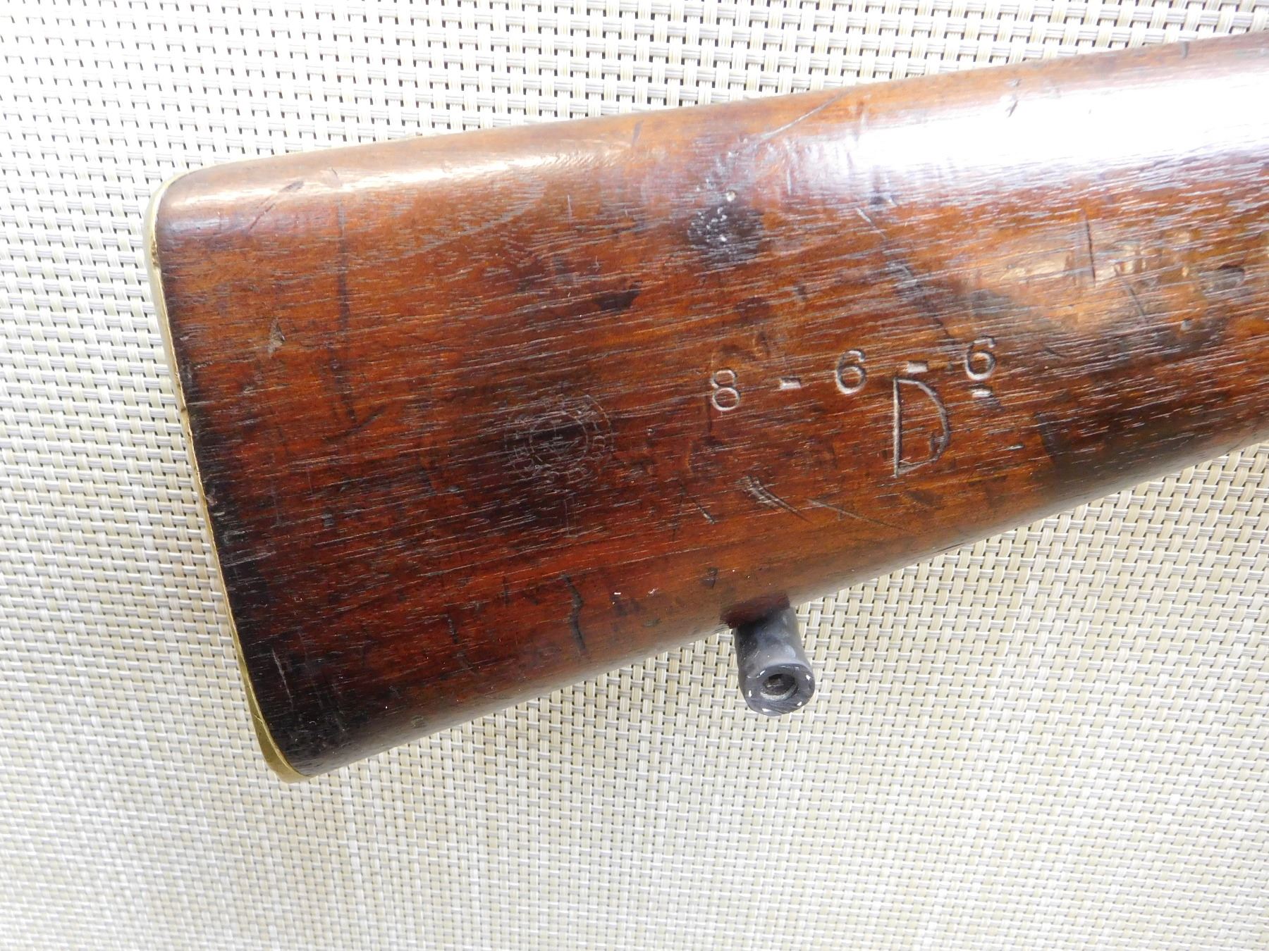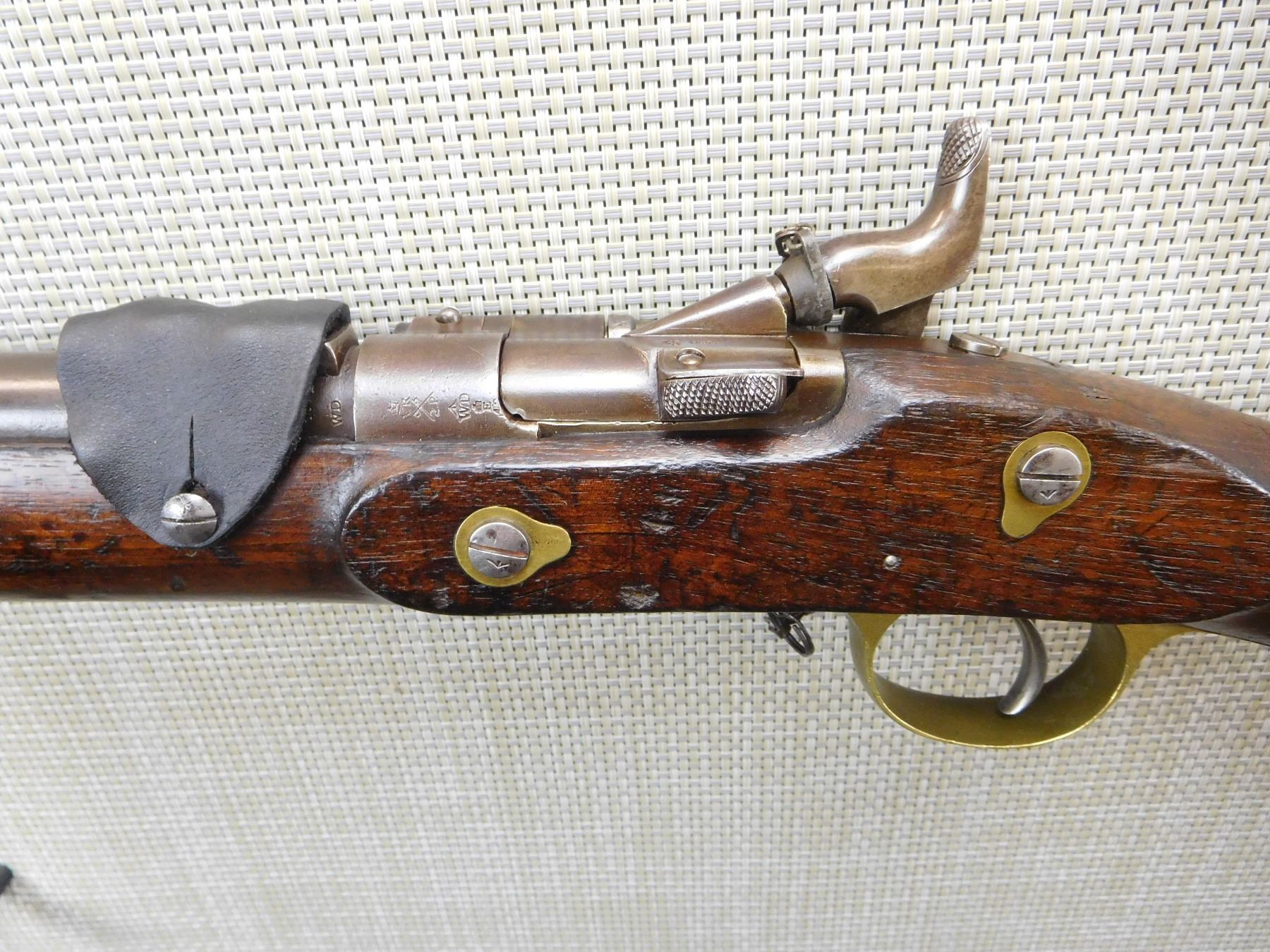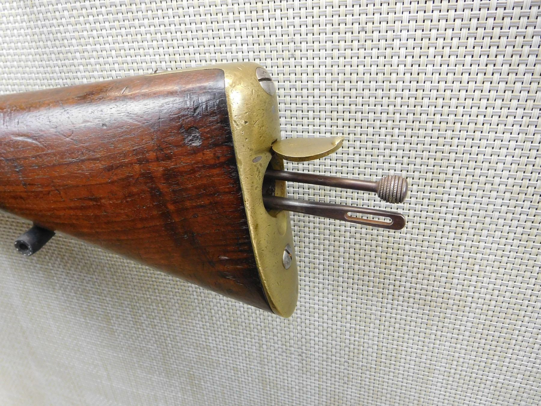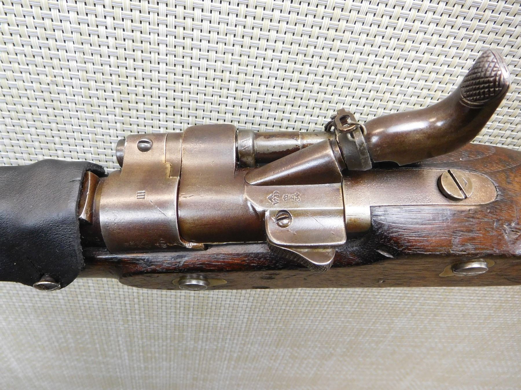 DATED 1871, MATCHING SERIAL NUMBER 1931 APPEARS ON BREACH BLOCK AND SIGHT, HAS A CLEANING ROD IN THE BUTT STOCK, RETAINS ORIGINAL NIPPLE PROTECTOR WITH CHAIN, REPLACED LEATHER SIGHT COVER, BORE IS VERY GOOD, BRASS FURNITURE, REGIMENTAL MARK 4 IS FOR THE HUSSARS AND APPEARS ON THE WOOD STOCK, FIXED FRONT AND ADJUSTABLE REAR SIGHT, LIGHTLY PITTED BARREL , ACTION: SINGLE SHOT , BARREL LENGTH: 19 1/2" ,CONDITION: ANTIQUE 6/10 , CLASS: CANADIAN ANTIQUE CLASS
