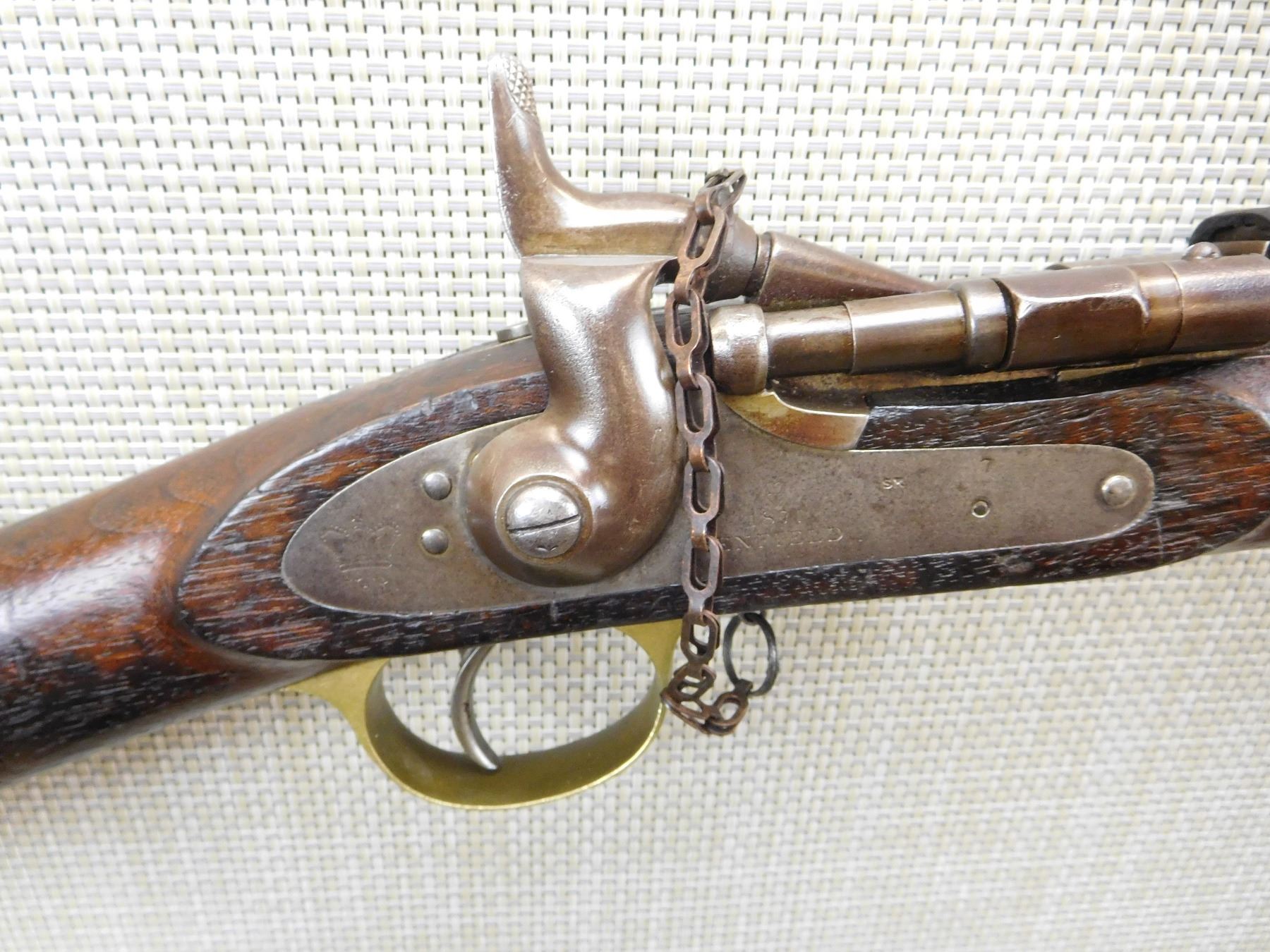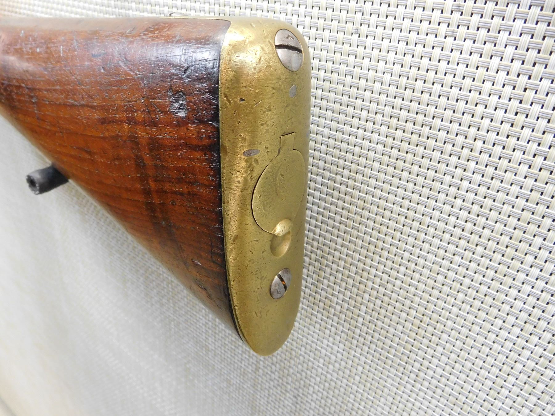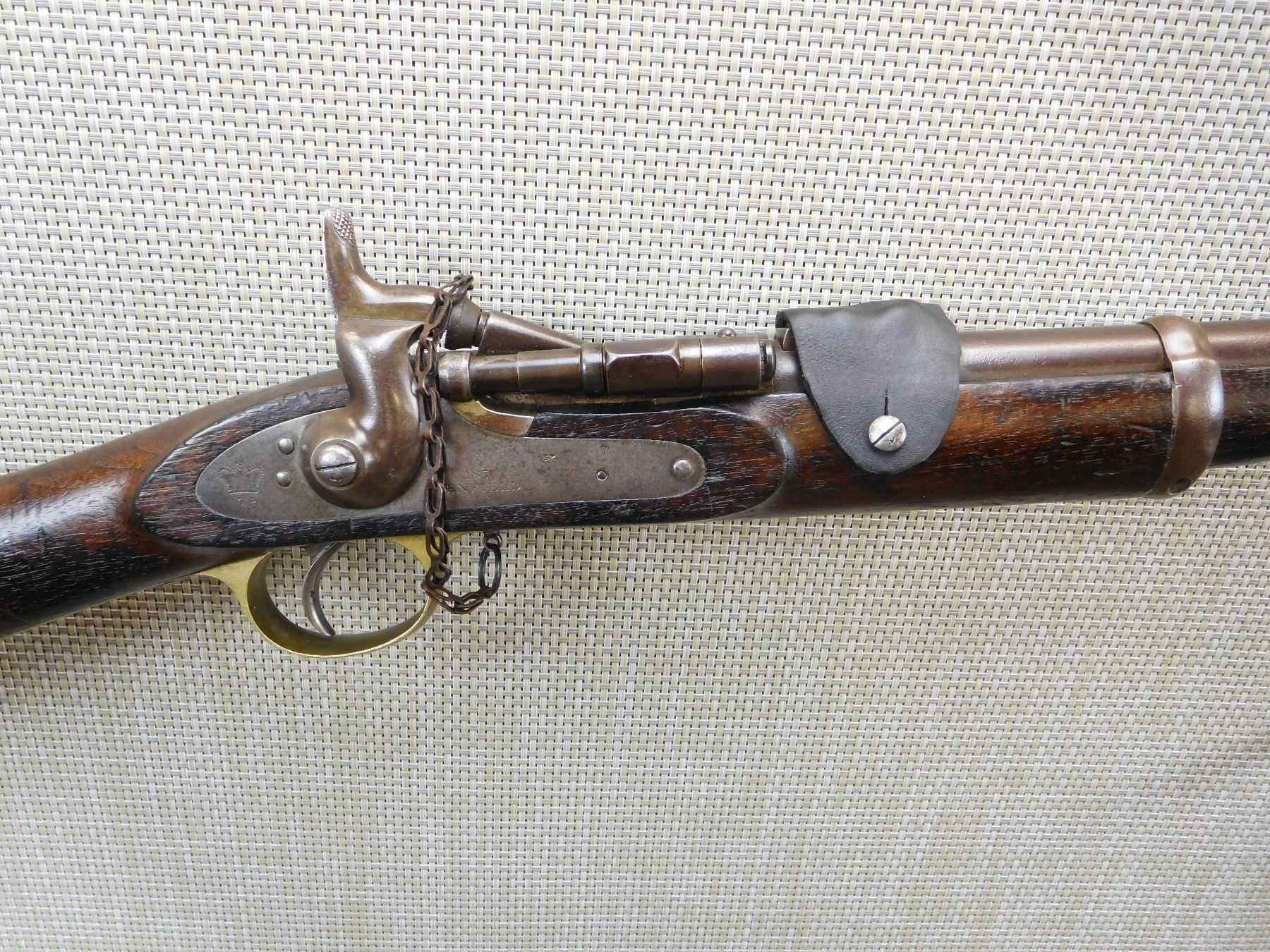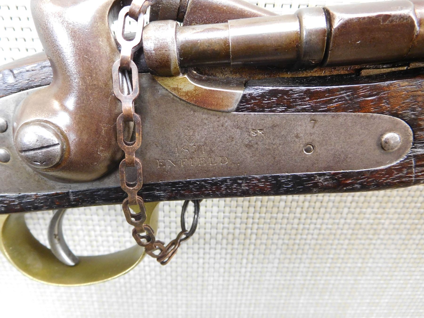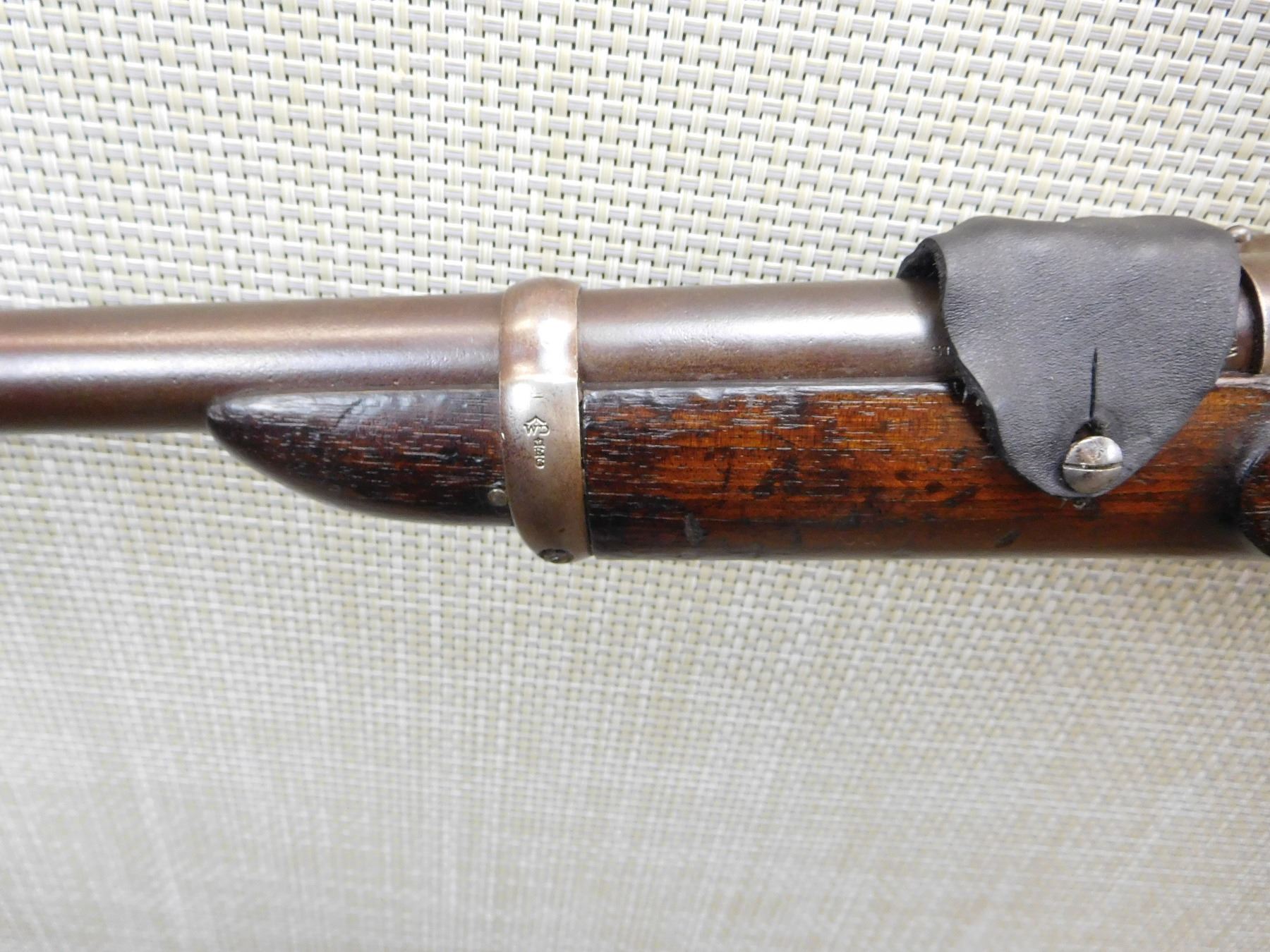 DATED 1871, MATCHING SERIAL NUMBER 1931 APPEARS ON BREACH BLOCK AND SIGHT, HAS A CLEANING ROD IN THE BUTT STOCK, RETAINS ORIGINAL NIPPLE PROTECTOR WITH CHAIN, REPLACED LEATHER SIGHT COVER, BORE IS VERY GOOD, BRASS FURNITURE, REGIMENTAL MARK 4 IS FOR THE HUSSARS AND APPEARS ON THE WOOD STOCK, FIXED FRONT AND ADJUSTABLE REAR SIGHT, LIGHTLY PITTED BARREL , ACTION: SINGLE SHOT , BARREL LENGTH: 19 1/2" ,CONDITION: ANTIQUE 6/10 , CLASS: CANADIAN ANTIQUE CLASS