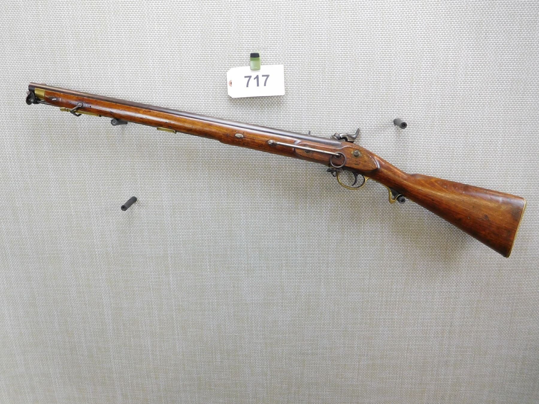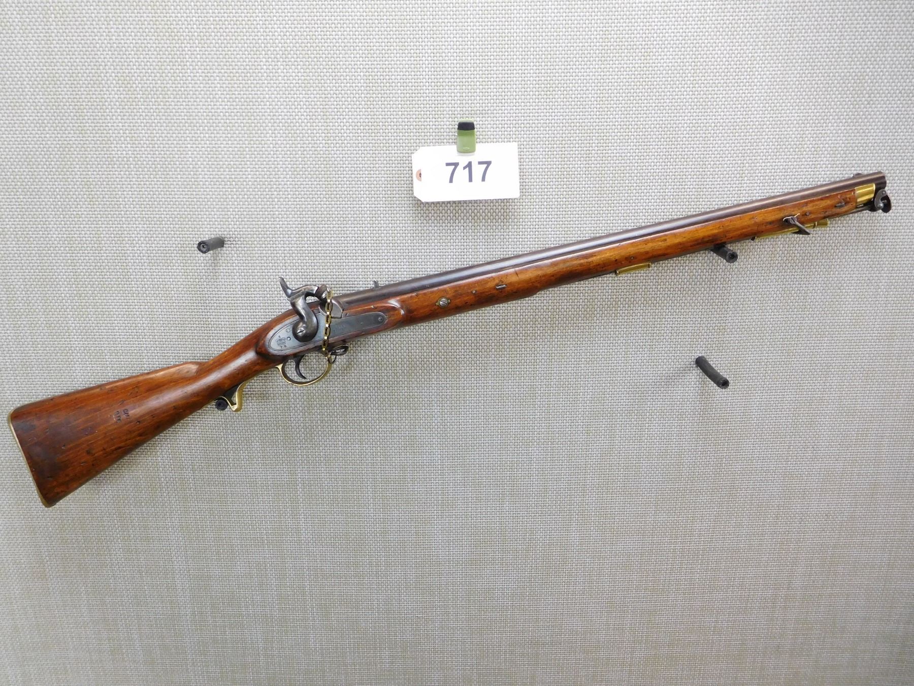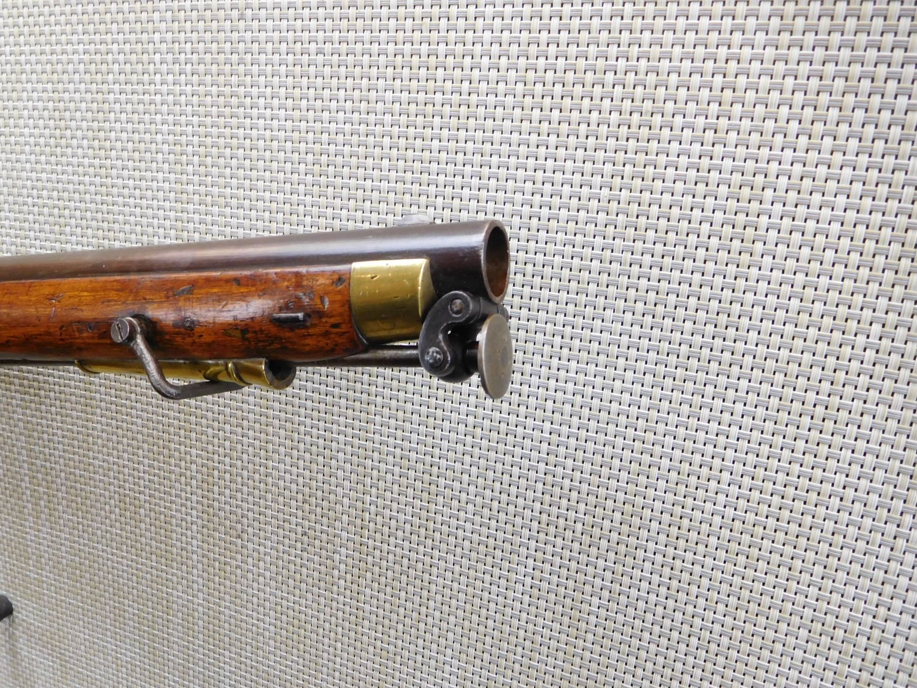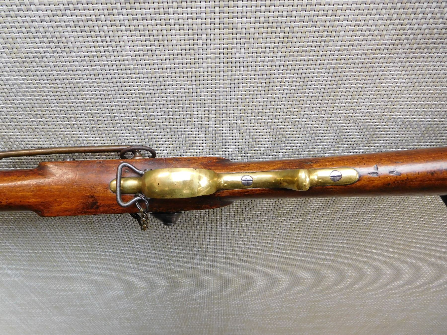 FEATURES UNIQUE SWIVEL RAM ROD, SADDLE RING WITH BAR, NIPPLE PROTECTOR WITH CHAIN, FINGER GRIP TRIGGER GUARD, BRASS FURNITURE, BLADE FRONT AND FIXED REAR SIGHTS, REGIMENTAL MARKS ON THE STOCK , ACTION: SINGLE SHOT PERCUSSION , BARREL LENGTH: 25" , , , CONDITION: ANTIQUE 7/10 , CLASS: CANADIAN ANTIQUE CLASS