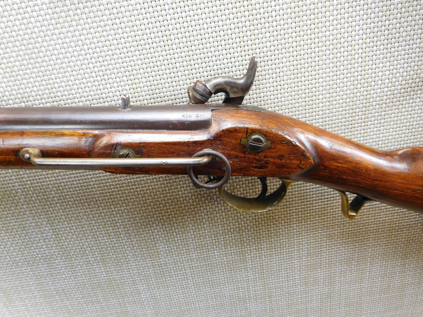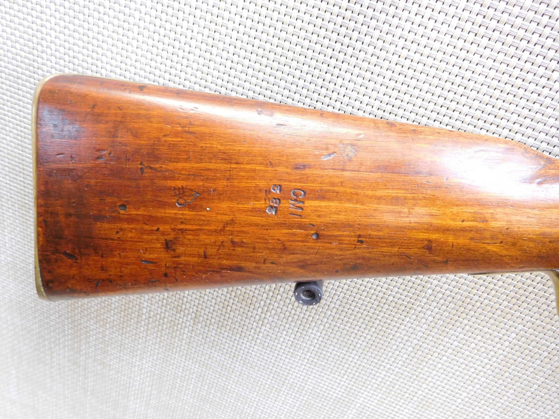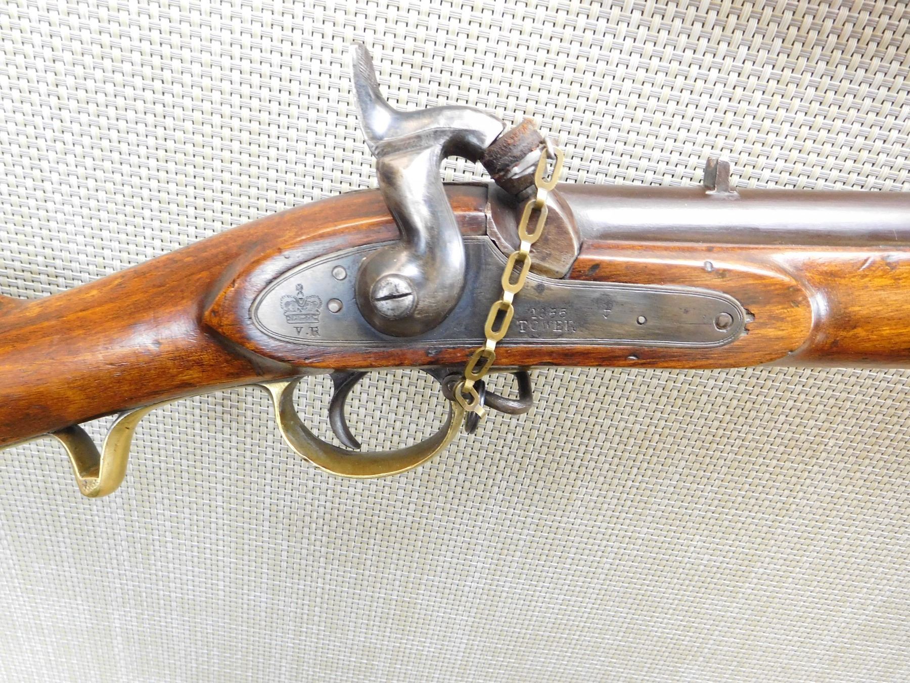 FEATURES UNIQUE SWIVEL RAM ROD, SADDLE RING WITH BAR, NIPPLE PROTECTOR WITH CHAIN, FINGER GRIP TRIGGER GUARD, BRASS FURNITURE, BLADE FRONT AND FIXED REAR SIGHTS, REGIMENTAL MARKS ON THE STOCK , ACTION: SINGLE SHOT PERCUSSION , BARREL LENGTH: 25" , , , CONDITION: ANTIQUE 7/10 , CLASS: CANADIAN ANTIQUE CLASS