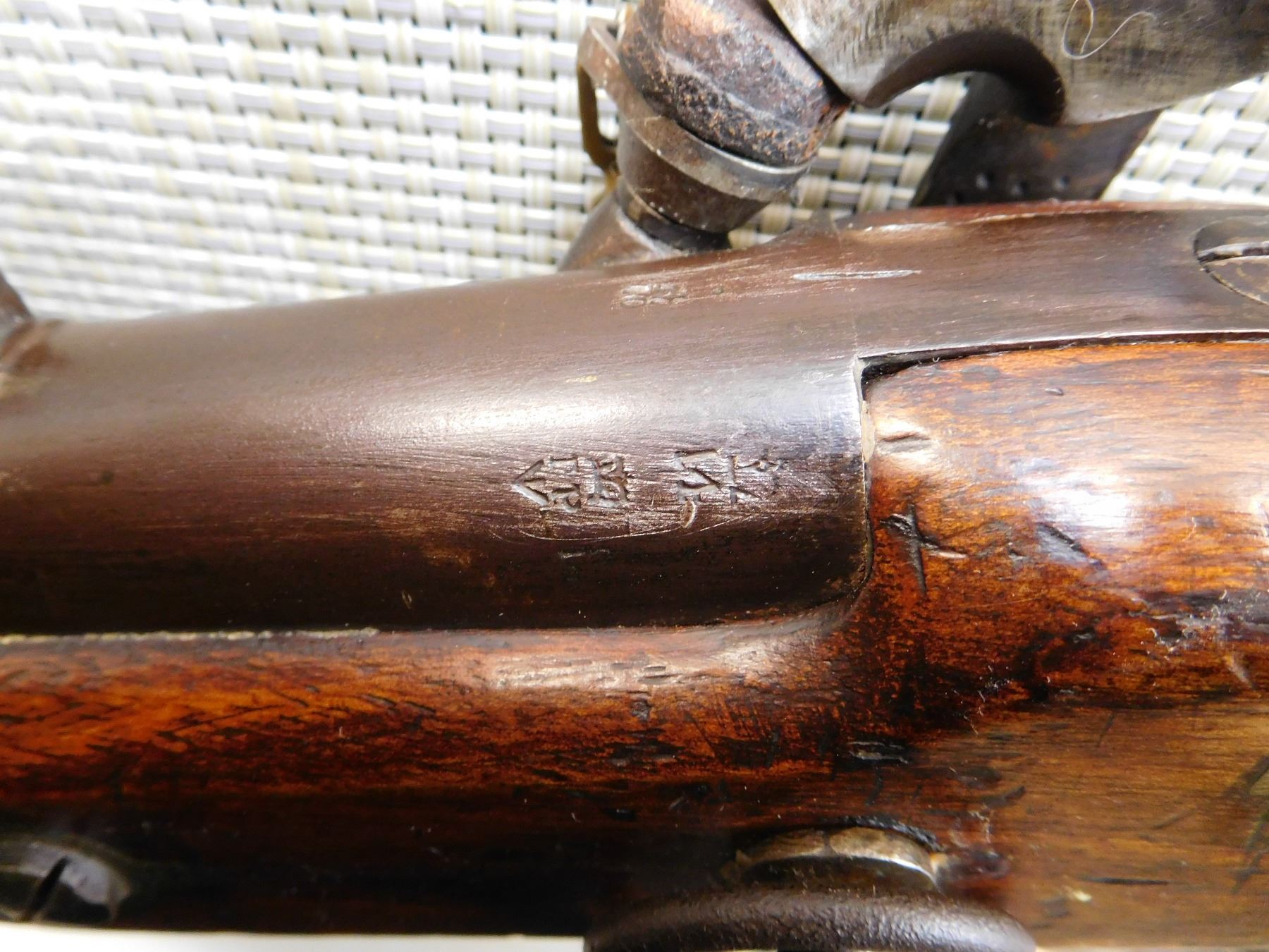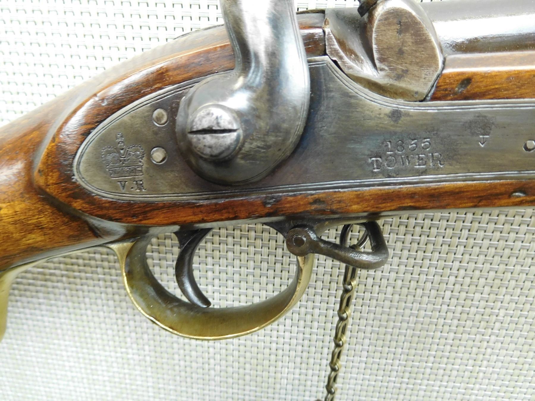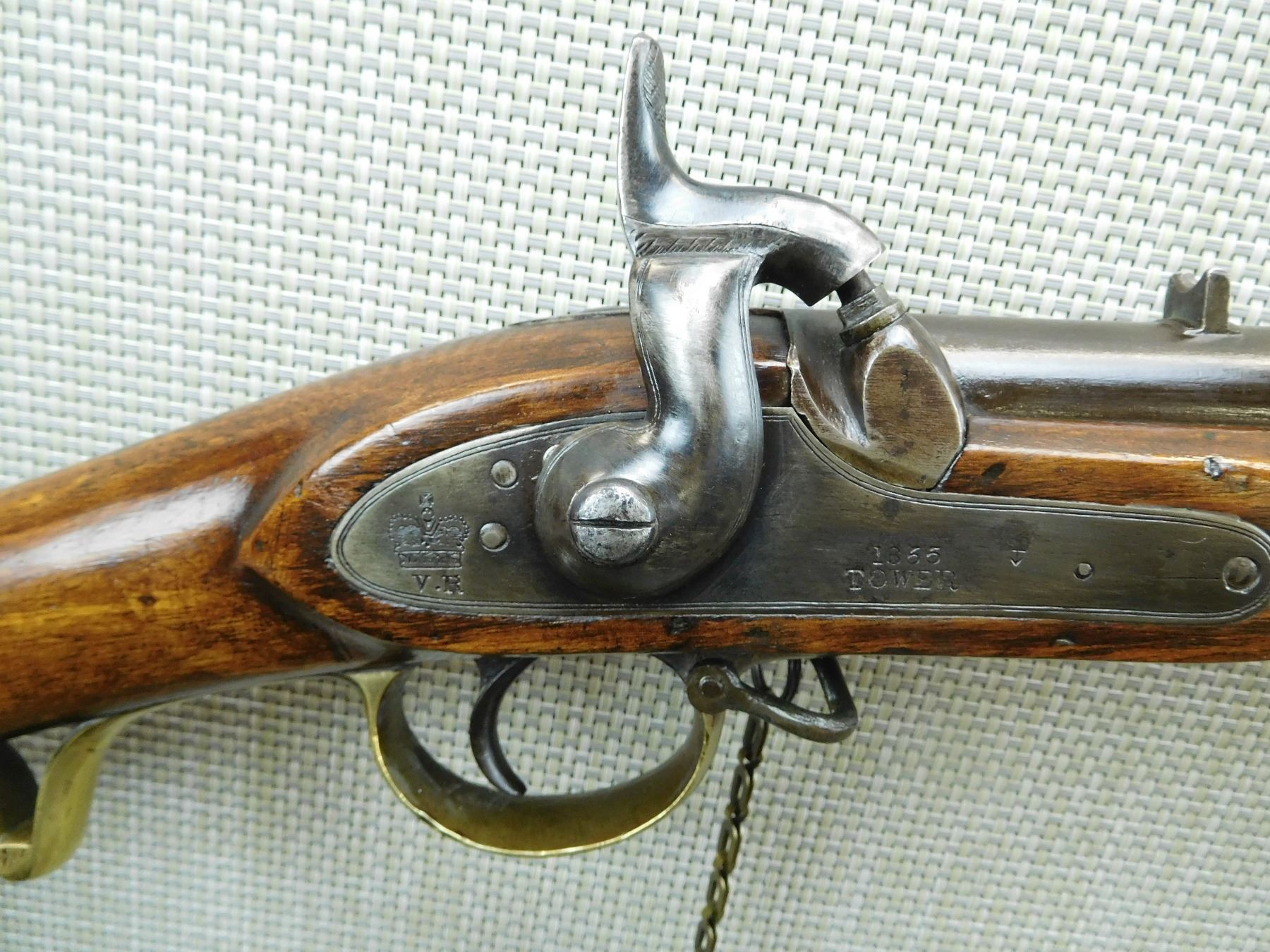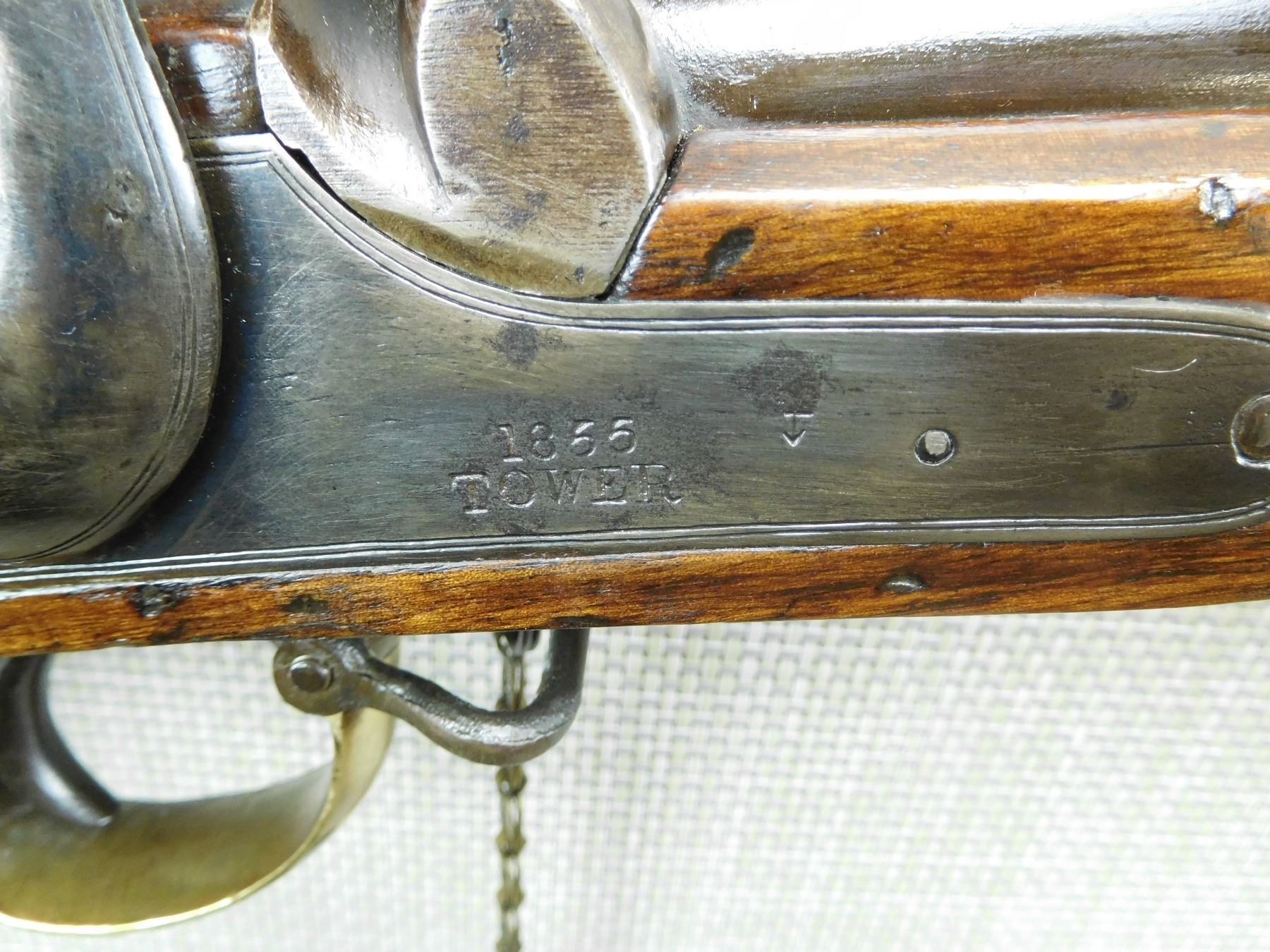 FEATURES UNIQUE SWIVEL RAM ROD, SADDLE RING WITH BAR, NIPPLE PROTECTOR WITH CHAIN, FINGER GRIP TRIGGER GUARD, BRASS FURNITURE, BLADE FRONT AND FIXED REAR SIGHTS, REGIMENTAL MARKS ON THE STOCK , ACTION: SINGLE SHOT PERCUSSION , BARREL LENGTH: 25" , , , CONDITION: ANTIQUE 7/10 , CLASS: CANADIAN ANTIQUE CLASS