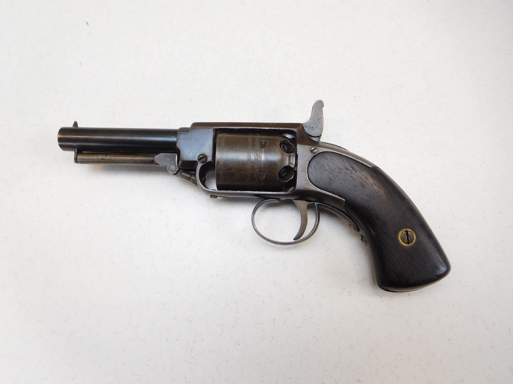 SPRINGFIELD MASS USA ON THE TOP STRAP, WOODEN GRIPS, NOTCH AND BLADE SIGHT, COCKS HOLDS AND FIRES, LOCK UP IS TIGHT, BROWN PATINA WITH SOME BLUEING REMAINING ON THE BARREL , ACTION: REVOLVER , BARREL LENGTH: 76MM , , , CONDITION: ANTIQUE 7/10 , CLASS: CANADIAN ANTIQUE CLASS