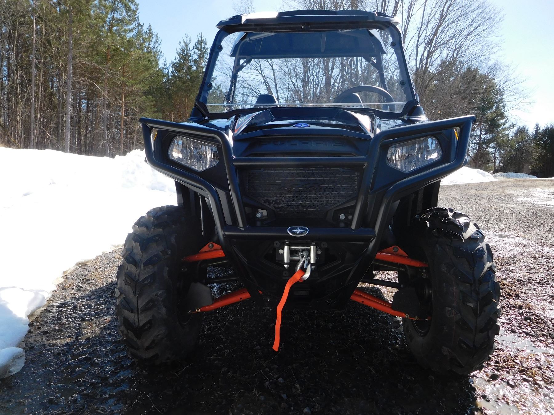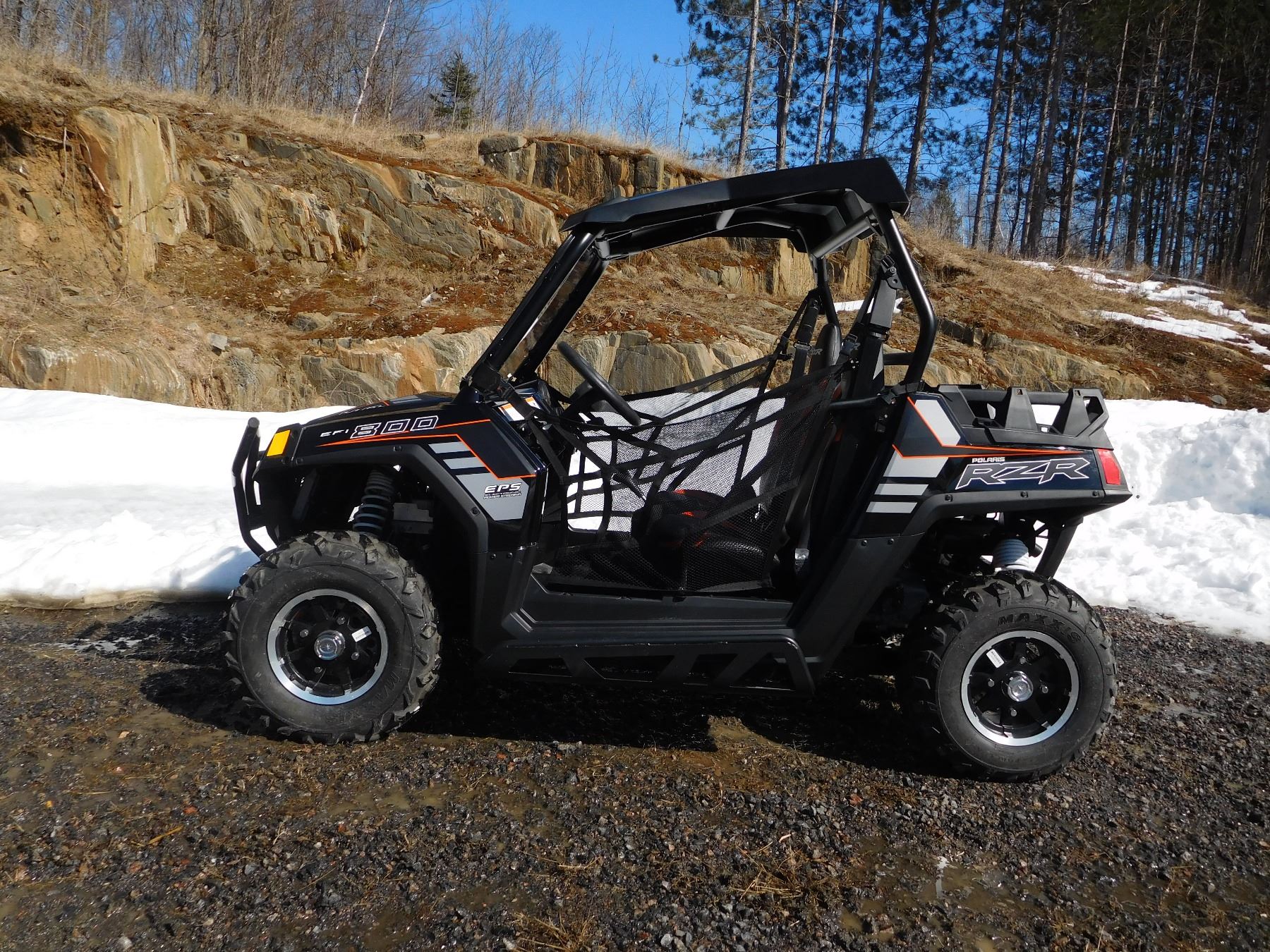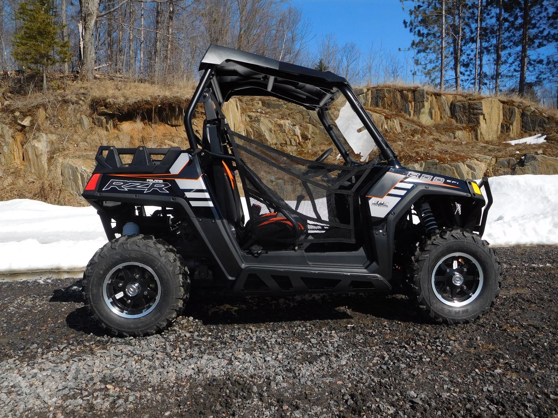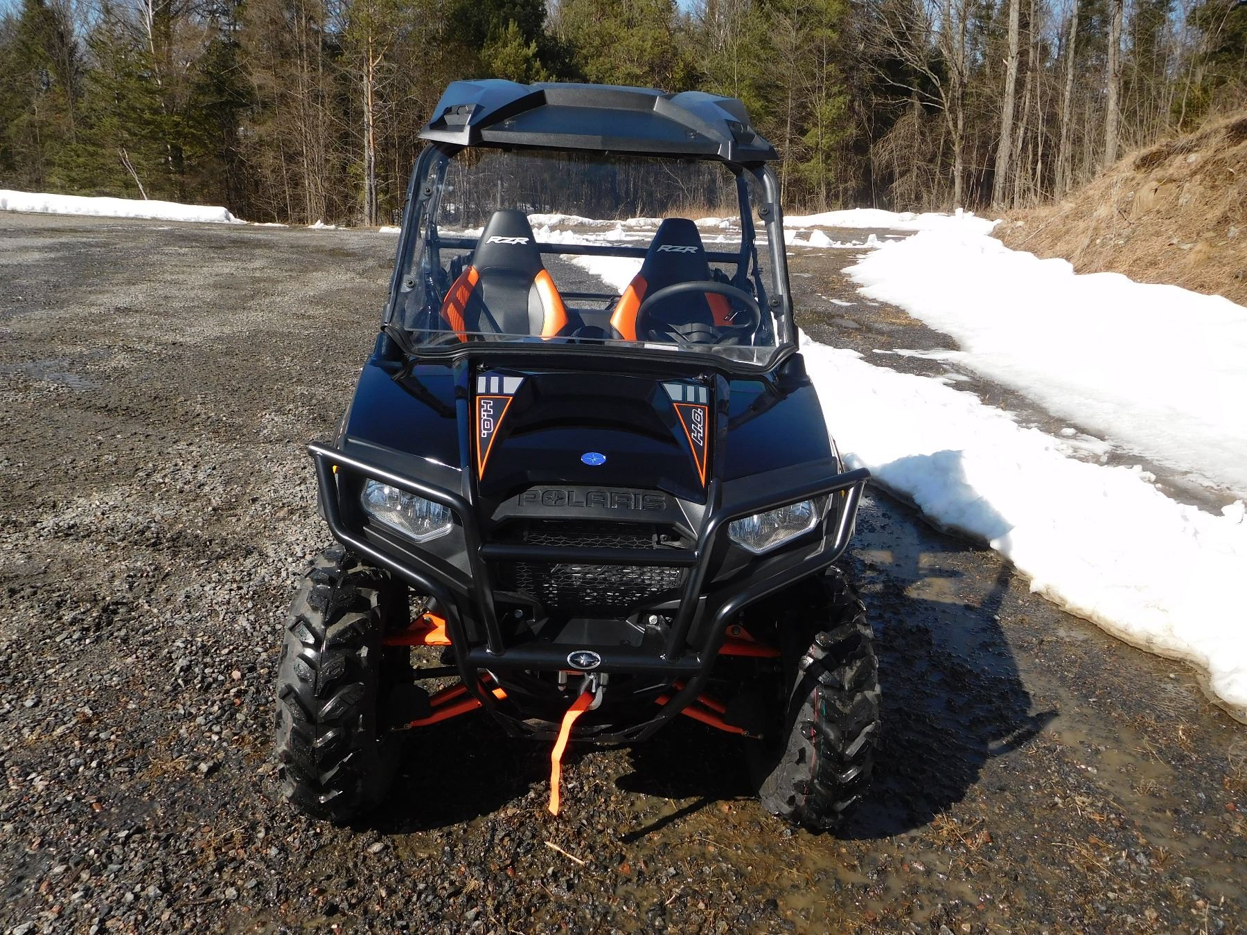 "LEEPS" BLACK AND ORANGE TRIM, BUCKET SEATS, WINCH, SIDE NETS, 3500 LB. POLARIS WINCH, RZR ROOF, POLY WINDSHIELD, FRONT BRUSH GAURD, POLARIS ROCK SLIDERS, NEW PURCHASE PRICE: $15,500. ONLY 21.6 KM., NO SHIPPING