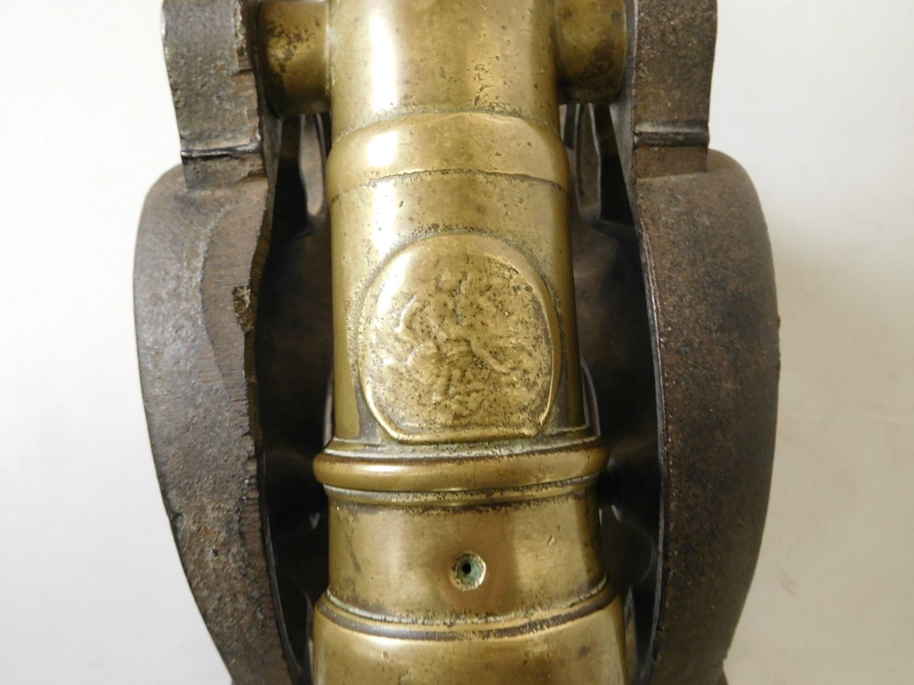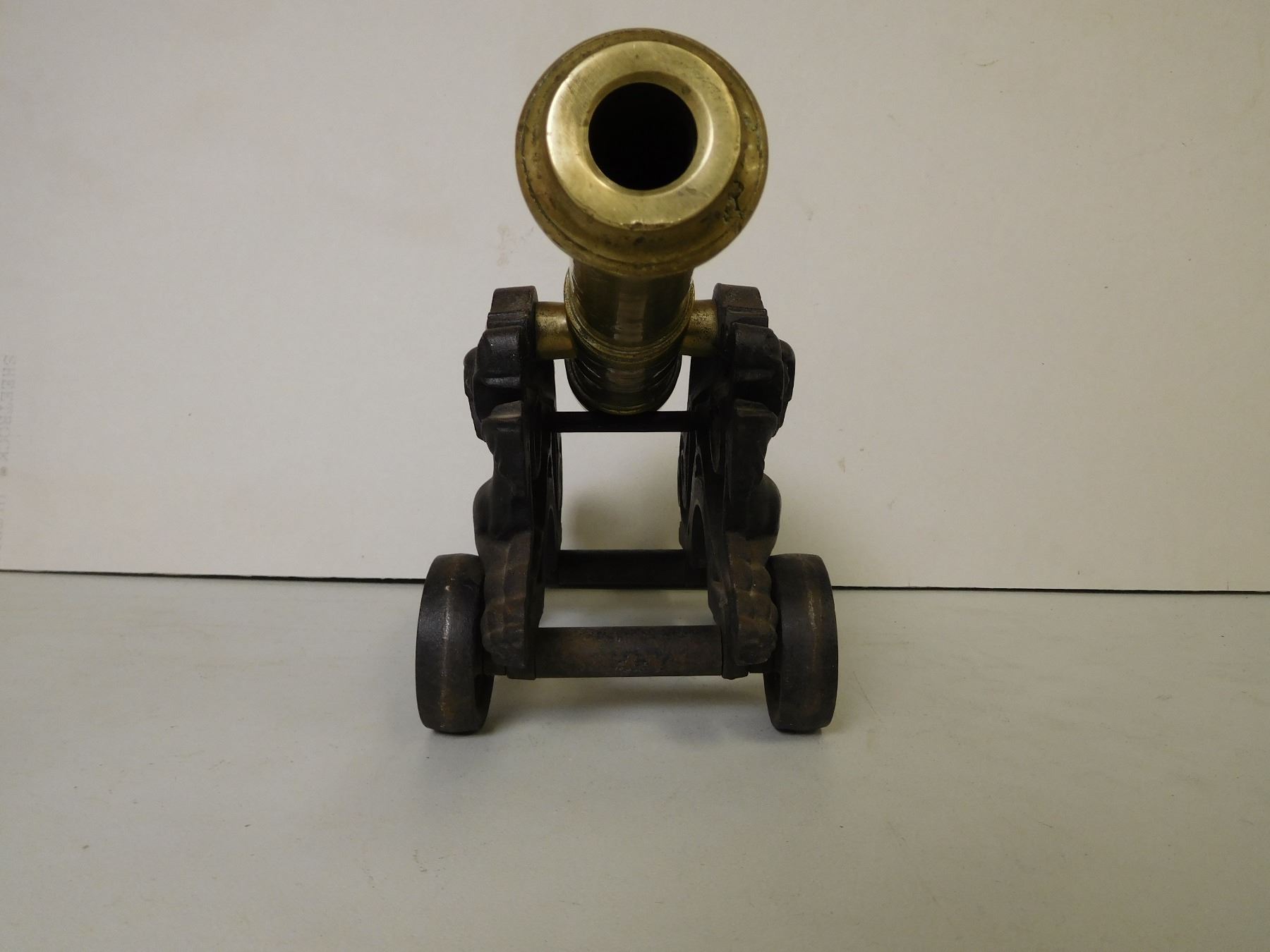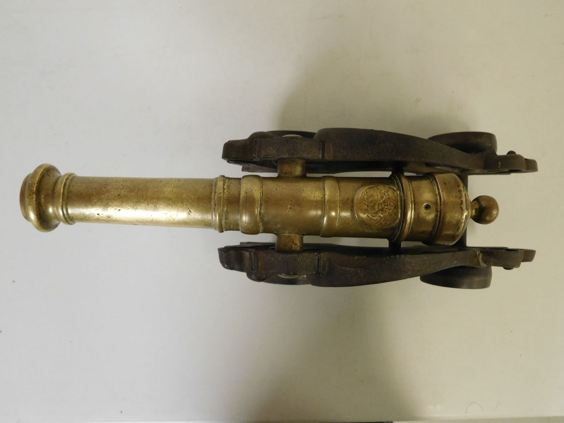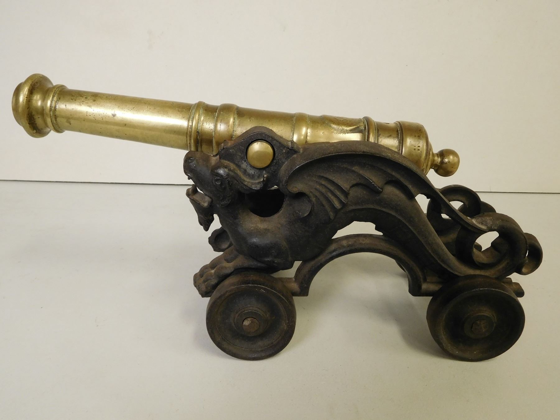 BORE MEASURES APPROX .880, BRASS BARREL, MADE IN THE VICTORIAN ERA, FLYING DRAGON CARRIAGE, OVERALL LENGTH 18", BASE IS 10" CANNON IS APPROX 15"