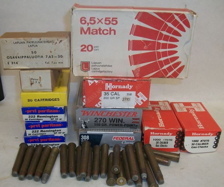 AMMO: 20 RNDS FEDERAL 308 WIN, 20 RNDS WINCHESTER 270 WIN, 20 RNDS LAPUA 6.5 X 55, 60 RNDS PRVI 222 REM, 20 RNDS NORINCO 223 REM, 22 RNDS DOMINION 38-55 DUDS. PROJECTILES: 100 HORNADY 35 CAL 200 GR SP,