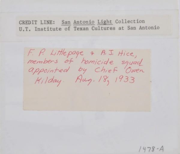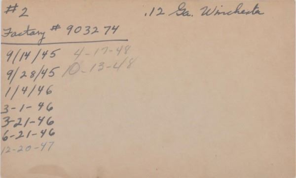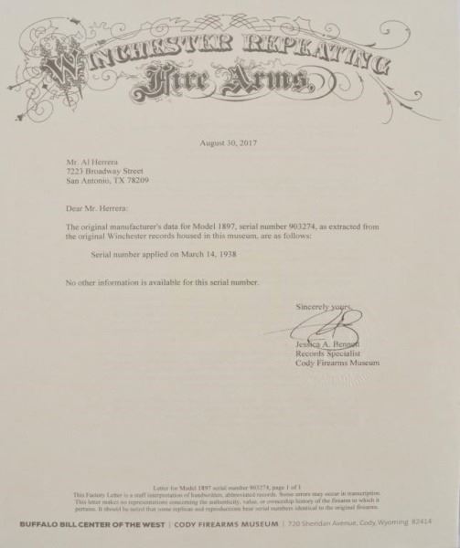 * Marked SAPD #2 on Stock & Receiver. With Winchester letter. 12 Ga, 20" barrel. With original Armory card and period photo showing two men holding similar gun. U.T. Institute of Texan Cultures note reads; "F.P. Littlepage and A.J. Hice, members of homicide squad appointed by Chief Own Kilday, August 18, 1933".