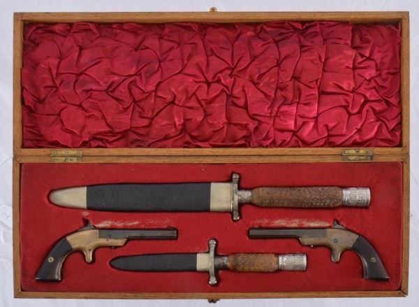 Circa 1860s. Pistols are number 1 & 2. with two antique knives both marked J.D. Chevalier New York