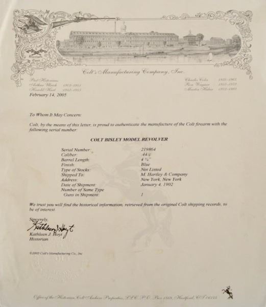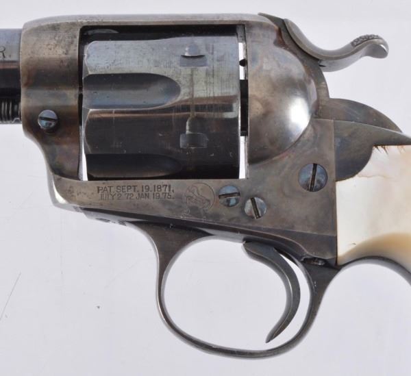 * High condition. Shipped to M. Hartley & Co, New York, NY on January 4, 1902. With Mother of Pear grips. Comes with Factory letter. From Jack Slaughter Collection. S/N 219864