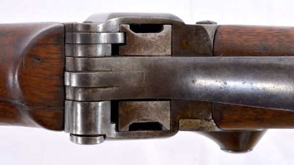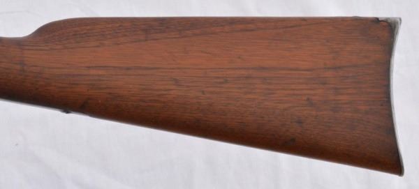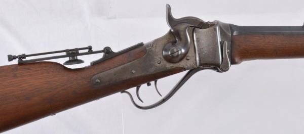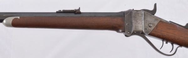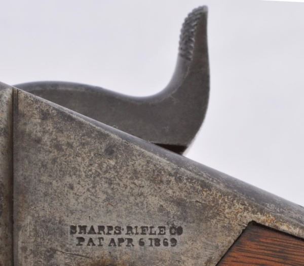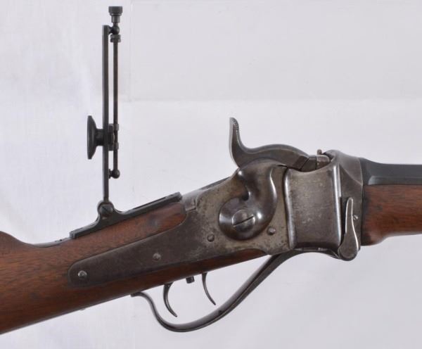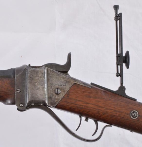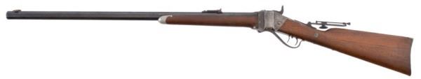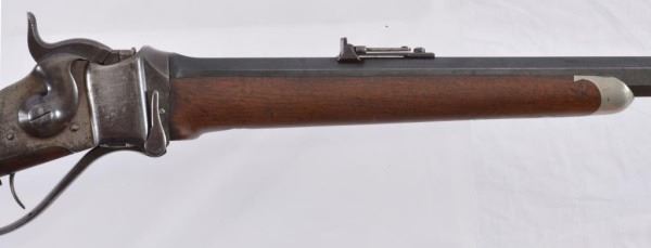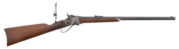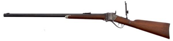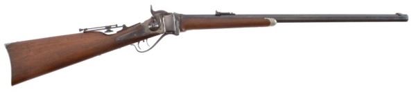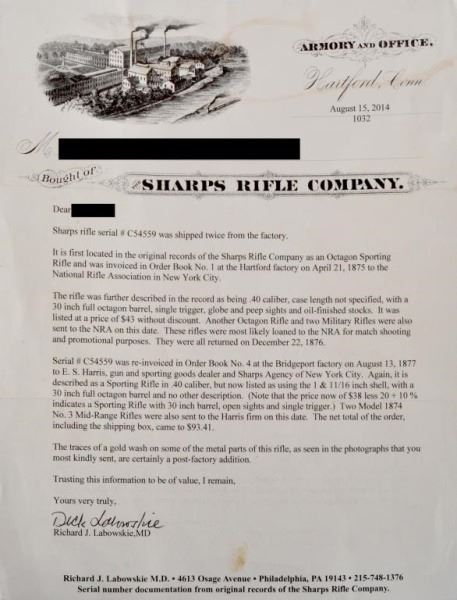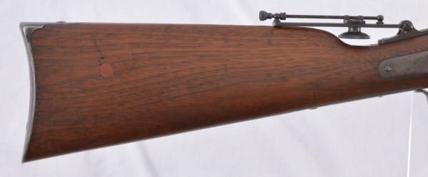 This rifle was actually shipped from the Sharps warehouse twice. The first time was to the National Rifle Association in New York City on April 21, 1875. The rifles were most likely on loan for match shooting and promotional purposes. They were returned December 22, 1876. The rifle was re-invoiced at the Bridgeport factory on August 13, 1877 to E.S. Harris of New York City. There are a few slight traces of gold on some of the metal parts of the rifle, and those are certainly a post-factory addition. With factory letter. Matching original serial numbers on inside forewood, on barrel, on bottom of barrel, and on upper tang of the reciever. Very interesting gun. S/N C54559