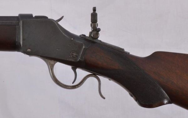 Checkered stock, pistol grip, with heavy octagon barrel. Circa 1888