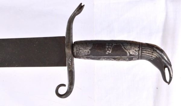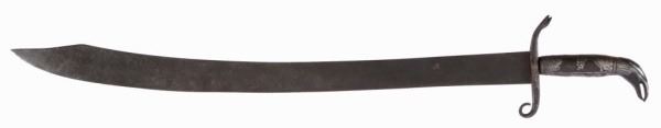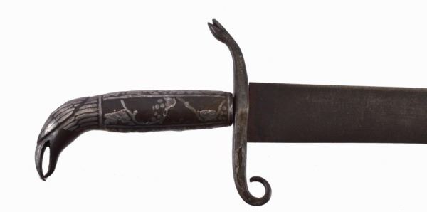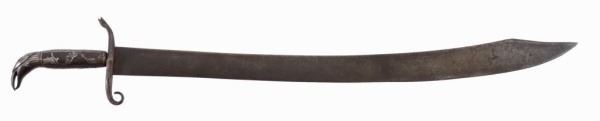 A very good and unusual early Mexican silver inlayed hilt Saber/cutlass, ca. 1840. Overall 26" curved hand forged single edge, clip point blade. 80% of silver remains on hilt. Dates to the Mexican American War period. An unusual sword with a classic Mexican “Eagle & Snake” form hilt.