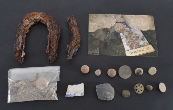 Photograph of "dig" taken in 2016. One horseshoe and partial piece of a horseshoe; 3 Musket balls; 5 buttons; 1 piece of Spanish Colonial pottery; 1 small bag of soil from "the dig", and 1 flash drive showing numerous items being taken from the "dig" in 2016. With provenance letter detailing the excavation of the relic from a well documented dig on the North East section of the Alamo battleground. During the battle, the third column of Santa Anna's Army attempted to breach the Northeast section, along with Mexican cavalry. They failed to breach the wall as the Texas defenders repulsed both waves. This section of the battlefield would have seen heavy cannon & musket fire, and likely heavy casualties on the Mexican side in this area of the battlefield.