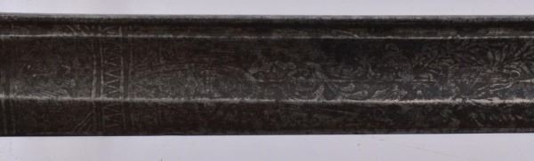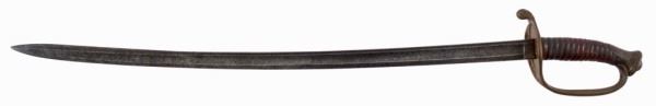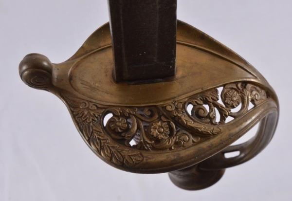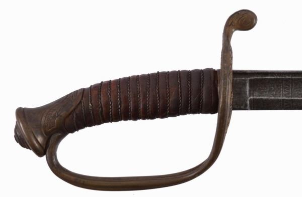 1845/1855 French sword manufactured for the Mexican Army Officer (Artillery or Infantry) with engraved blade with Mexican Eagle on a bed of cactus and clasping a snake. Overall 35 ½ inches long and 1 1/16 inches wide.