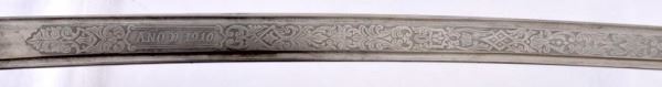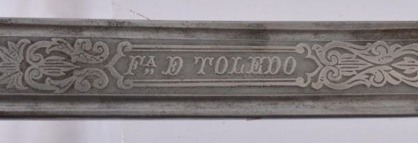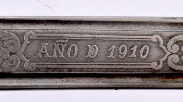 Mexican Revolution Army General sword with Lionhead bull horn handle. Toledo Spain made sword with extensive engraving on the blade and in excellent condition. 31 ¾ inch blade.